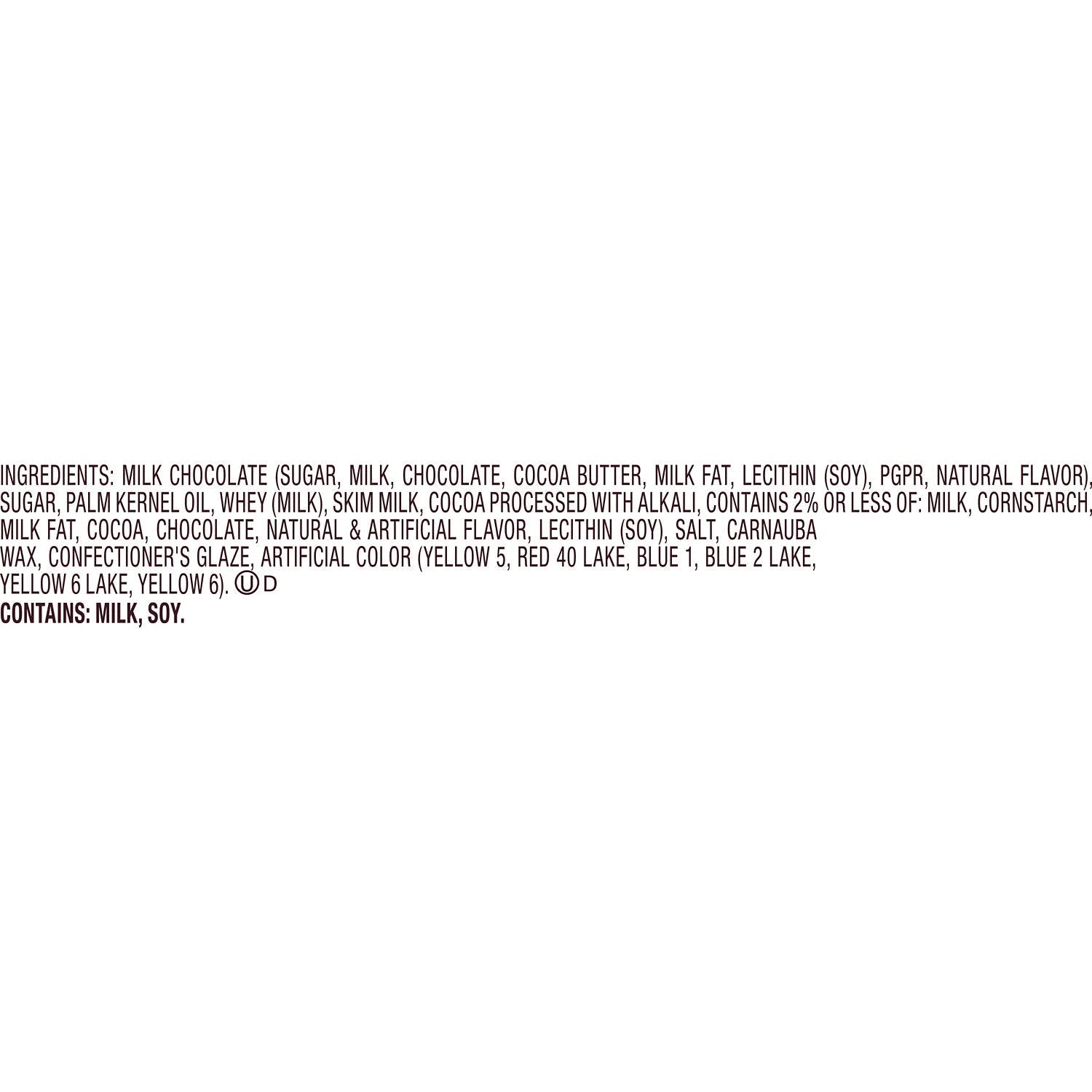 MILK CHOCOLATE (SUGAR, MILK, CHOCOLATE, COCOA BUTTER, MILK FAT, LECITHIN (SOY), PGPR, NATURAL FLAVOR), SUGAR, PALM KERNEL OIL, WHEY (MILK), SKIM MILK, COCOA PROCESSED WITH ALKALI, CONTAINS 2% OR LESS OF: MILK, CORNSTARCH, MILK FAT, COCOA, CHOCOLATE, NATURAL & ARTIFICIAL FLAVOR, LECITHIN (SOY), SALT, CARNAUBA WAX, CONFECTIONER'S GLAZE, ARTIFICIAL COLOR (YELLOW 5, RED 40 LAKE, BLUE 1, BLUE 2 LAKE, YELLOW 6 LAKE, YELLOW 6)./div>