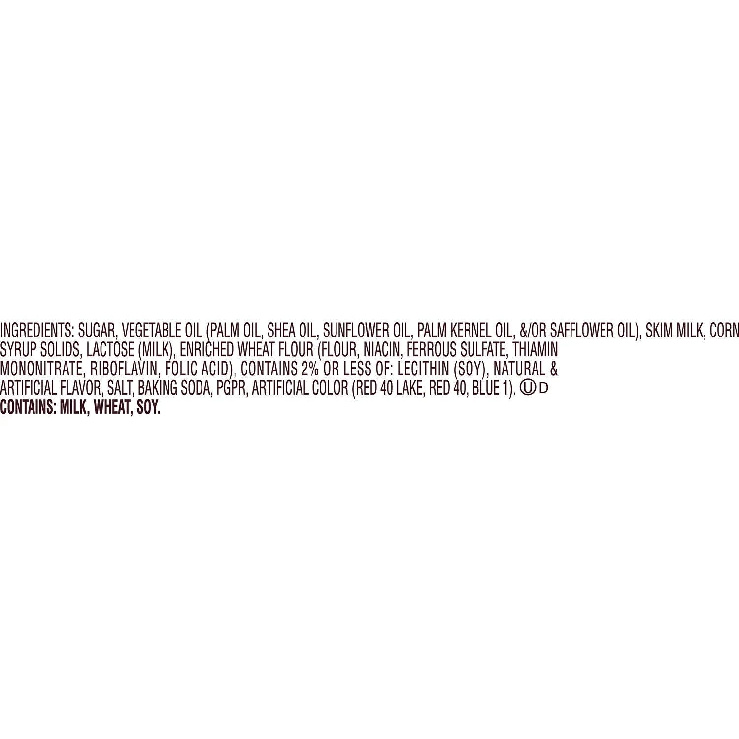 SUGAR, VEGETABLE OIL (PALM OIL, SHEA OIL, SUNFLOWER OIL, PALM KERNEL OIL, &/OR SAFFLOWER OIL), SKIM MILK, CORN SYRUP SOLIDS, LACTOSE (MILK), ENRICHED WHEAT FLOUR (FLOUR, NIACIN, FERROUS SULFATE, THIAMIN MONONITRATE, RIBOFLAVIN, FOLIC ACID), CONTAINS 2% OR LESS OF: LECITHIN (SOY), NATURAL & ARTIFICIAL FLAVOR, SALT, BAKING SODA, PGPR, ARTIFICIAL COLOR (RED 40 LAKE, RED 40, BLUE 1)./div>