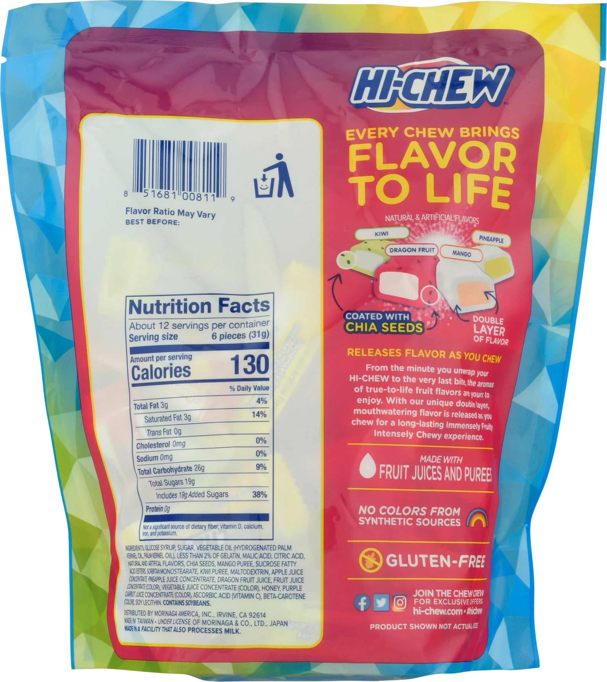 - Contains chewy pieces of individually-wrapped Tropical HI-CHEW candy. Each piece is made with real fruit juices and purees!