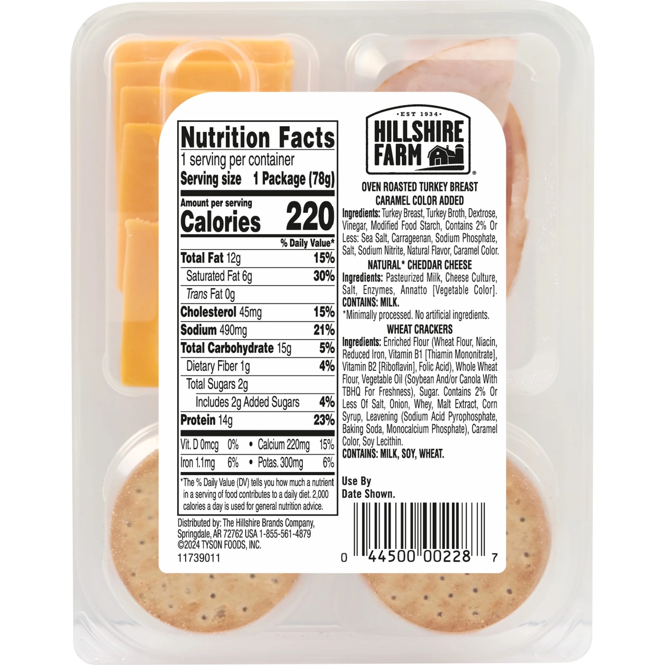 - One single serve Hillshire Farm Snack Pack Oven Roasted Turkey Breast, Cheddar Cheese and Wheat Crackers