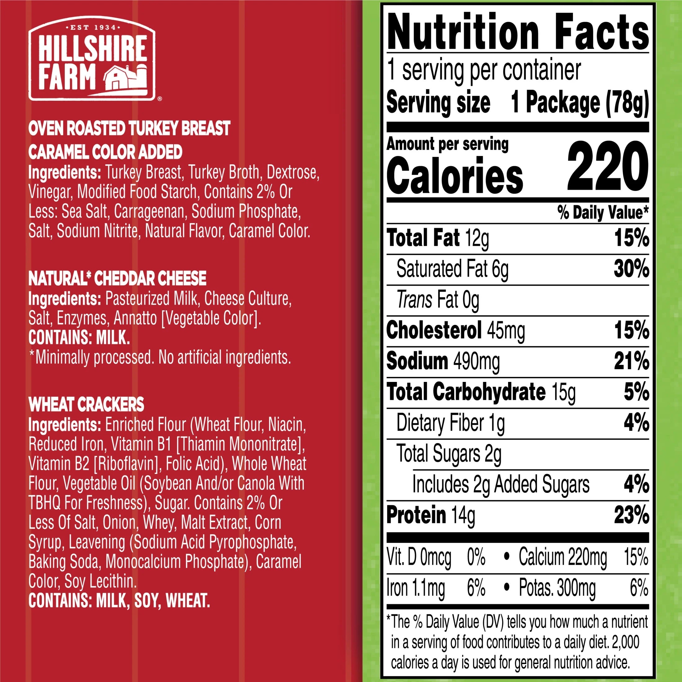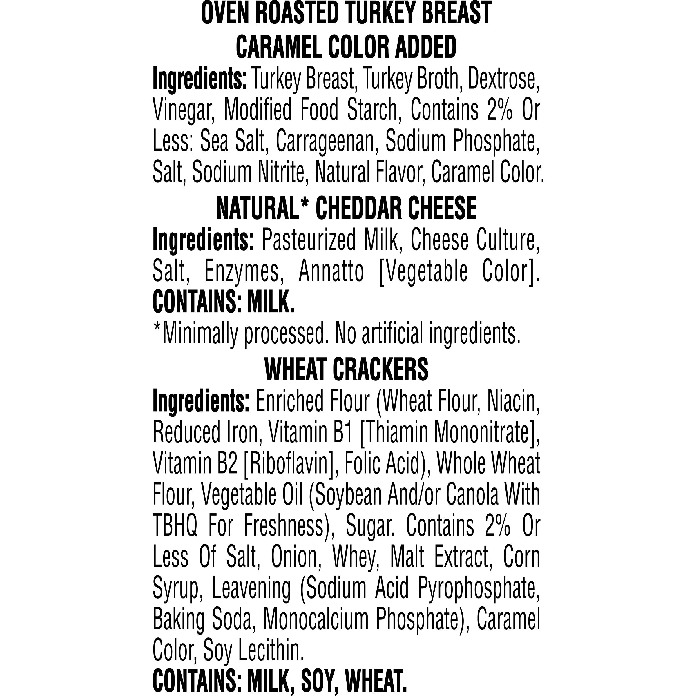 Oven Roasted Turkey Breast-Caramel Color Added Ingredients: Turkey Breast, Turkey Broth, Dextrose, Vinegar, Modified Food Starch, Contains 2% Or Less: Sea Salt, Carrageenan, Sodium Phosphate, Salt, Sodium Nitrite, Natural Flavor, Caramel Color. Natural* Cheddar Cheese Ingredients: Pasteurized Milk, Cheese Culture, Salt, Enzymes, Annatto [Vegetable Color]. *Minimally Processed. No Artificial Ingredients. Wheat Crackers Ingredients: Enriched Flour (Wheat Flour, Niacin, Reduced Iron, Vitamin B1 [Thiamin Mononitrate], Vitamin B2 [Riboflavin], Folic Acid), Whole Wheat Flour, Vegetable Oil (Soybean And/Or Canola With Tbhq For Freshness), Sugar. Contains 2% Or Less Of Salt, Onion, Whey, Malt Extract, Corn Syrup, Leavening (Sodium Acid Pyrophosphate, Baking Soda, Monocalcium Phosphate), Caramel Color, Soy Lecithin./div>
