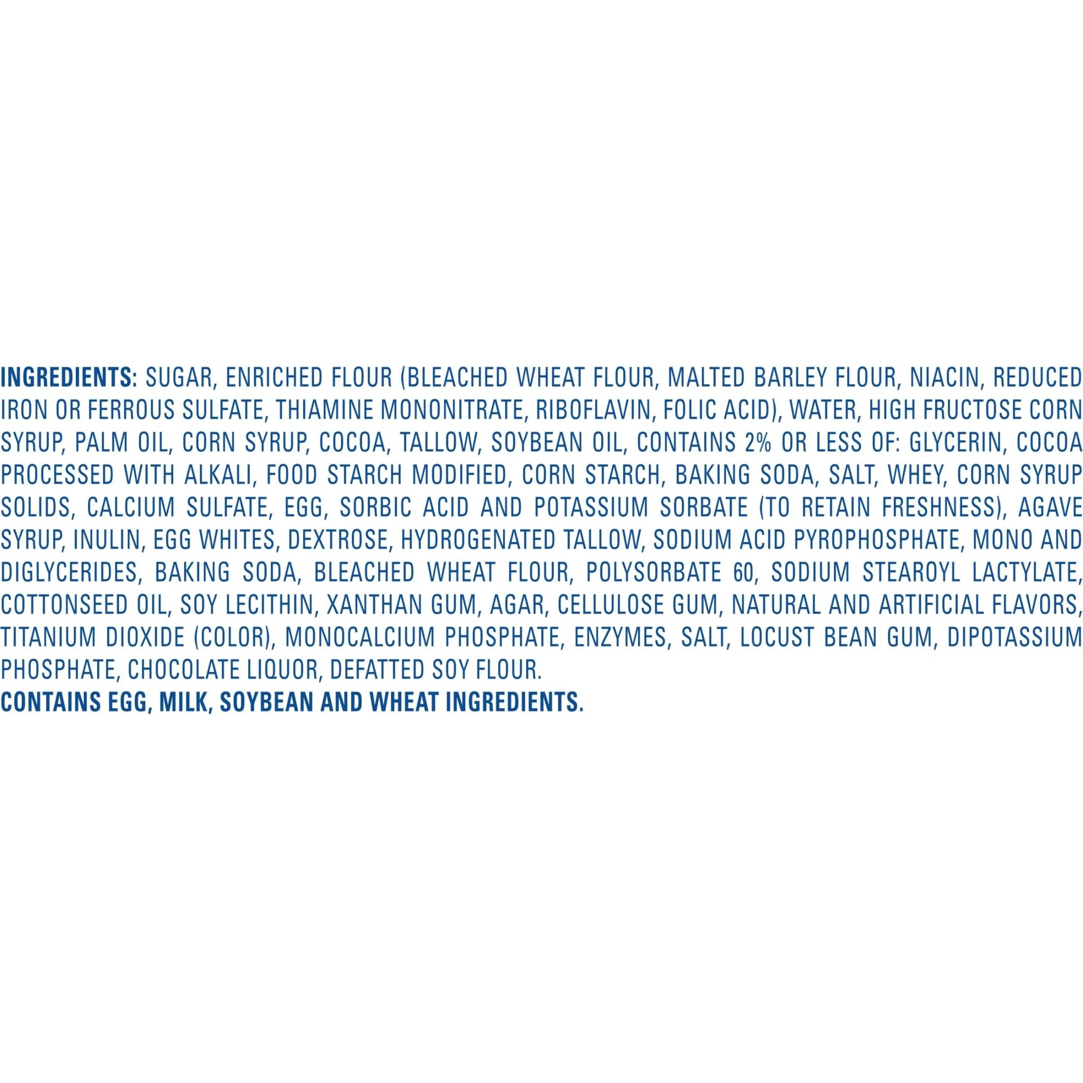 Sugar, Enriched Flour (Bleached Wheat Flour, Malted Barley Flour, Niacin, Reduced Iron Or Ferrous Sulfate, Thiamine Mononitrate, Riboflavin, Folic Acid), Water, High Fructose Corn Syrup, Palm Oil, Corn Syrup, Cocoa, Tallow, Soybean Oil, Contains 2% Or Less Of: Glycerin, Cocoa Processed With Alkali, Food Starch Modified, Corn Starch, Baking Soda, Salt, Whey, Corn Syrup Solids, Calcium Sulfate, Egg, Sorbic Acid And Potassium Sorbate (To Retain Freshness), Agave Syrup, Inulin, Egg Whites, Dextrose, Hydrogenated Tallow, Sodium Acid Pyrophosphate, Mono And Diglycerides, Baking Soda, Bleached Wheat Flour, Polysorbate 60, Sodium Stearoyl Lactylate, Cottonseed Oil, Soy Lecithin, Xanthan Gum, Agar, Cellulose Gum, Natural And Artificial Flavors, Titanium Dioxide (Color), Monocalcium Phosphate, Enzymes, Salt, Locust Bean Gum, Dipotassium Phosphate, Chocolate Liquor, Defatted Soy Flour./div>