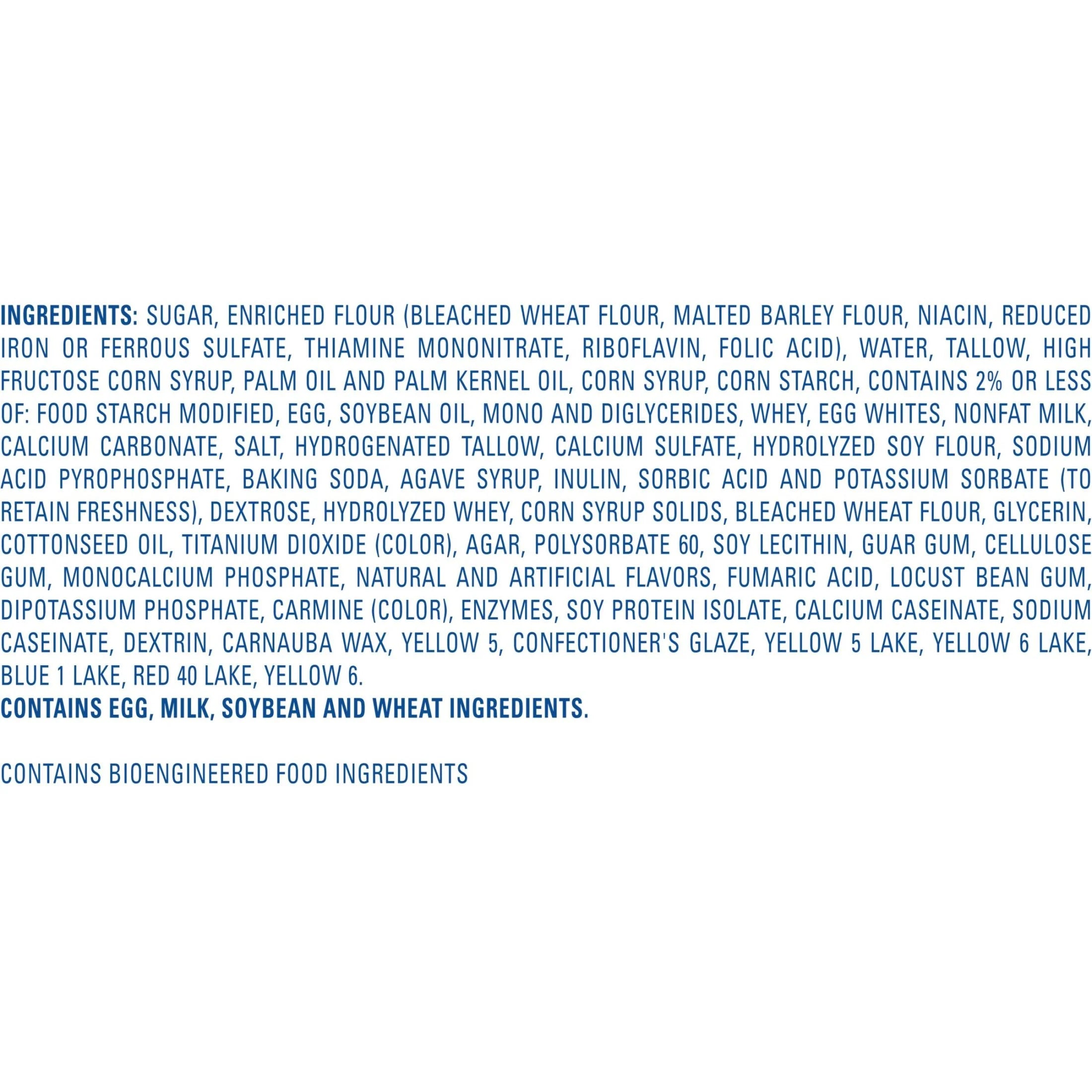 Sugar, Enriched Flour (Bleached Wheat Flour, Malted Barley Flour, Niacin, Reduced Iron Or Ferrous Sulfate, Thiamine Mononitrate, Riboflavin, Folic Acid), Water, Tallow, High Fructose Corn Syrup, Palm Oil And Palm Kernel Oil, Corn Syrup, Corn Starch, Contains 2% Or Less Of: Food Starch Modified, Egg, Soybean Oil, Mono And Diglycerides, Whey, Egg Whites, Nonfat Milk, Calcium Carbonate, Salt, Hydrogenated Tallow, Calcium Sulfate, Hydrolyzed Soy Flour, Sodium Acid Pyrophosphate, Baking Soda, Agave Syrup, Inulin, Sorbic Acid And Potassium Sorbate (To Retain Freshness), Dextrose, Hydrolyzed Whey, Corn Syrup Solids, Bleached Wheat Flour, Glycerin, Cottonseed Oil, Titanium Dioxide (Color), Agar, Polysorbate 60, Soy Lecithin, Guar Gum, Cellulose Gum, Monocalcium Phosphate, Natural And Artificial Flavors, Fumaric Acid, Locust Bean Gum, Dipotassium Phosphate, Carmine (Color), Enzymes, Soy Protein Isolate, Calcium Caseinate, Sodium Caseinate, Dextrin, Carnauba Wax, Yellow 5, Confectioner's Glaze, Yellow 5 Lake, Yellow 6 Lake, Blue 1 Lake, Red 40 Lake, Yellow 6./div>