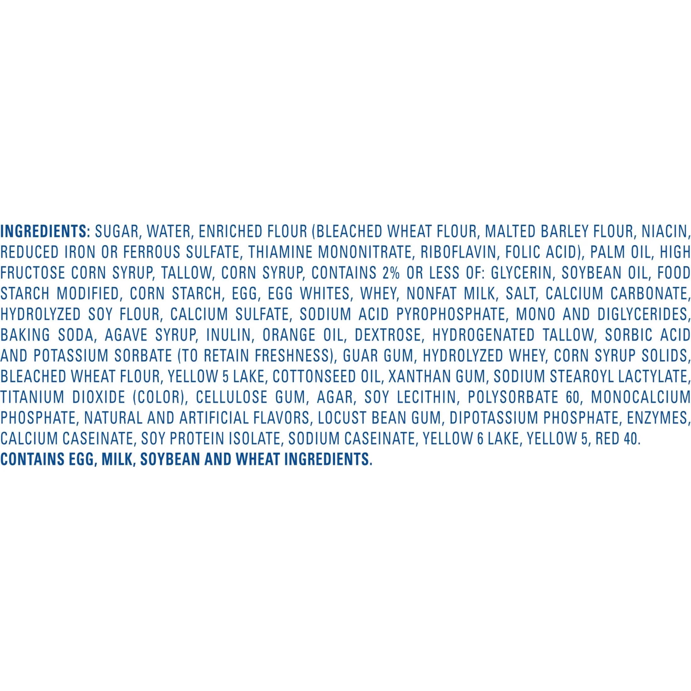 Sugar, Water, Enriched Flour (Bleached Wheat Flour, Malted Barley Flour, Niacin, Reduced Iron Or Ferrous Sulfate, Thiamine Mononitrate, Riboflavin, Folic Acid), Palm Oil, High Fructose Corn Syrup, Tallow, Corn Syrup, Contains 2% Or Less Of: Glycerin, Soybean Oil, Food Starch Modified, Corn Starch, Egg, Egg Whites, Whey, Nonfat Milk, Salt, Calcium Carbonate, Hydrolyzed Soy Flour, Calcium Sulfate, Sodium Acid Pyrophosphate, Mono And Diglycerides, Baking Soda, Agave Syrup, Inulin, Orange Oil, Dextrose, Hydrogenated Tallow, Sorbic Acid And Potassium Sorbate (To Retain Freshness), Guar Gum, Hydrolyzed Whey, Corn Syrup Solids, Bleached Wheat Flour, Yellow 5 Lake, Cottonseed Oil, Xanthan Gum, Sodium Stearoyl Lactylate, Titanium Dioxide (Color), Cellulose Gum, Agar, Soy Lecithin, Polysorbate 60, Monocalcium Phosphate, Natural And Artificial Flavors, Locust Bean Gum, Dipotassium Phosphate, Enzymes, Calcium Caseinate, Soy Protein Isolate, Sodium Caseinate, Yellow 6 Lake, Yellow 5, Red 40./div>