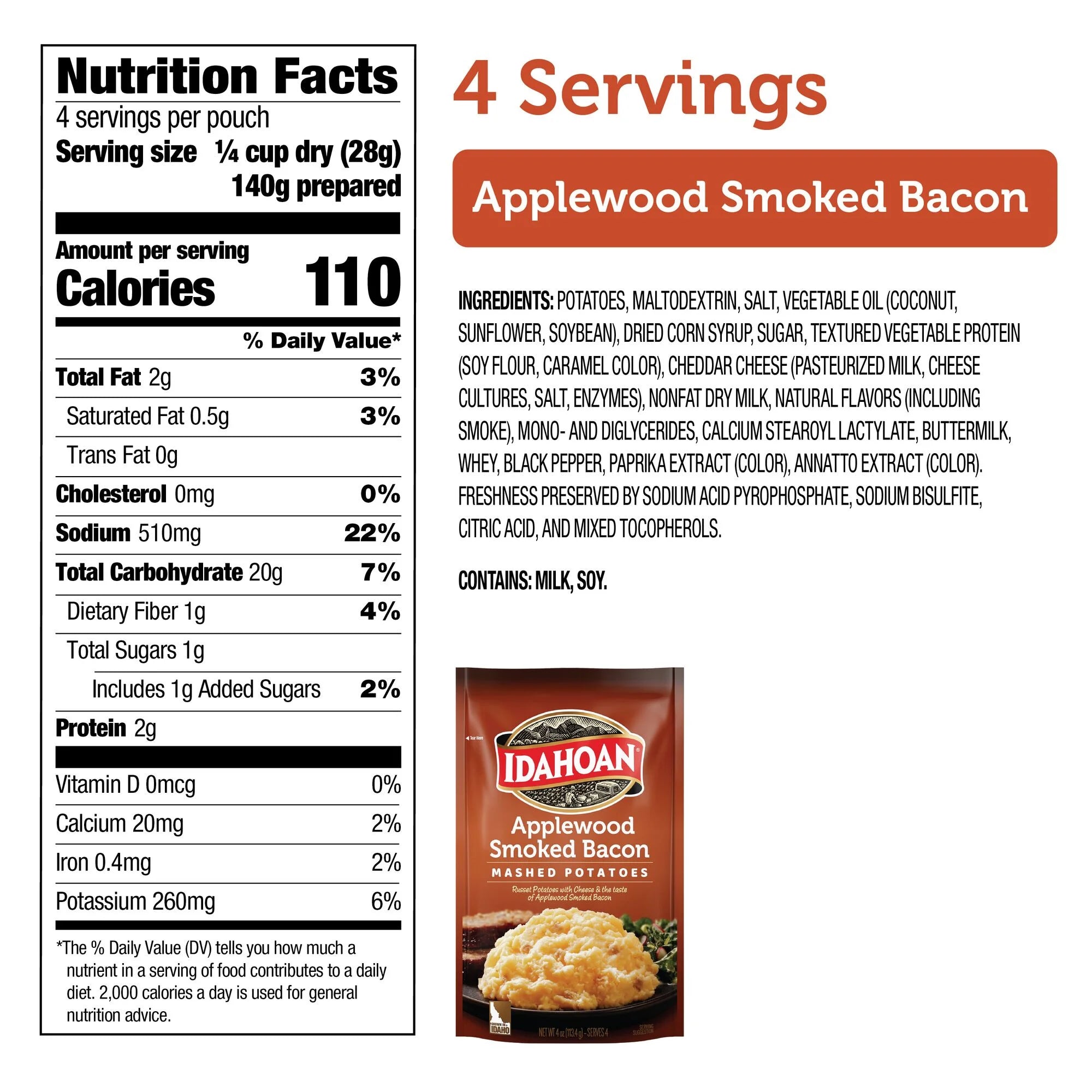 Experience the rich, smoky flavor of Idahoan Applewood Smoked Bacon Mashed Potatoes. This convenient 4 oz pouch delivers a creamy, smooth texture and the taste of real bacon blended with hearty Idaho potatoes. Perfect as a quick side for family meals or as a flavorful addition to lunch or dinner. Idahoan Applewood Smoked Bacon Mashed Potatoes are easy to prepare and ideal for busy weeknights or holiday gatherings.