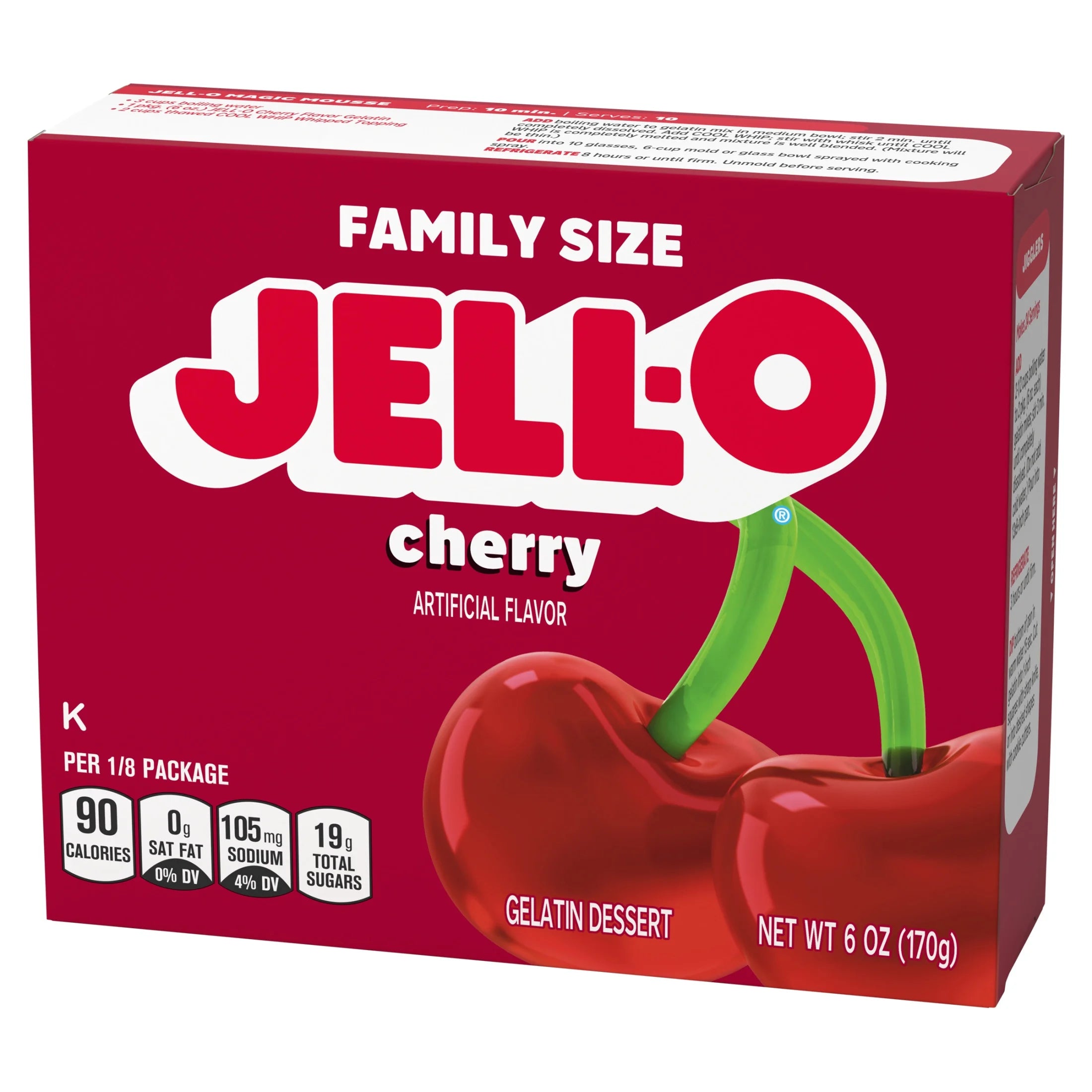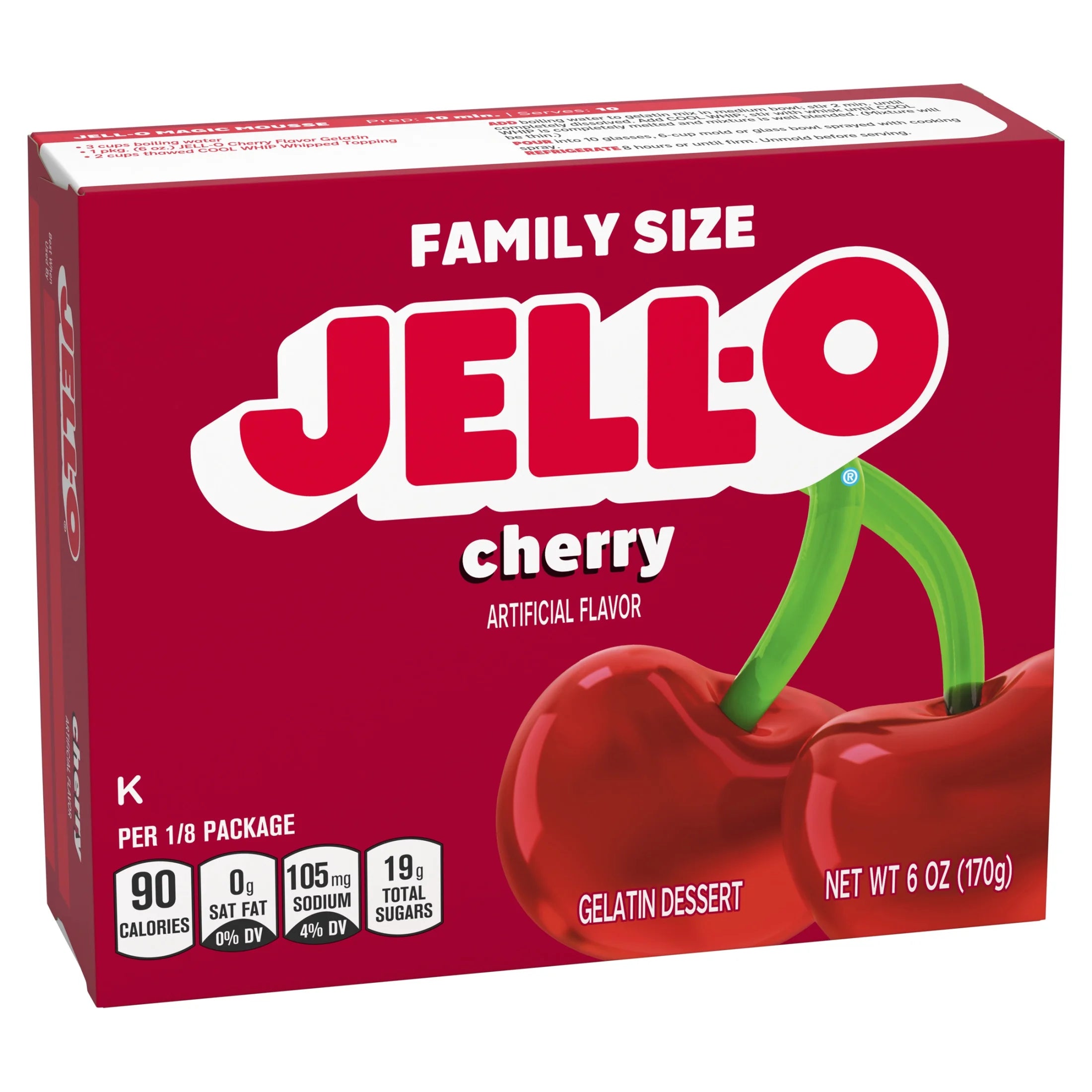 - One 6 oz family sized box of Jell-O Cherry Artificially Flavored Gelatin Dessert Mix
