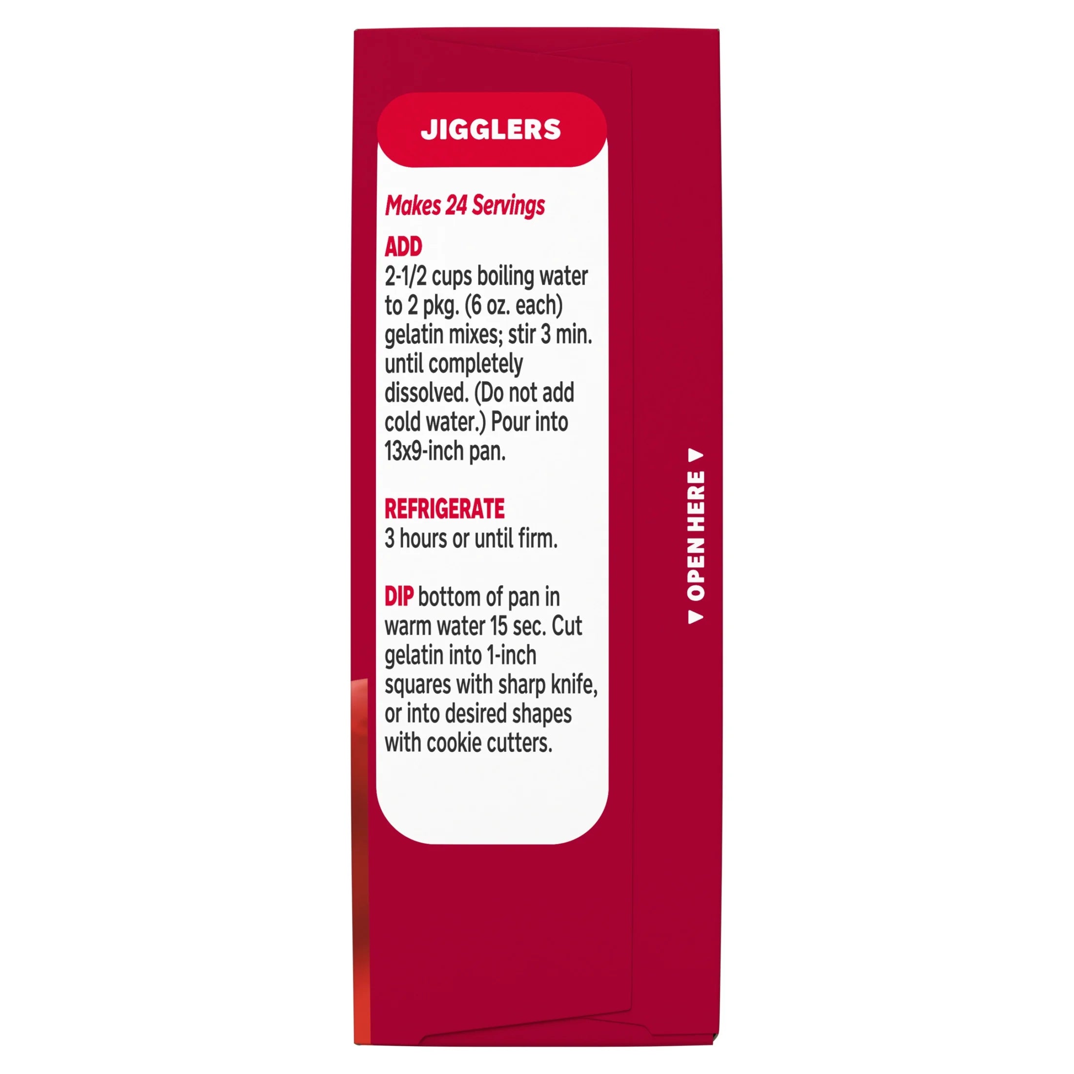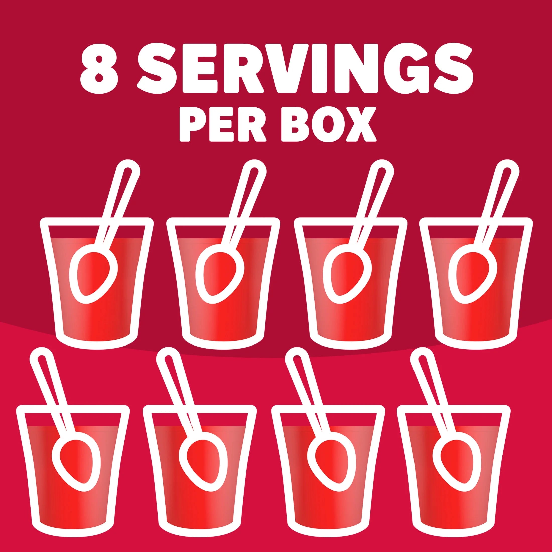 Snack happy. Jell-O Cherry Artificially Flavored Gelatin Dessert Mix lets you add some wonder to your day with a delicious snack. Spoon up a smile with our artificially flavored cherry Jell-O gelatin that contains 90 calories per serving. Our colorful, jiggly treat is perfect for everyday snacking or special occasions with family and friends. Additionally, our gelatin dessert mix is a versatile ingredient for creating desserts like poke cakes, parfaits, pretzel salads, rainbow layer cakes and more. Our artificially flavored cherry gelatin dessert is easy to prepare. Simply add 2 cups boiling water to the gelatin mix, stir for 2 minutes until completely dissolved, stir in 2 cups cold water, then refrigerate for 4 hours or until firm. Each family size Jell-O gelatin dessert mix is individually packaged in a 6-ounce sealed pouch and makes 8, 1/2-cup servings.