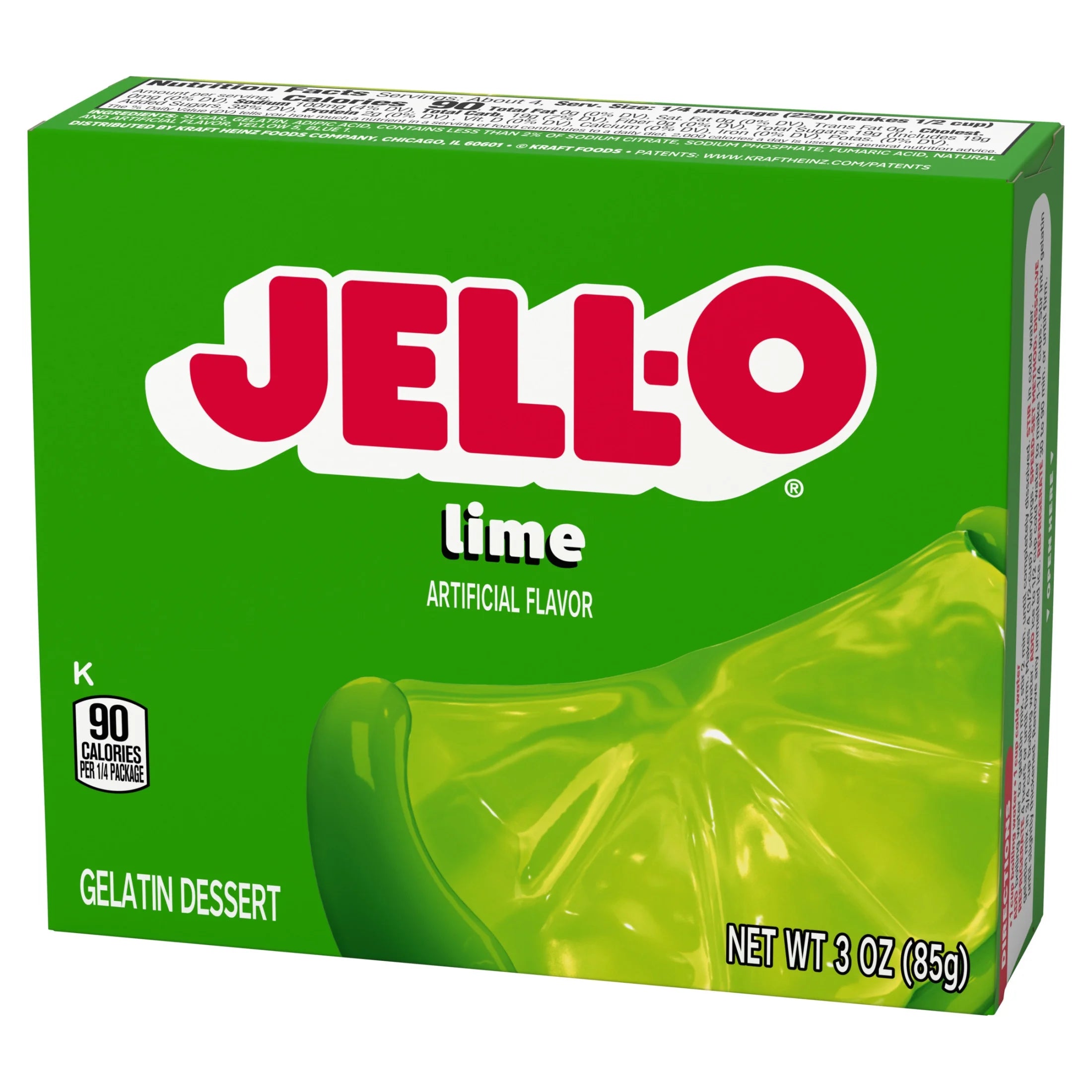 Snack happy. Jell-O Lime Artificially Flavored Gelatin Dessert Mix lets you add some wonder to your day with a delicious snack. Spoon up a smile with our artificially flavored lime Jell-O gelatin that contains 90 calories per serving. Our colorful, jiggly treat is perfect for everyday snacking or special occasions with family and friends. Additionally, our gelatin dessert mix is a versatile ingredient for creating desserts like poke cakes, parfaits, pretzel salads, rainbow layer cakes and more. Our artificially flavored lime gelatin dessert is easy to prepare. Simply add 1 cup boiling water to the gelatin mix, stir for 2 minutes until completely dissolved, stir in 1 cup cold water, then refrigerate for 4 hours or until firm. Each Jell-O gelatin dessert mix is individually packaged in a 3-ounce sealed pouch and makes 4, 1/2-cup servings.