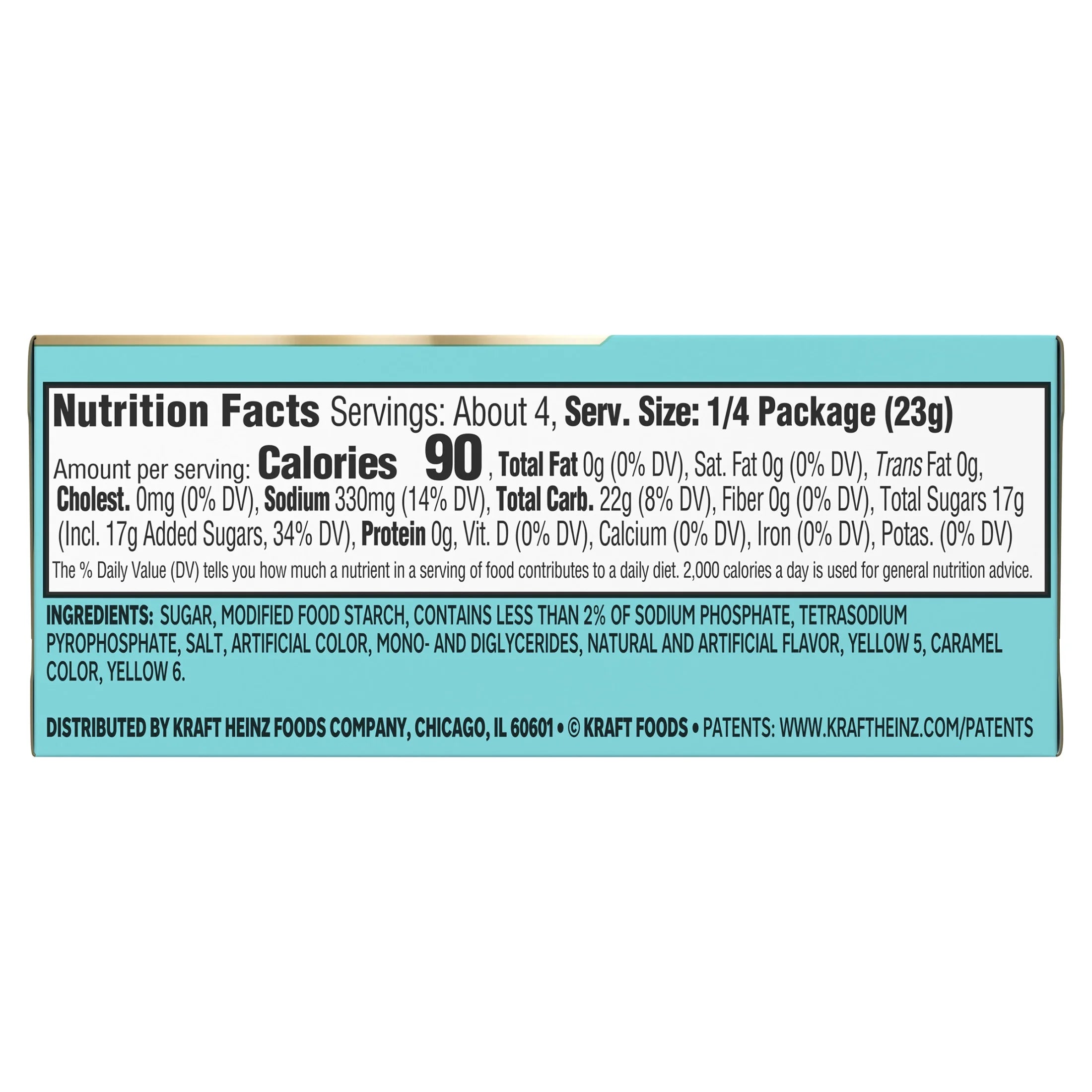 SUGAR, MODIFIED FOOD STARCH, CONTAINS LESS THAN 2% OF SODIUM PHOSPHATE, TETRASODIUM PYROPHOSPHATE, SALT, ARTIFICIAL COLOR, MONO- AND DIGLYCERIDES, NATURAL AND ARTIFICIAL FLAVOR, YELLOW 5, CARAMEL COLOR, YELLOW 6./div>