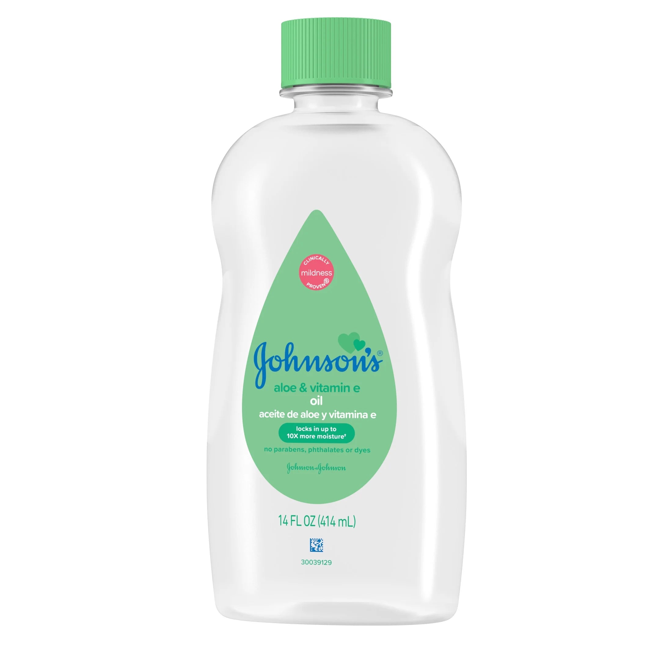 - Johnson's Baby Oil, mineral oil with Aloe Vera & Vitamin E and soothe skin from dryness
