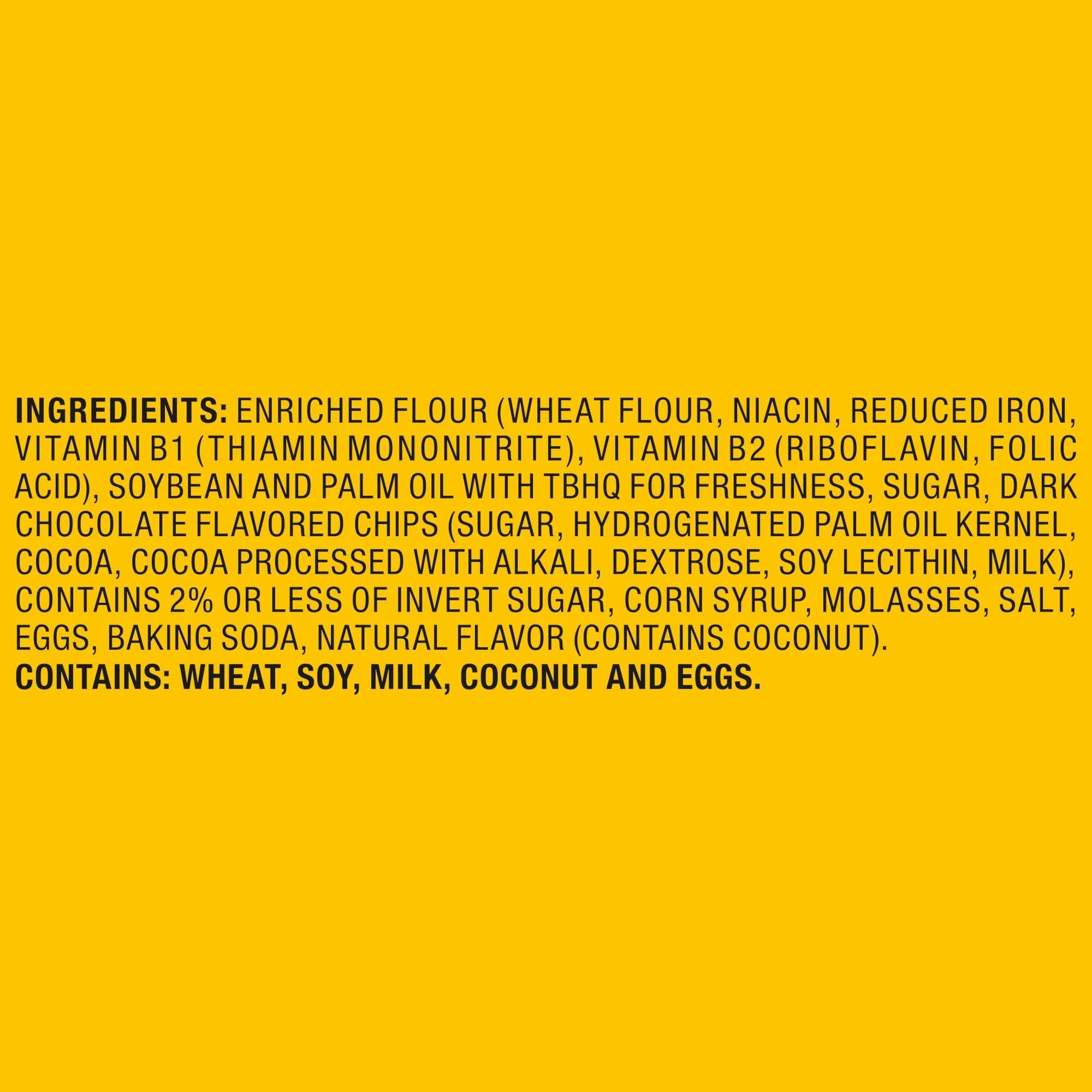 ENRICHED FLOUR (WHEAT FLOUR, NIACIN, REDUCED IRON, VITAMIN B1 (THIAMIN MONONITRITE), VITAMIN B2 (RIBOFLAVIN, FOLICACID), SOYBEAN AND PALM OIL WITH TBHQ FOR FRESHNESS, SUGAR, DARK CHOCOLATEFLAVORED CHIPS (SUGAR, HYDROGENATED PALM OIL KERNEL, COCOA, COCOA PROCESSEDWITH ALKALI, DEXTROSE, SOY LECITHIN, MILK), CONTAINS 2% OR LESS OF INVERTSUGAR, CORN SYRUP, MOLASSES, SALT, EGGS, BAKING SODA, NATURAL FLAVOR (CONTAINSCOCONUT)./div>