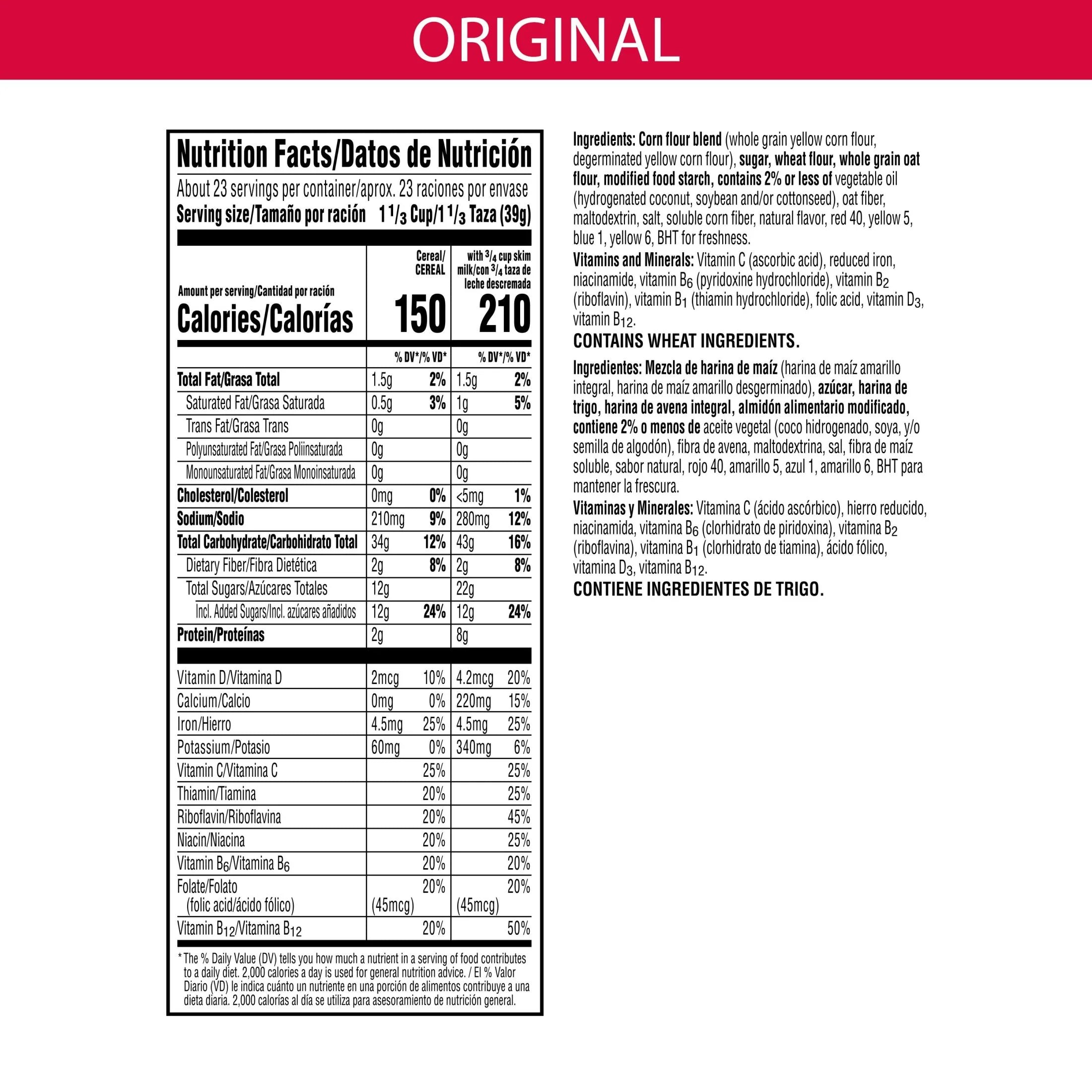 Corn Flour Blend (Whole Grain Yellow Corn Flour, Degerminated Yellow Corn Flour), Sugar, Wheat Flour, Whole Grain Oat Flour, Modified Food Starch, Contains 2% Or Less Of Vegetable Oil (Hydrogenated Coconut, Soybean And/Or Cottonseed), Oat Fiber, Maltodextrin, Salt, Soluble Corn Fiber, Natural Flavor, Red 40, Yellow 5, Blue 1, Yellow 6, Bht For Freshness. Vitamins And Minerals: Vitamin C (Ascorbic Acid), Reduced Iron, Niacinamide, Vitamin B6 (Pyridoxine Hydrochloride), Vitamin B2 (Riboflavin), Vitamin B1 (Thiamin Hydrochloride), Folic Acid, Vitamin D3, Vitamin B12./div>