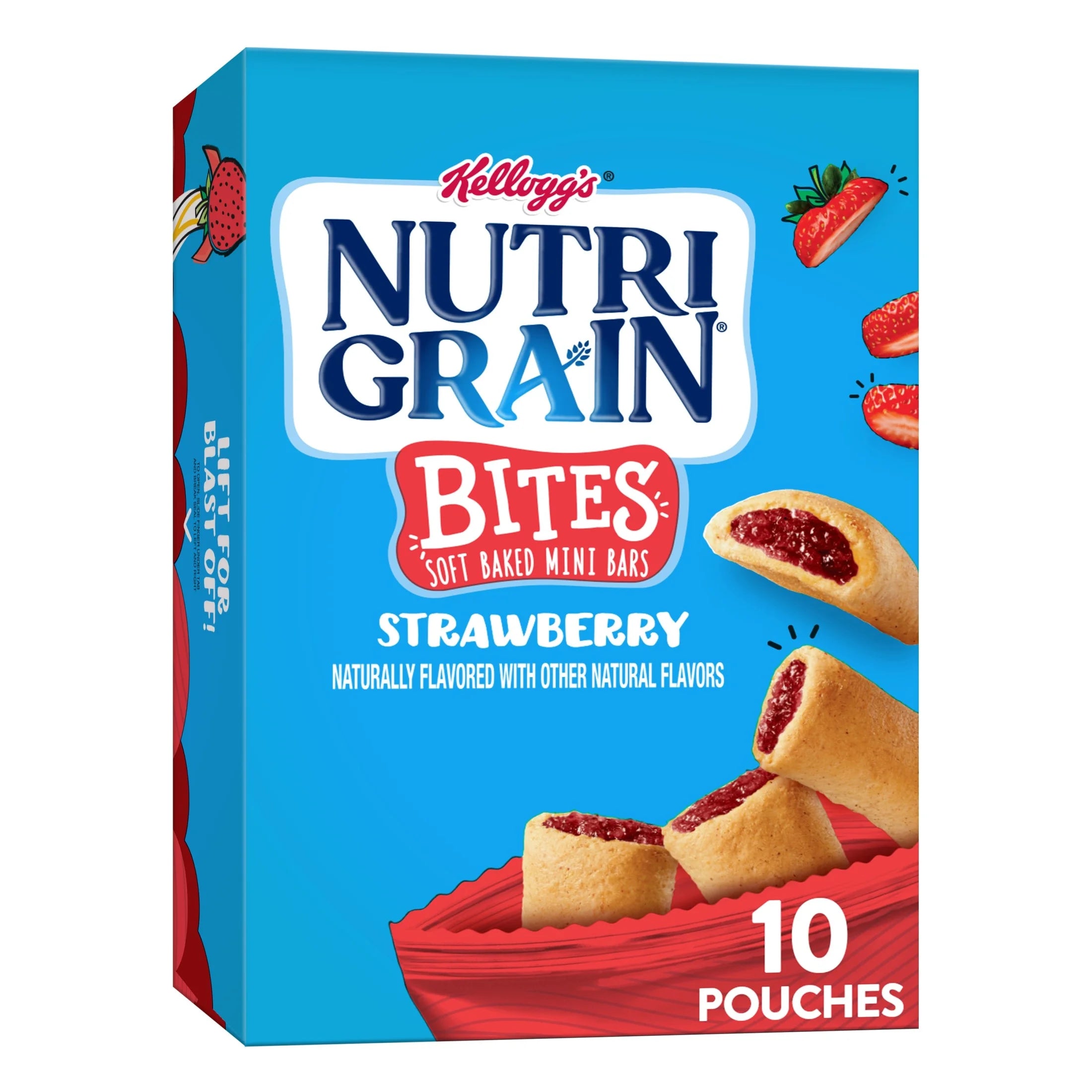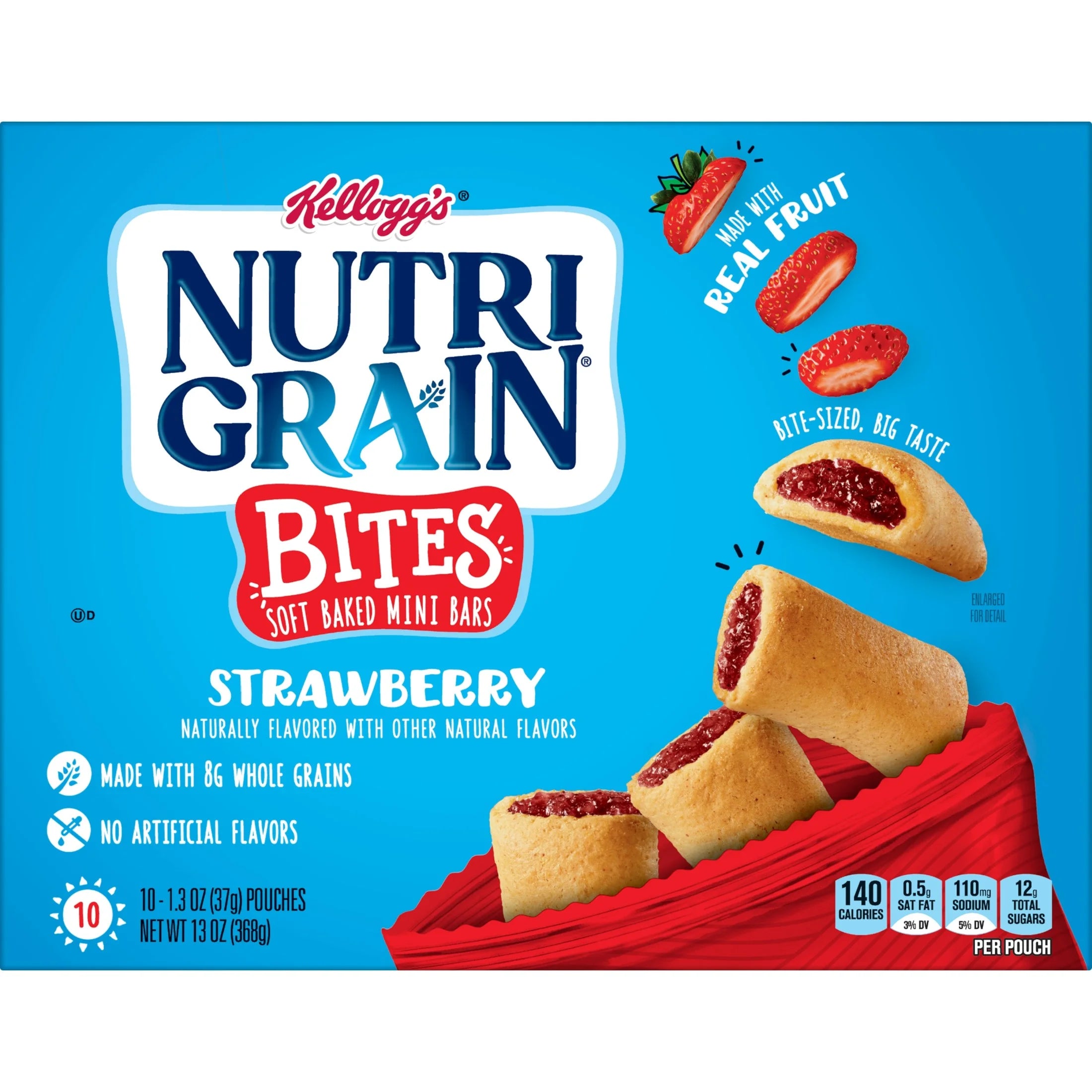 - Includes one, 13oz box containing 10, 1.3oz pouches of Nutri-Grain Bites Strawberry soft baked mini bars; Packaged for freshness and great taste