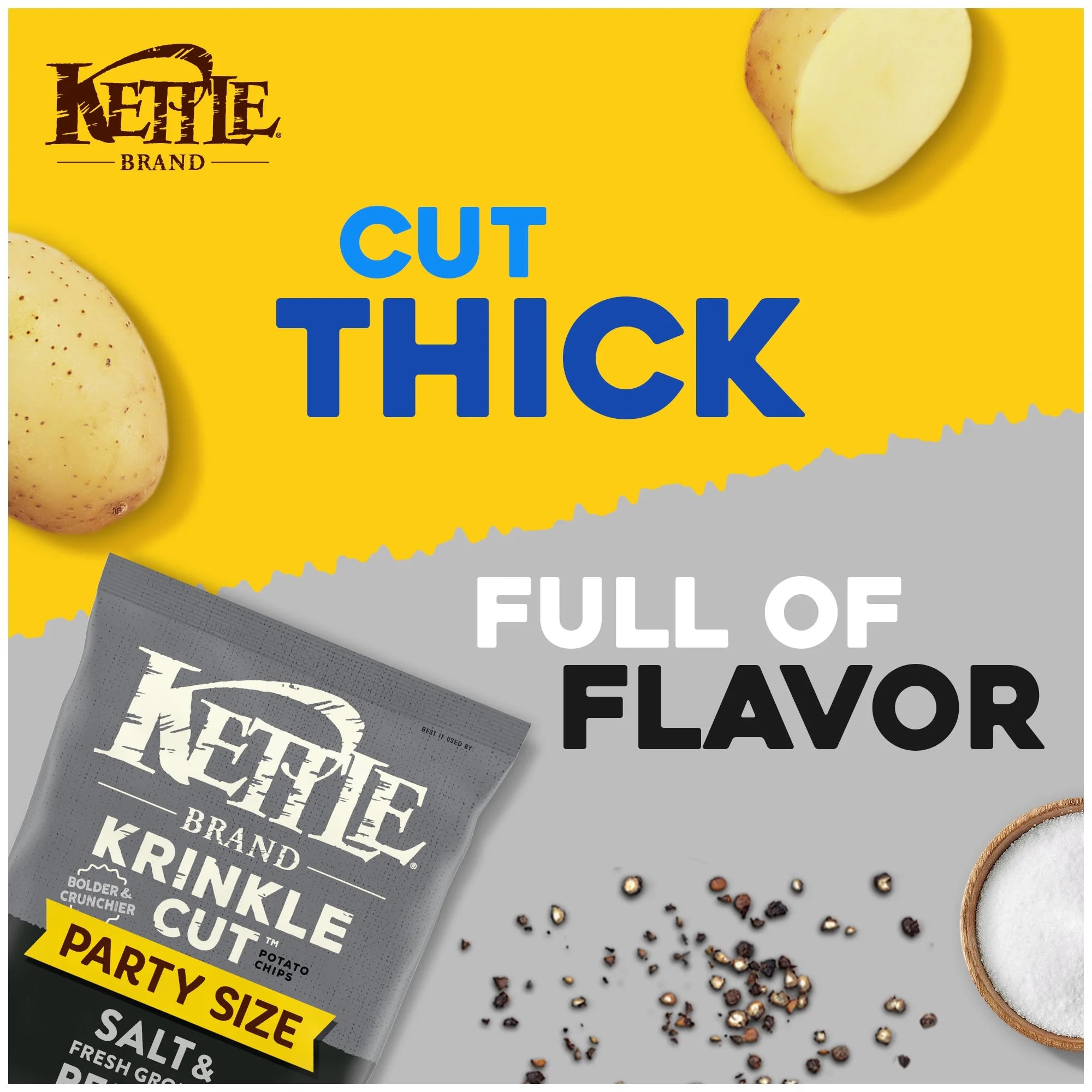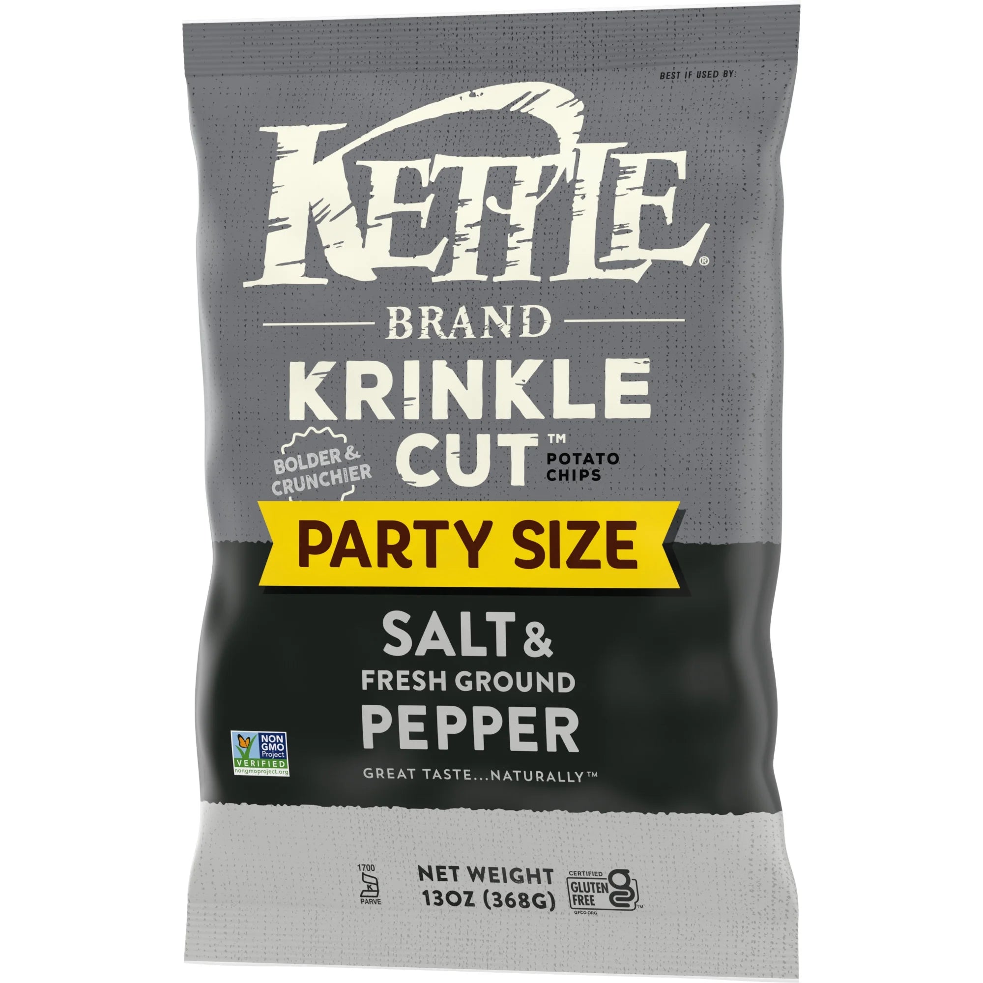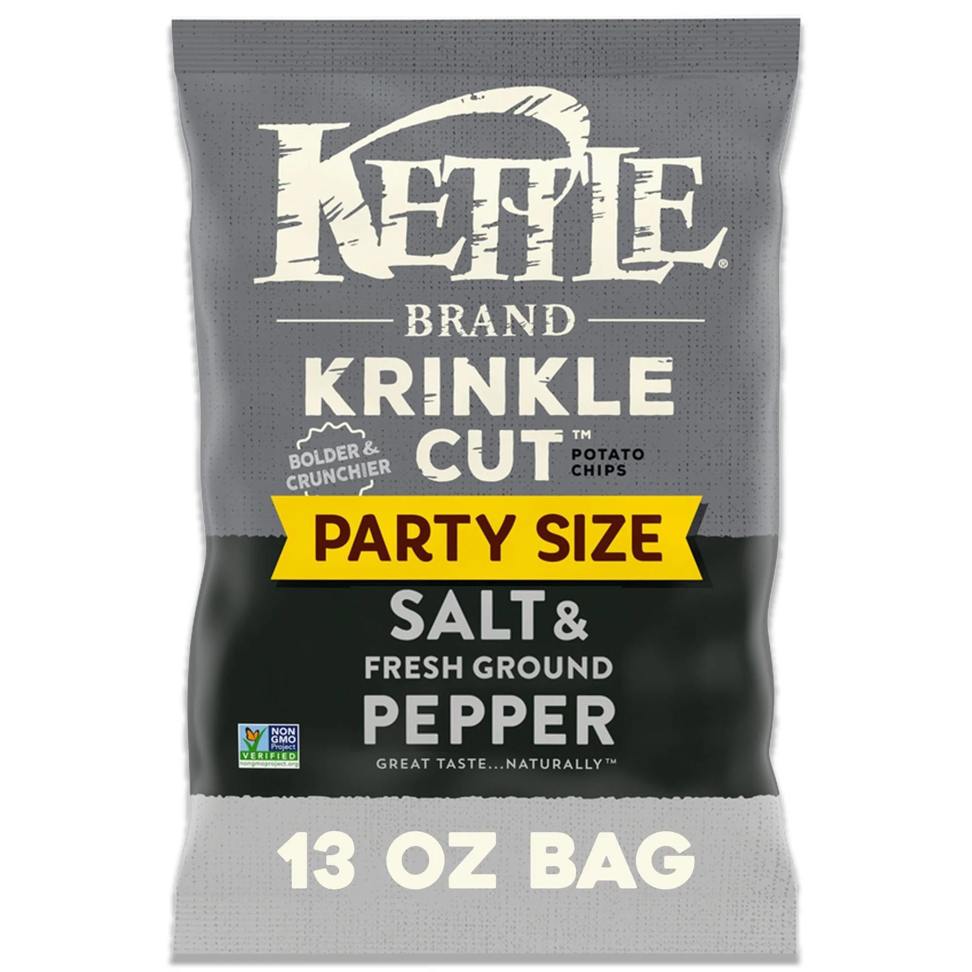 Kettle Brand Krinkle Cut Salt & Ground Pepper kettle chips are sliced thicker than our classic kettle chips for an extra crunch. And their deep ridges hold all the extreme seasoning they need. Each potato chip is sprinkled with a much-loved combo: a kiss of salt and the kick of ground pepper. On top of that, they follow Our Natural Promise to be Non-GMO Project Verified and Certified Gluten-Free. So go ahead, experience the enjoyment straight out of the bag. It takes pretty high standards to achieve Kettle Brand chips’ amazing crunch and flavor. Kettle Brand chips always deliver on taste because they're made from quality ingredients and the perfect blend of seasonings. When you open a bag of Kettle Brand Krinkle Cut potato chips, you know you're getting incredible quality made with authentic recipes by real people who take real care with what they do. This 13-ounce party size bag of chips is great for parties, tailgates, and other gatherings. Kettle Brand Krinkle Cut potato chips. Extra in a good way Shelf-stable product.