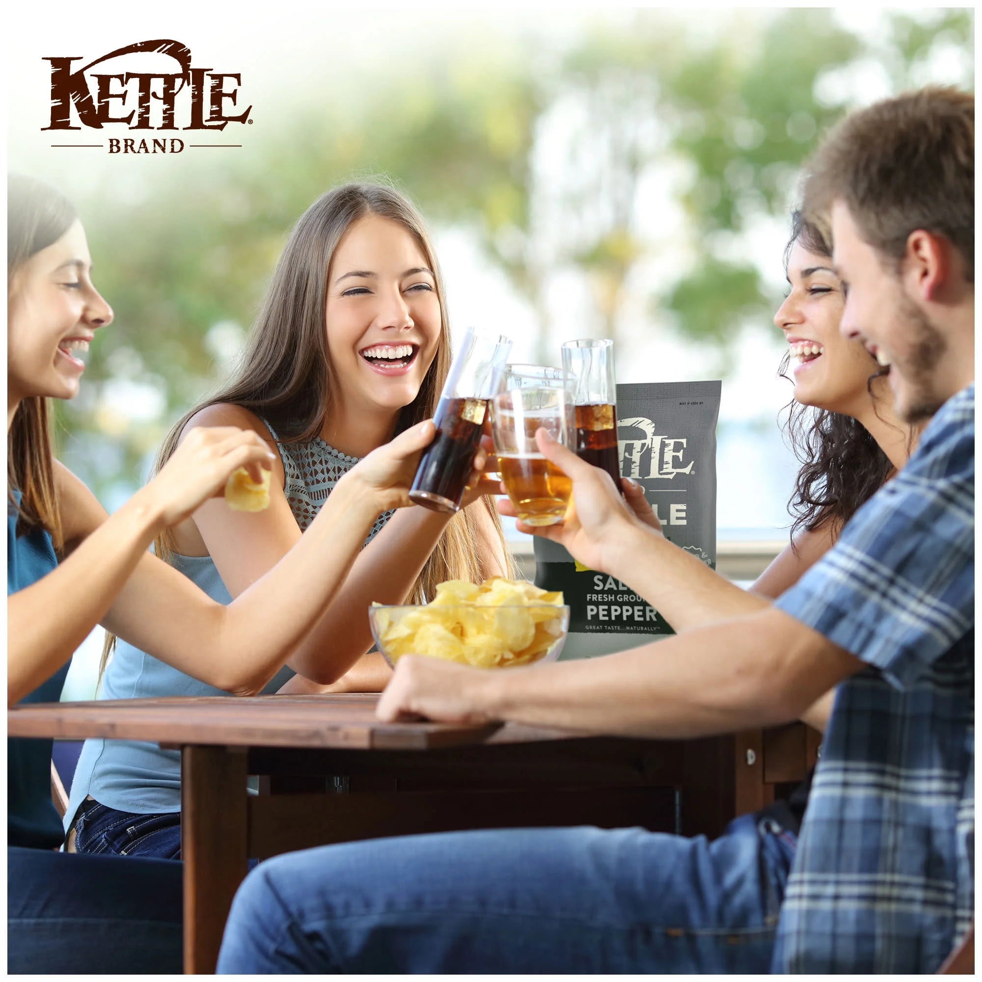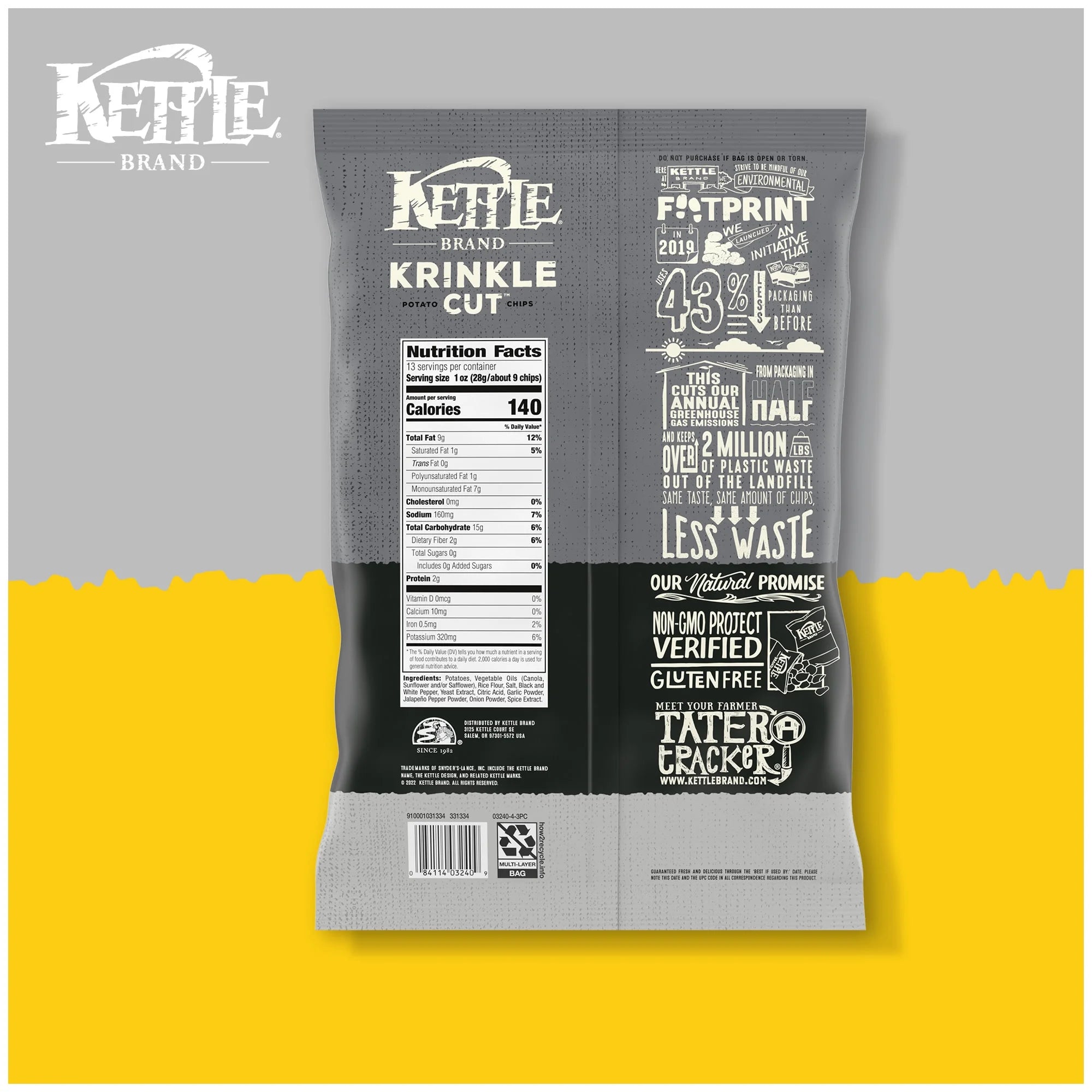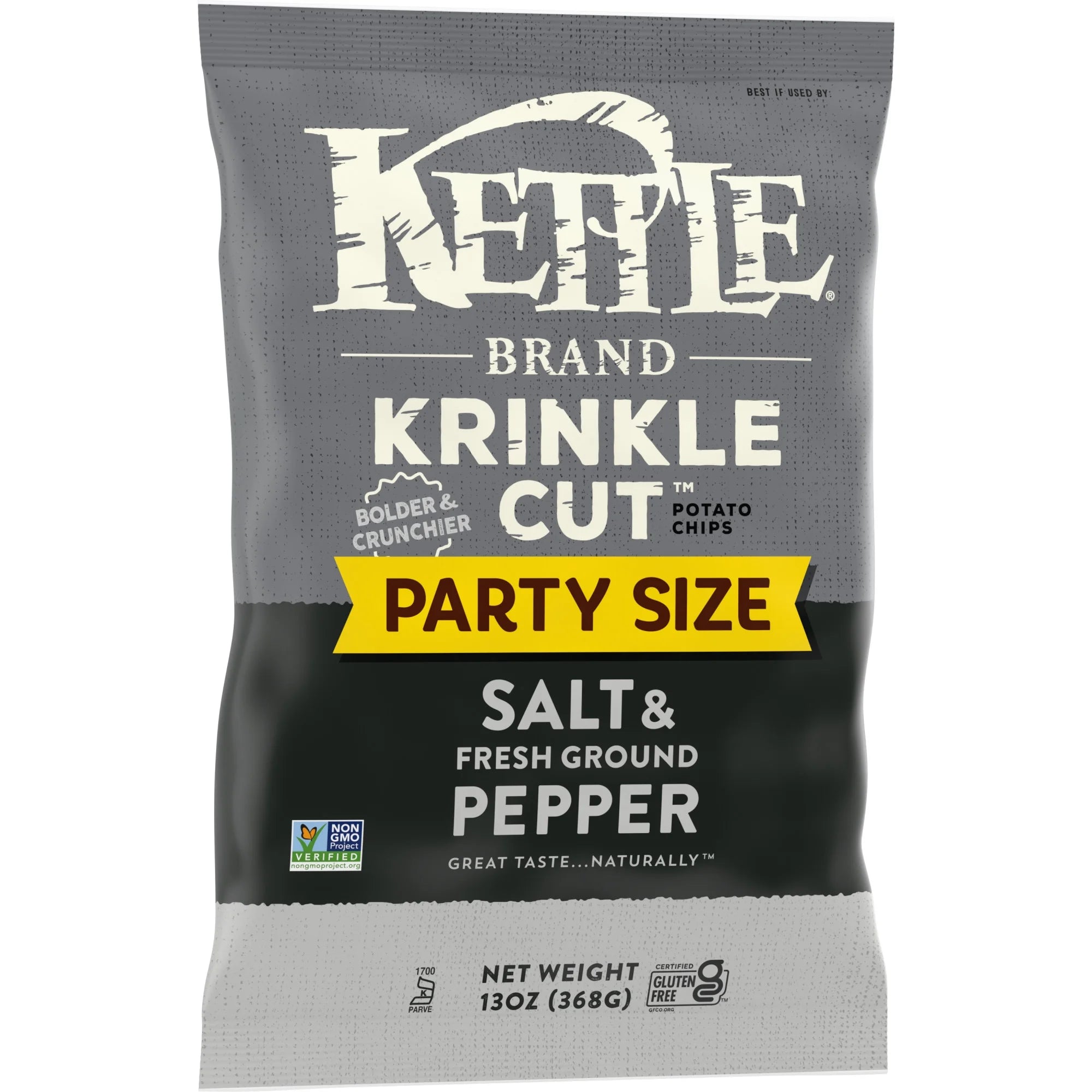 Kettle Brand Krinkle Cut Salt & Ground Pepper kettle chips are sliced thicker than our classic kettle chips for an extra crunch. And their deep ridges hold all the extreme seasoning they need. Each potato chip is sprinkled with a much-loved combo: a kiss of salt and the kick of ground pepper. On top of that, they follow Our Natural Promise to be Non-GMO Project Verified and Certified Gluten-Free. So go ahead, experience the enjoyment straight out of the bag. It takes pretty high standards to achieve Kettle Brand chips’ amazing crunch and flavor. Kettle Brand chips always deliver on taste because they're made from quality ingredients and the perfect blend of seasonings. When you open a bag of Kettle Brand Krinkle Cut potato chips, you know you're getting incredible quality made with authentic recipes by real people who take real care with what they do. This 13-ounce party size bag of chips is great for parties, tailgates, and other gatherings. Kettle Brand Krinkle Cut potato chips. Extra in a good way Shelf-stable product.