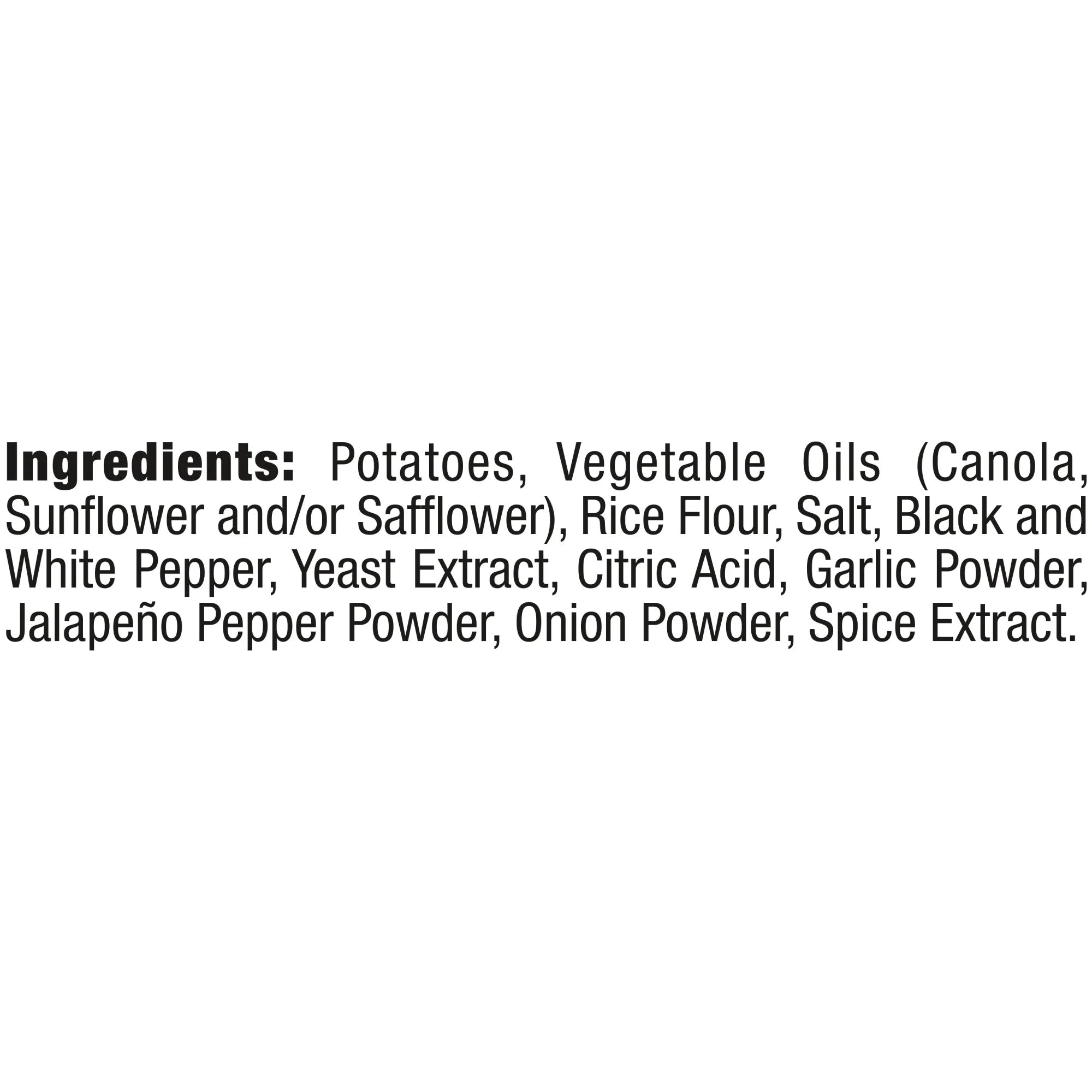 Ingredients: Potatoes, Vegetable Oils (Canola, Sunflower And/Or Safflower), Rice Flour, Salt, Black And White Pepper, Yeast Extract, Citric Acid, Garlic Powder, JalapeãO Pepper Powder, Onion Powder, Spice Extract./div>