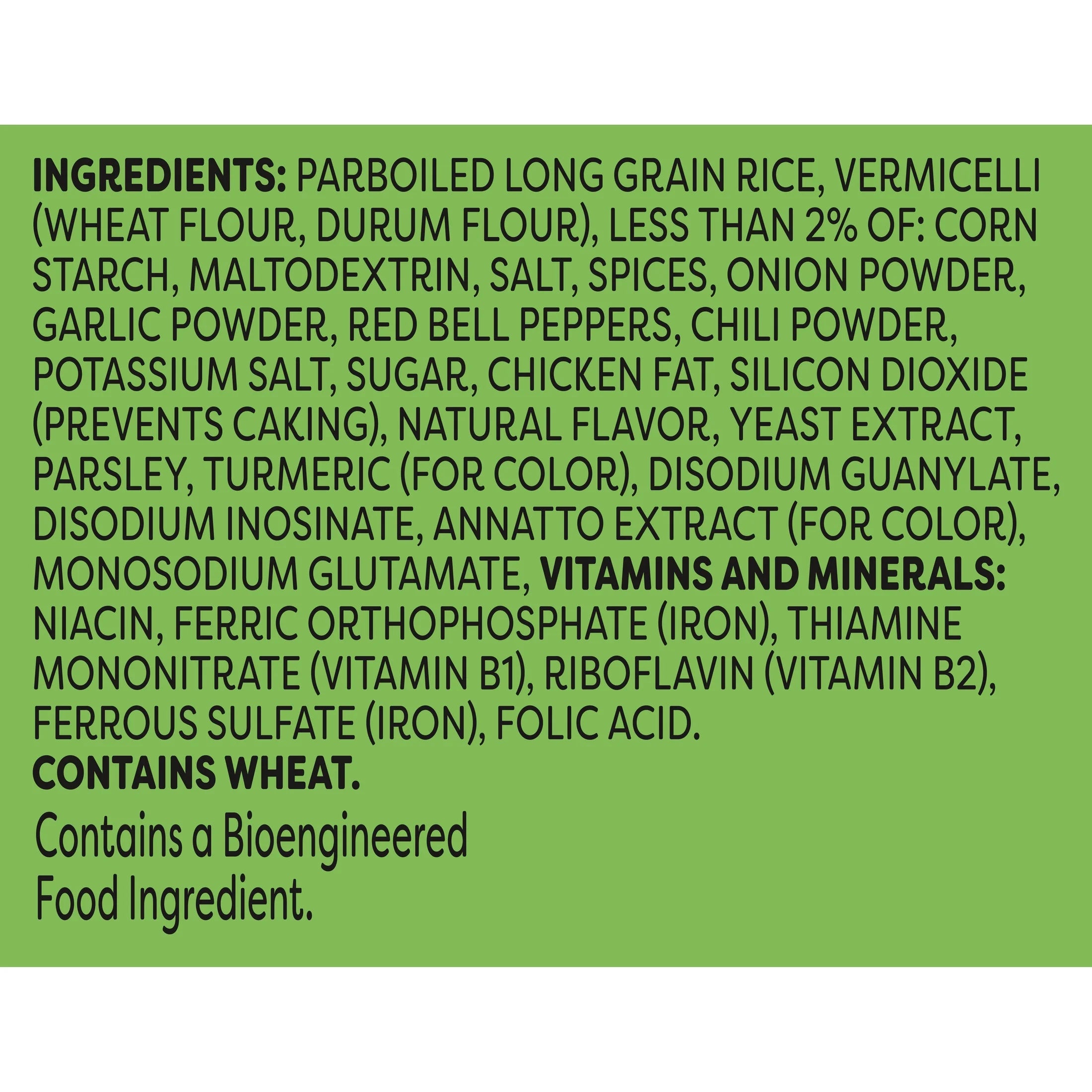 INGREDIENTS: PARBOILED LONG GRAIN RICE, VERMICELLI (WHEAT FLOUR, DURUM FLOUR), LESS THAN 2% OF: CORN STARCH, MALTODEXTRIN, SALT, SPICES, ONION POWDER, GARLIC POWDER, RED BELL PEPPERS, CHILI POWDER, POTASSIUM SALT, SUGAR, CHICKEN FAT, SILICON DIOXIDE (PREVENTS CAKING), NATURAL FLAVOR, YEAST EXTRACT, PARSLEY, TURMERIC (FOR COLOR), DISODIUM GUANYLATE, DISODIUM INOSINATE, ANNATTO EXTRACT (FOR COLOR), MONOSODIUM GLUTAMATE, VITAMINS AND MINERALS: NIACIN, FERRIC ORTHOPHOSPHATE (IRON), THIAMINE MONONITRATE (VITAMIN B1), RIBOFLAVIN (VITAMIN B2), FERROUS SULFATE (IRON), FOLIC ACID./div>