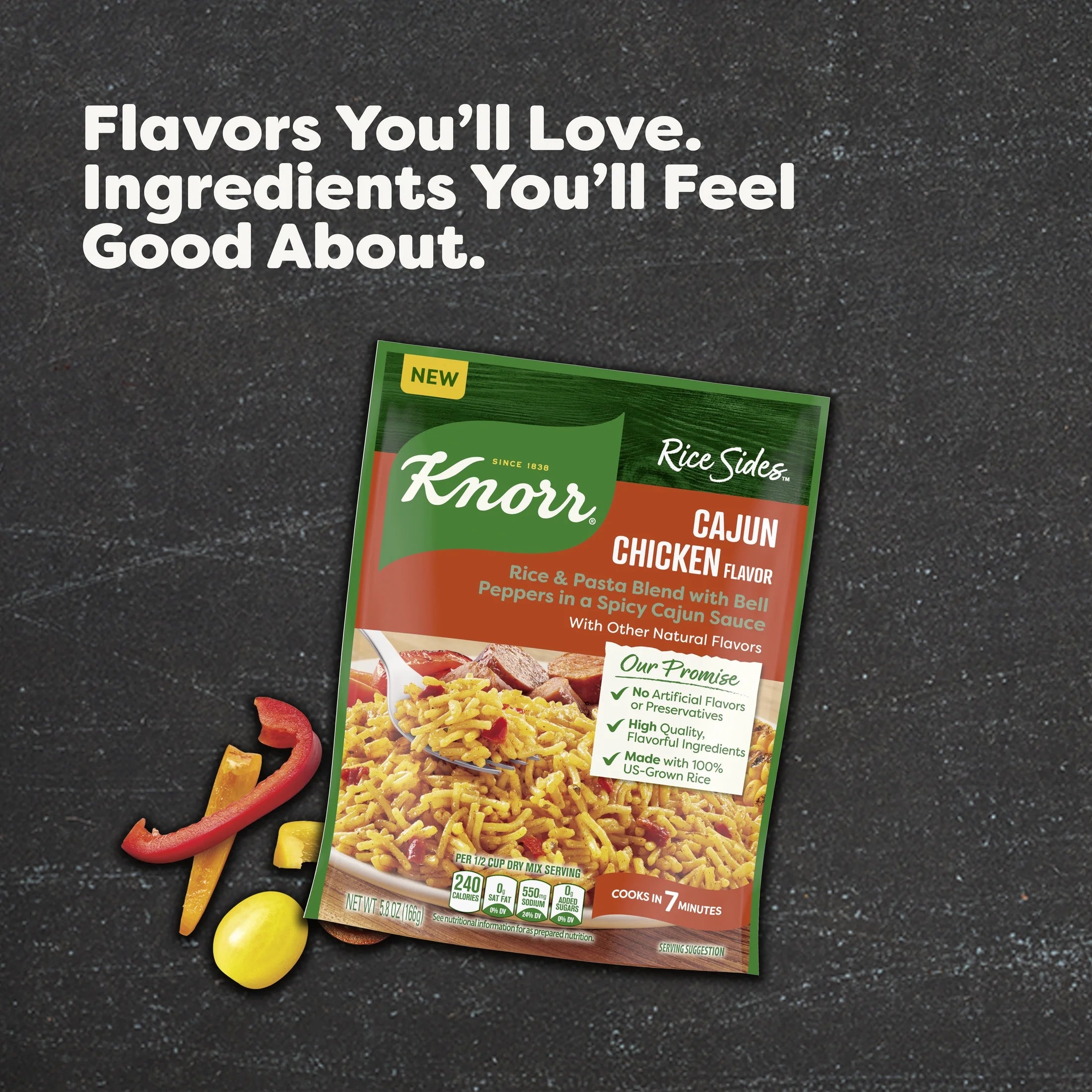 Knorr No Artificial Flavors Cajun Chicken Flavor Rice Sides, 5.8 oz Regular Pouch. Enjoy the bold and exciting new flavor of Knorr Cajun Chicken Flavor Rice Sides – a quick and convenient way to create delicious meals with ingredients you can feel good about. Knorr Cajun Chicken Flavor Rice Sides includes a blend of rice and vermicelli pasta with bell peppers in a spicy Cajun sauce. Knorr Cajun Chicken Flavor Rice Sides can be prepared in just 7 minutes. Shelf Stable Pouch.