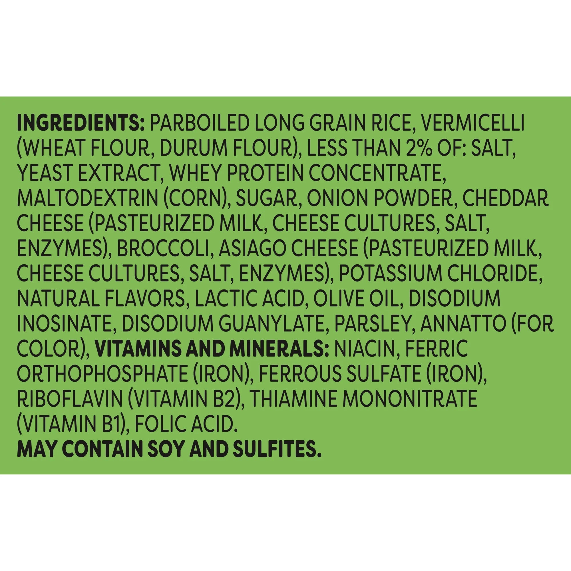 Ingredients: Parboiled Long Grain Rice, Vermicelli (Wheat Flour, Durum Flour), Less Than 2% Of: Salt, Yeast Extract, Whey Protein Concentrate, Maltodextrin (Corn), Sugar, Onion Powder, Cheddar Cheese (Pasteurized Milk, Cheese Cultures, Salt, Enzymes), Broccoli, Asiago Cheese (Pasteurized Milk, Cheese Cultures, Salt, Enzymes), Potassium Chloride, Natural Flavors, Lactic Acid, Olive Oil, Disodium Inosinate, Disodium Guanylate, Parsley, Annatto (For Color), Vitamins And Minerals: Niacin, Ferric Orthophosphate (Iron), Ferrous Sulfate (Iron), Riboflavin (Vitamin B2), Thiamine Mononitrate (Vitamin B1), Folic Acid. May Contain Soy And Sulfites/div>