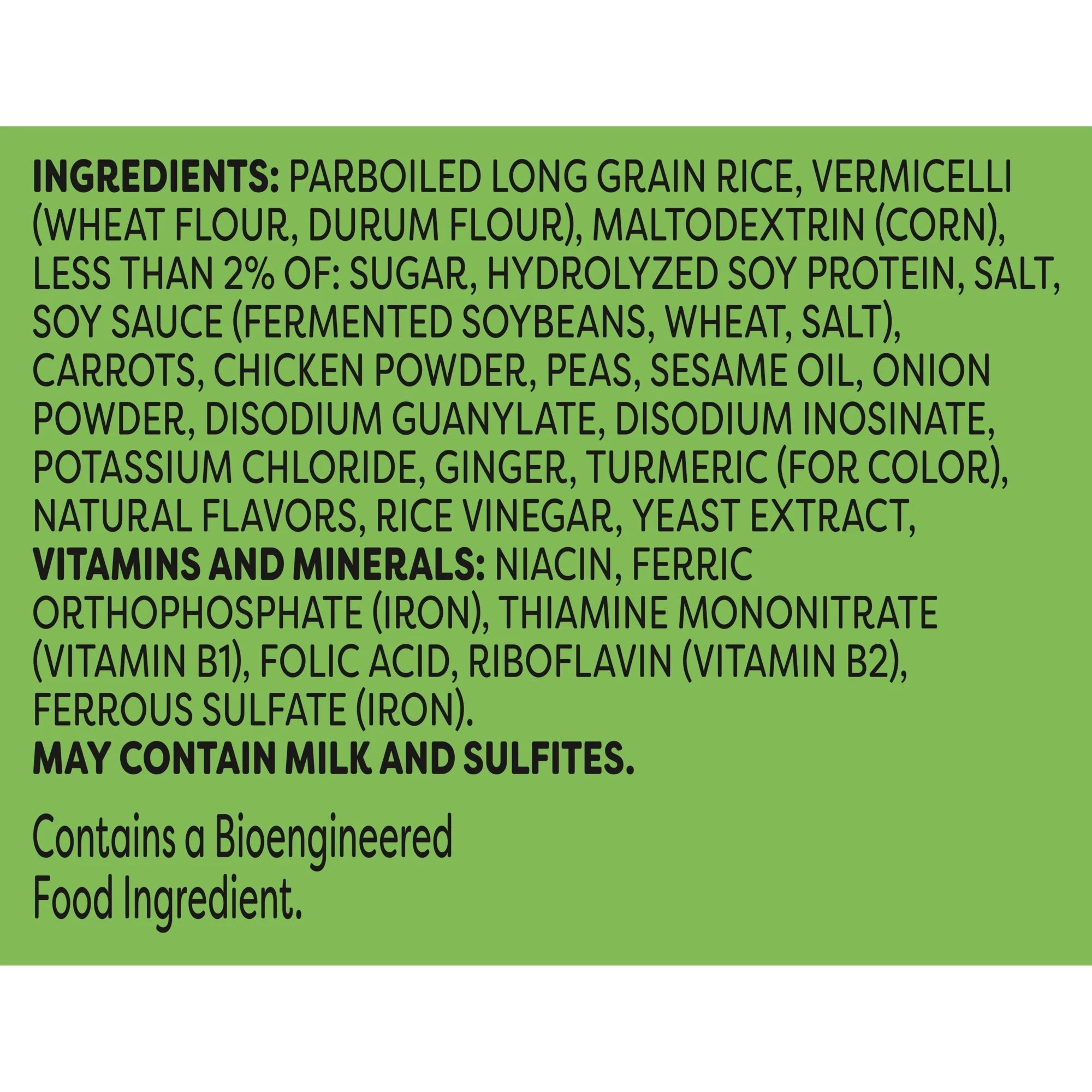 Parboiled Long Grain Rice, Vermicelli (Wheat Flour, Durum Flour), Maltodextrin (Corn), Corn Starch, Less Than 2% Of: Sugar, Hydrolyzed Soy Protein, Salt, Soy Sauce (Fermented Soybeans, Wheat, Salt), Carrots, Chicken Powder, Peas, Sesame Oil, Onion Powder, Disodium Guanylate, Disodium Inosinate, Potassium Chloride, Ginger, Turmeric (for Color), Natural Flavors, Rice Vinegar, Yeast Extract, Vitamins And Minerals: Niacin, Ferric Orthophosphate (Iron), Thiamine Mononitrate (Vitamin B1), Folic Acid, Riboflavin (Vitamin B2), Ferrous Sulfate (Iron)/div>