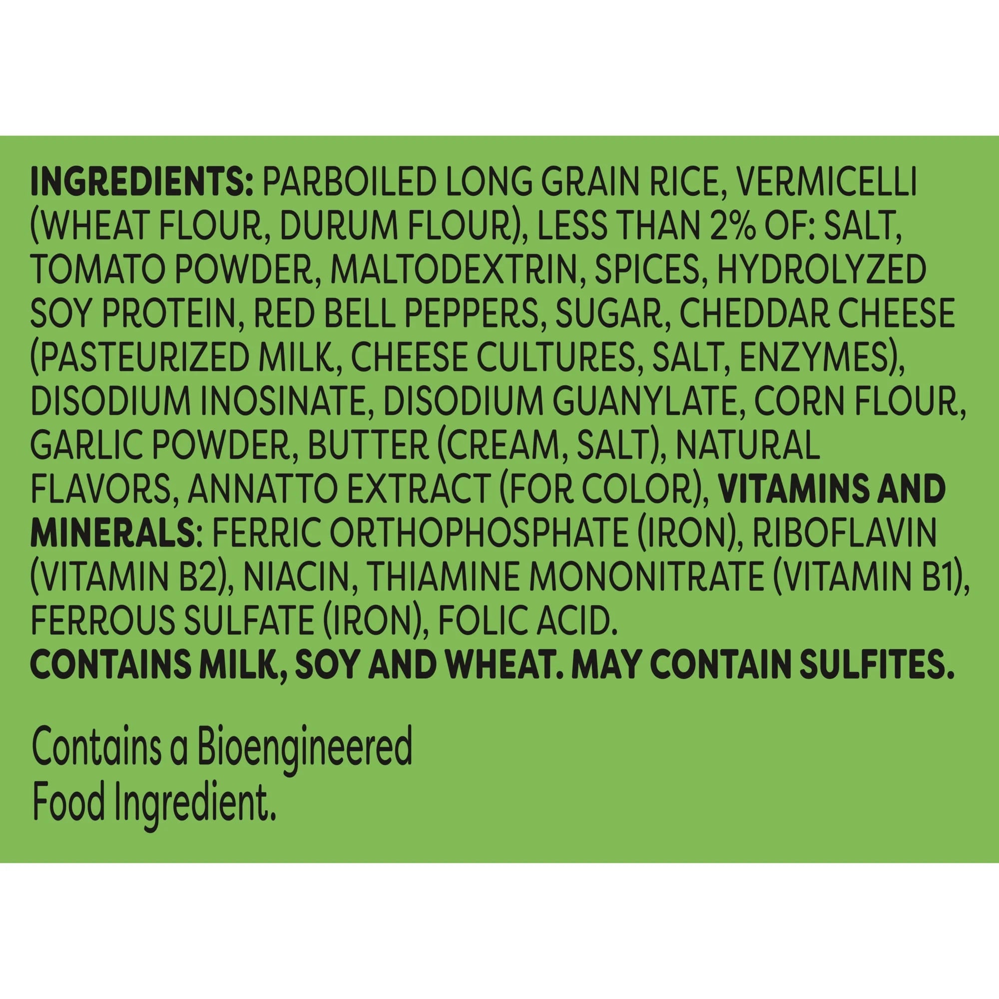 Parboiled Long Grain Rice, Vermicelli (Wheat Flour, Durum Flour), Less Than 2% Of: Salt, Tomato Powder, Maltodextrin, Spices, Hydrolyzed Soy Protein, Red Bell Peppers, Sugar, Cheddar Cheese (Pasteurized Milk, Cheese Cultures, Salt, Enzymes), Disodium Inosinate, Disodium Guanylate, Corn Flour, Garlic Powder, Butter (Cream, Salt), Natural Flavors, Annatto Extract (For Color), Vitamins And Minerals: Ferric Orthophosphate (Iron), Riboflavin (Vitamin B2), Niacin, Thiamine Mononitrate (Vitamin B1), Ferrous Sulfate (Iron), Folic Acid. Contains Milk, Soy And Wheat. May Contain Sulfites./div>