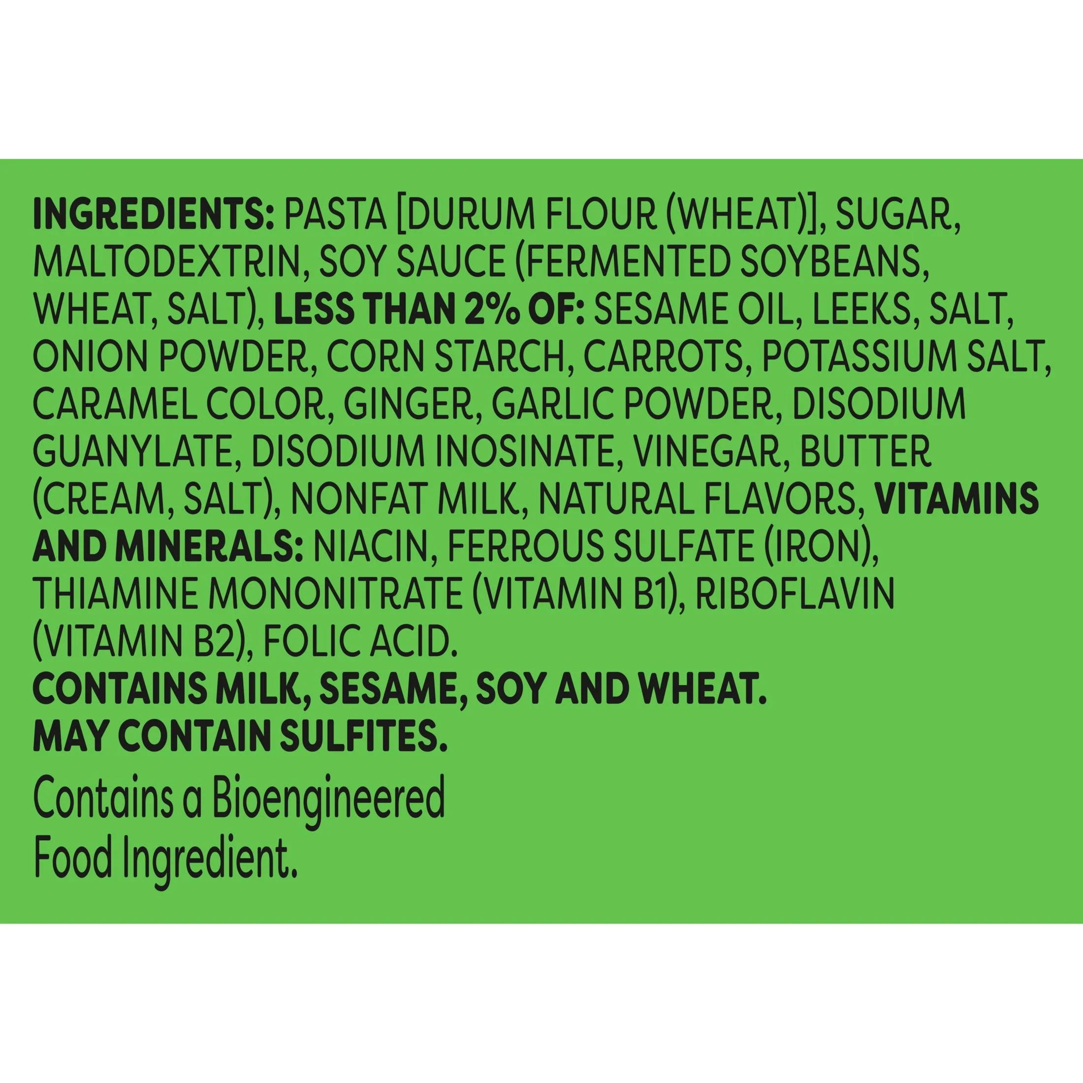 Pasta [Durum Flour (Wheat)], Sugar, Maltodextrin, Soy Sauce (Fermented Soybeans, Wheat, Salt), Less than 2% of: Sesame Oil, Leeks, Salt, Onion Powder, Corn Starch, Carrots, Potassium Salt, Caramel Color, Ginger, Garlic Powder, Disodium Guanylate, Disodium Inosinate, Vinegar, Butter (Cream, Salt), Nonfat Milk, Natural Flavors, Vitamins and Minerals: Niacin, Ferrous Sulfate (Iron), Thiamine Mononitrate (Vitamin B1), Riboflavin (Vitamin B2), Folic Acid/div>
