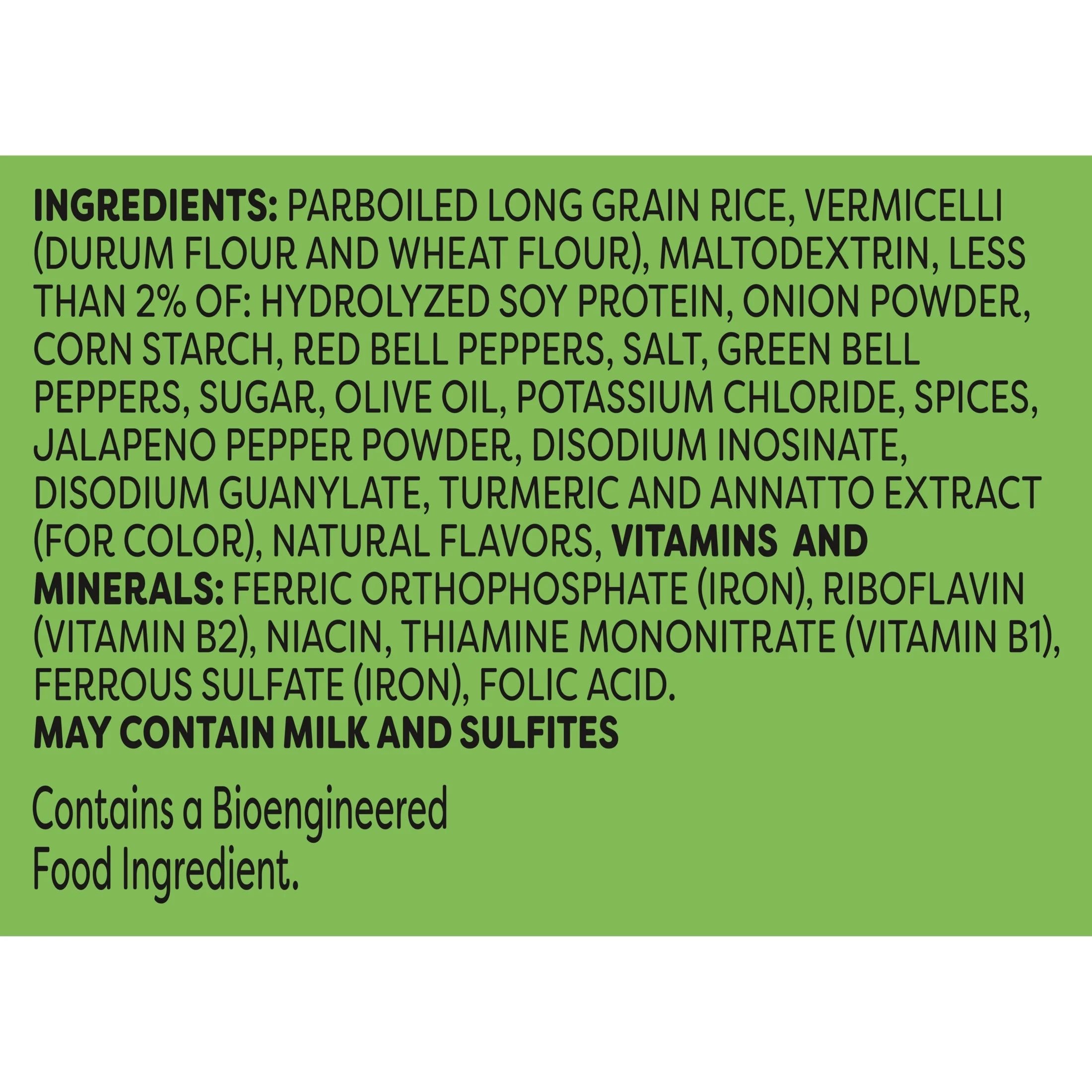 Parboiled Long Grain Rice, Vermicelli (Durum Flour And Wheat Flour), Maltodextrin, Less Than 2% Of: Hydrolyzed Soy Protein, Onion Powder, Corn Starch, Red Bell Peppers, Salt, Green Bell Peppers, Sugar, Olive Oil, Potassium Chloride, Spices, Jalapeno Pepper Powder, Disodium Inosinate, Disodium Guanylate, Turmeric And Annatto Extract (For Color), Natural Flavors, Vitamins And Minerals: Ferric Orthophosphate (Iron), Riboflavin (Vitamin B2), Niacin, Thiamine Mononitrate (Vitamin B1), Ferrous Sulfate (Iron), Folic Acid./div>