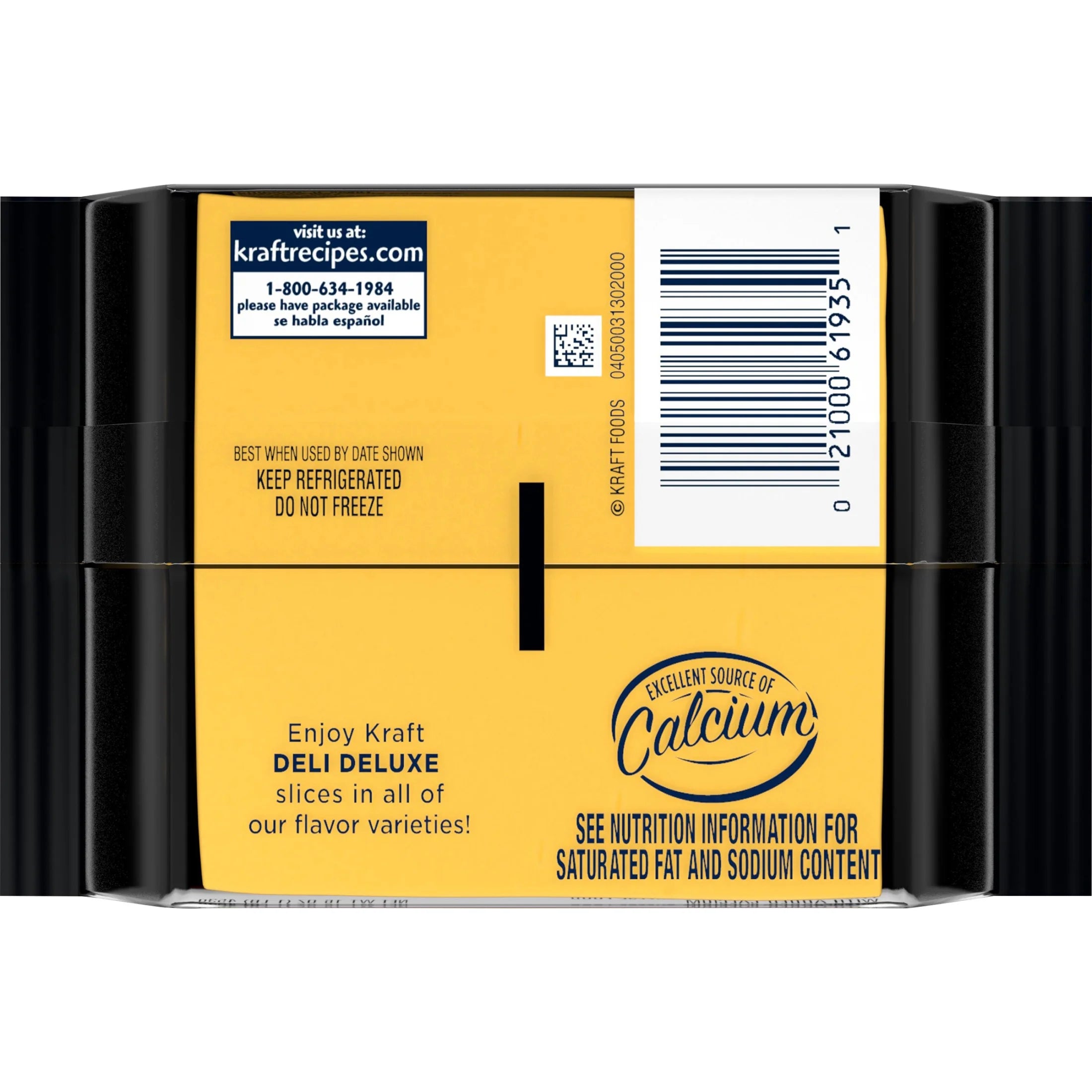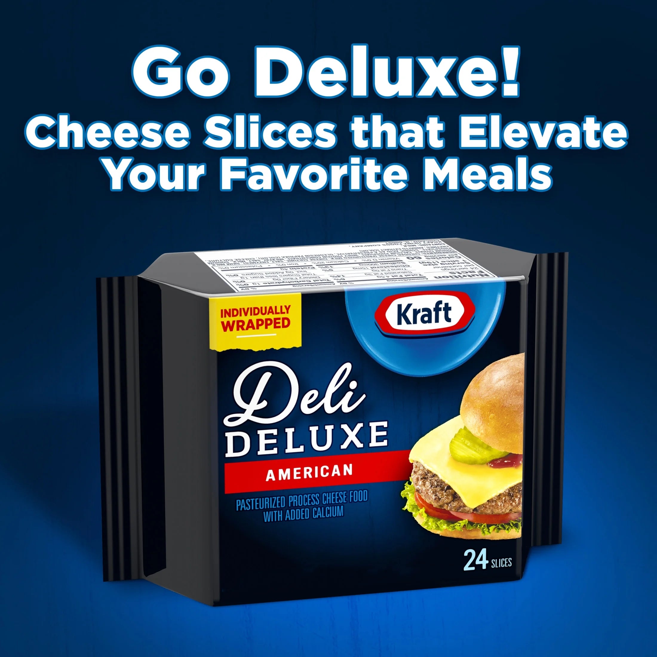 Bring on the bold. Kraft Deli Deluxe American Cheese Slices elevate your favorite foods with big cheese energy. Try our individually wrapped, yellow slices on sandwiches, burgers, grilled cheeses and more. Sliced American cheese has a mild, slightly tangy flavor and smooth texture that goes well with meat and vegetable dishes, hot and cold. Pre-sliced and individually wrapped for your convenience, our deli-style American cheese is perfect for layering on a classic sandwich, building a better burger or snacking straight from the package. Kraft Deli Deluxe American Cheese is made with quality ingredients for full flavor and consistency. Our slices contain 20% of your daily value of calcium per serving. See nutrition information for fat, saturated fat and sodium content. Make every burger bold with melt-in-your-mouth flavor or top any sandwich for a perfect melt. Stay stocked up and snack-ready with our 16-ounce package of 24 individually wrapped American cheese slices. Buy now and know you can satisfy your cravings for cheesy melts whenever you want. Keep in the fridge until ready to use. Slice by slice, enjoy and elevate your day. Contains: Milk. No Allergen Free Claims Apply. Refrigerated.