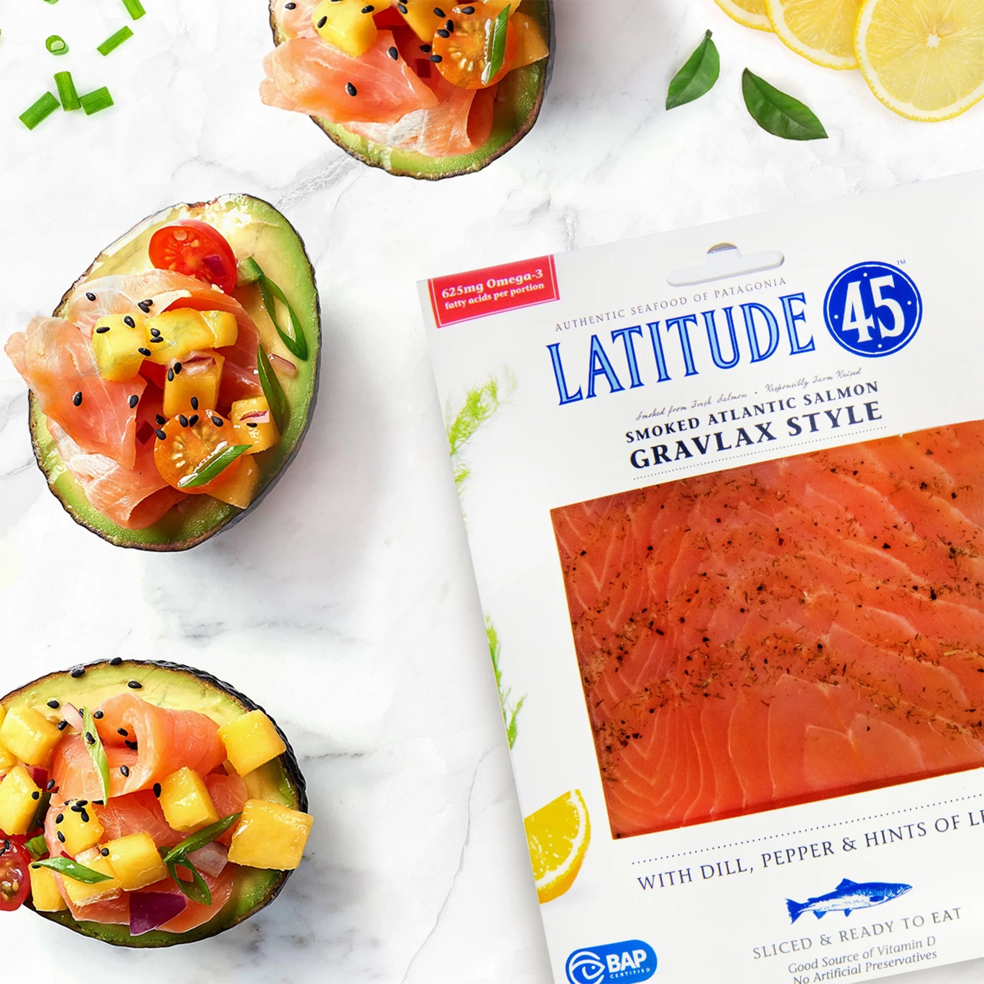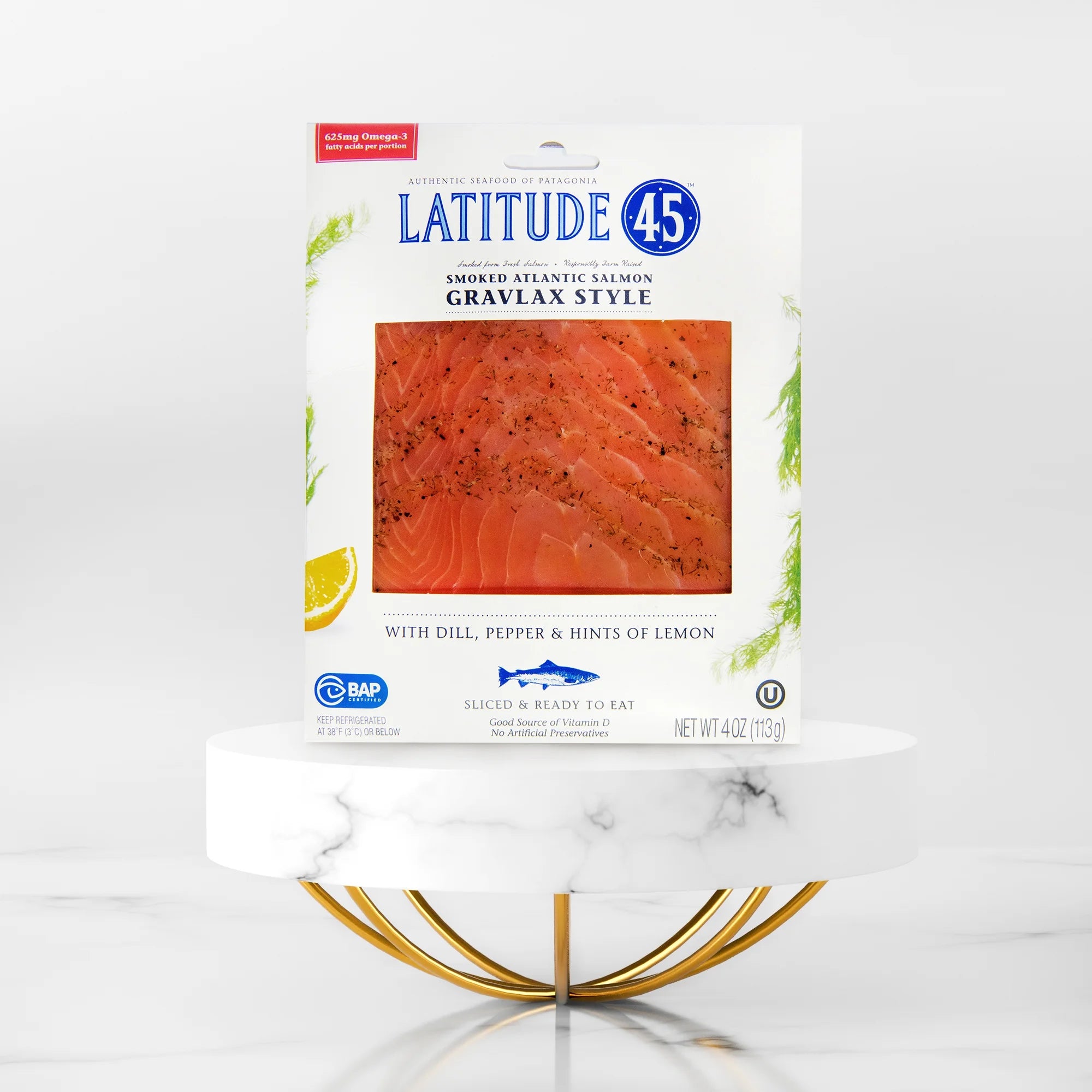 Latitude 45 Cold Smoked gravlax style salmon slices are made from hand-selected fresh Atlantic Salmon, sustainably sourced from the pristine waters of the Chilean Patagonian region. Within hours of harvest, the salmon is naturally cured through a slow smoke process, creating one of the finest smoked salmon products available. Our product is ready-to-eat and offers endless pairing options. The traditional slice is perfect for enjoying on bagels, toast, in sandwiches, on flatbreads or for use in salads. Gluten-Free 4oz. A Great alternative to Lox