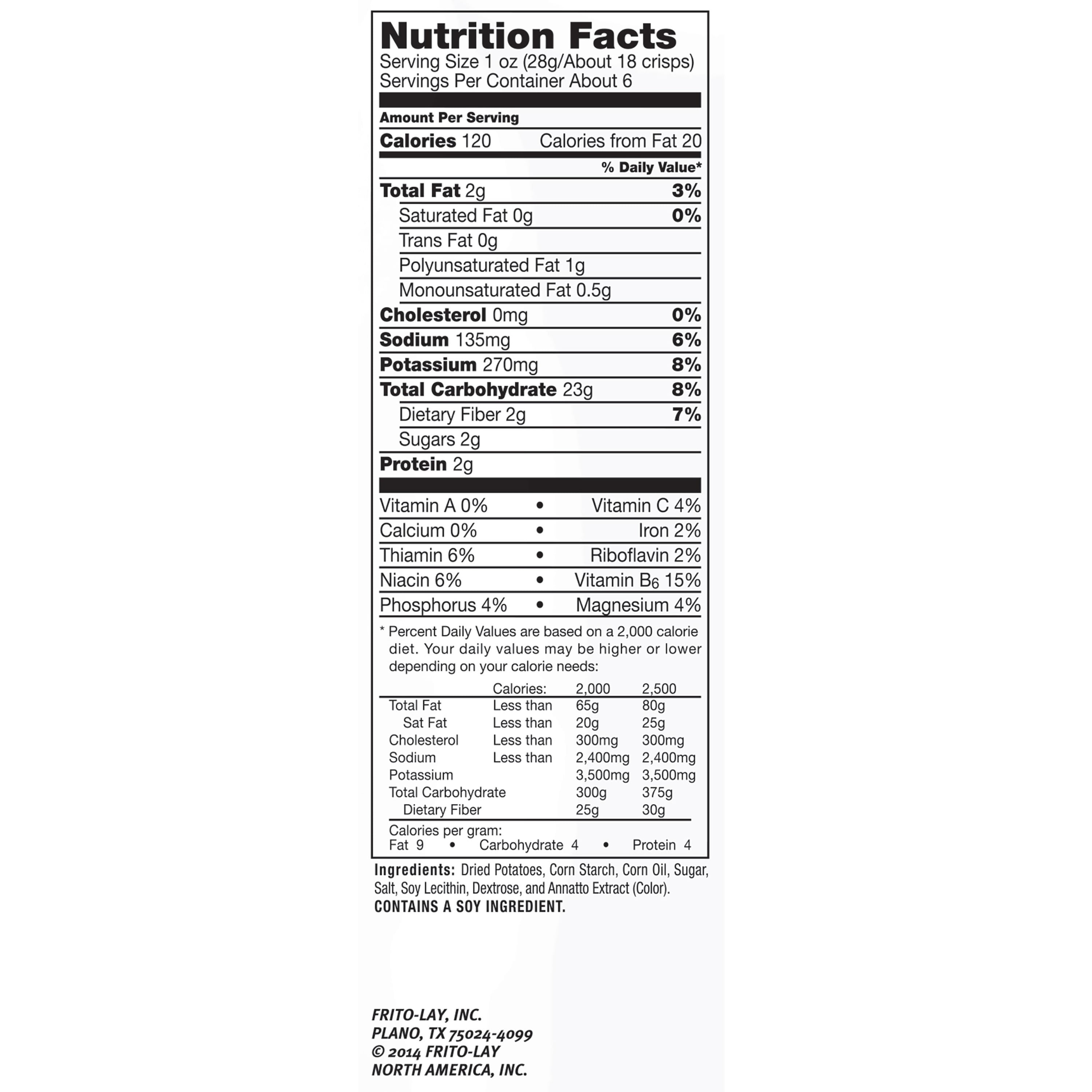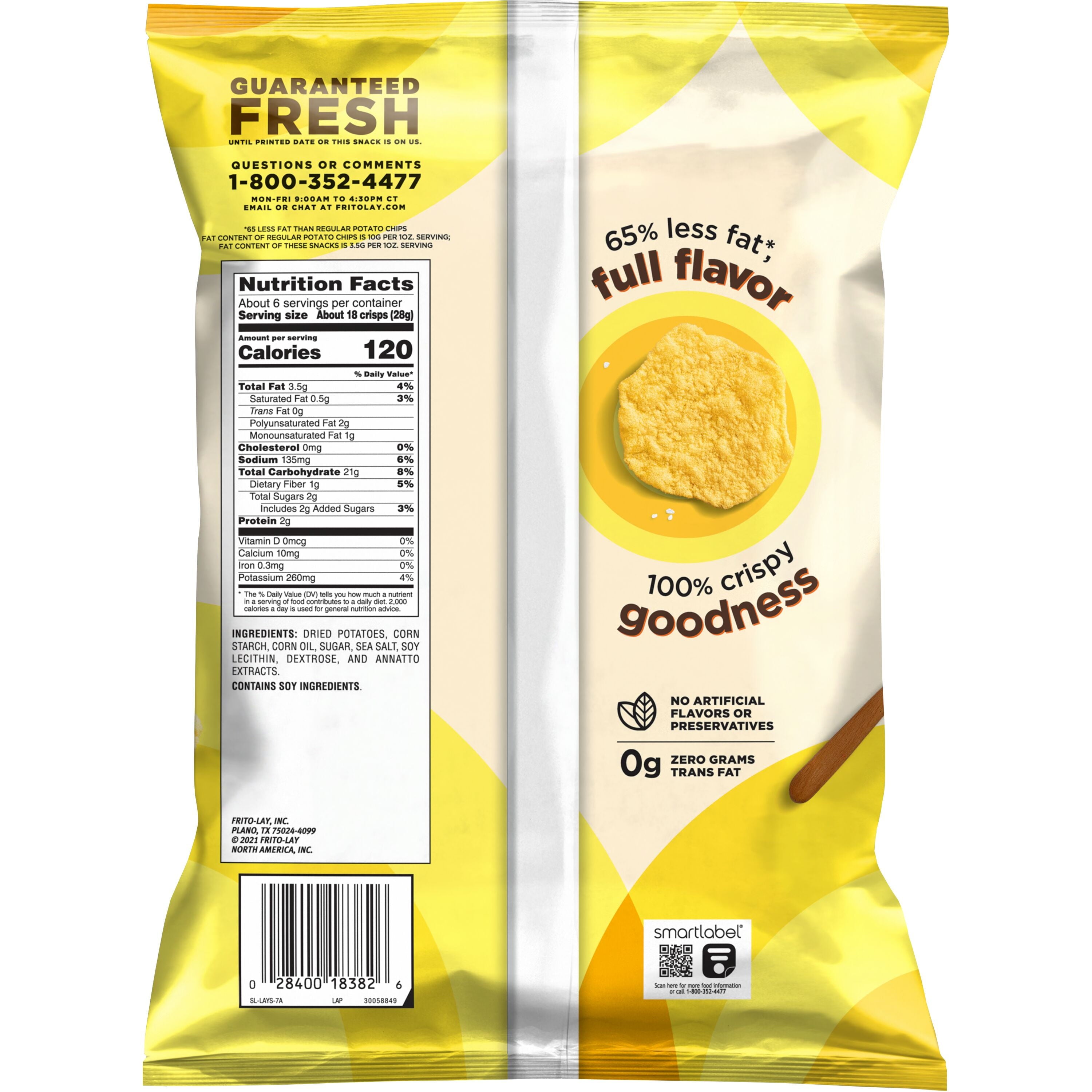 - Frito-Lay's line of Oven Baked snacks are baked, not fried, to give you the great taste you've come to love with Frito-Lay snacks. On top of that, LAY'S Oven Baked Original Potato Crisps have 80% less fat than regular potato chips. Fat content of regular potato chips is 10g per 1 oz serving. Fat content of these snacks is 2g per 1 oz serving. This package contains 6.25 oz.