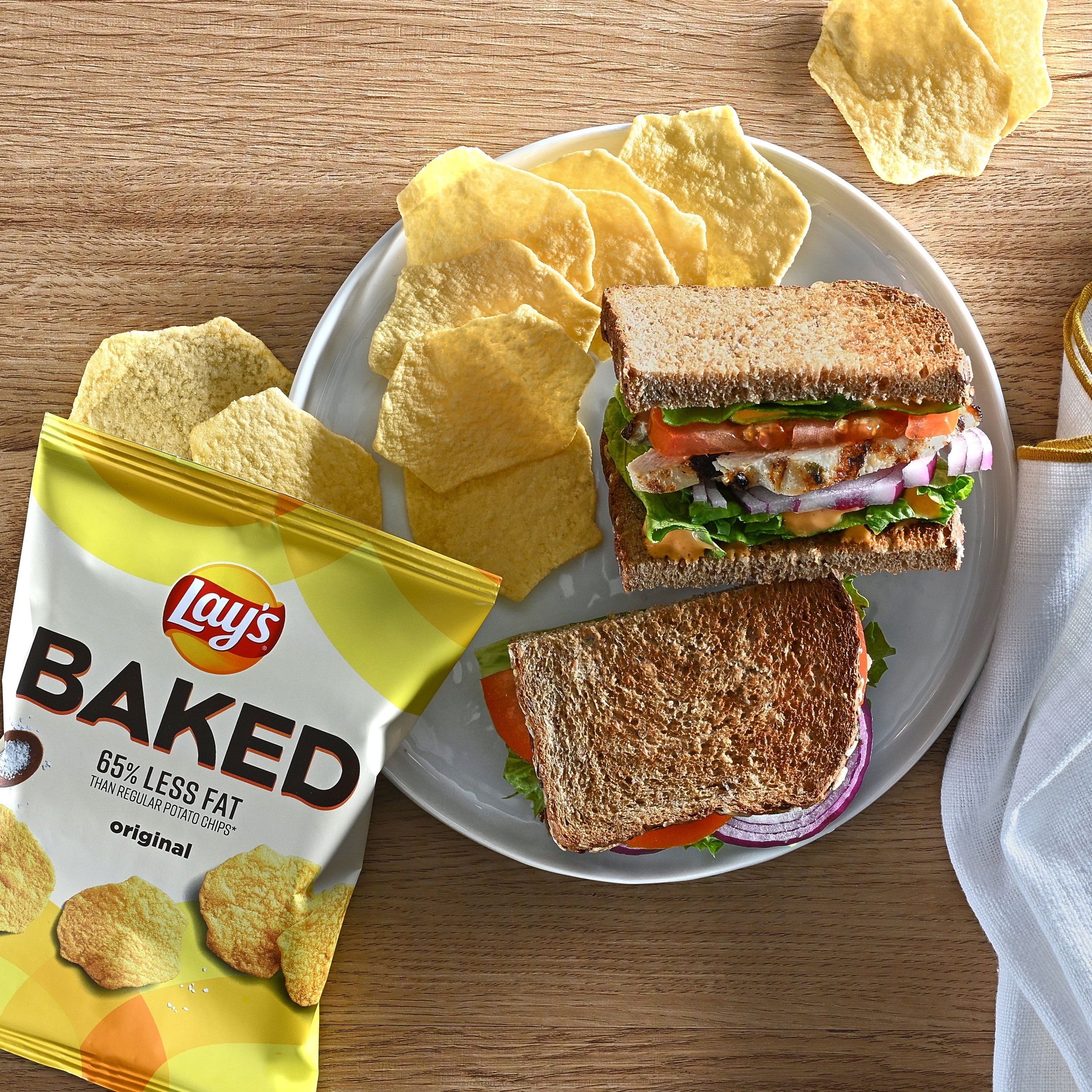 - On top of that, Lay's Oven Baked Original Potato Crisps have 80% less fat than regular potato chips