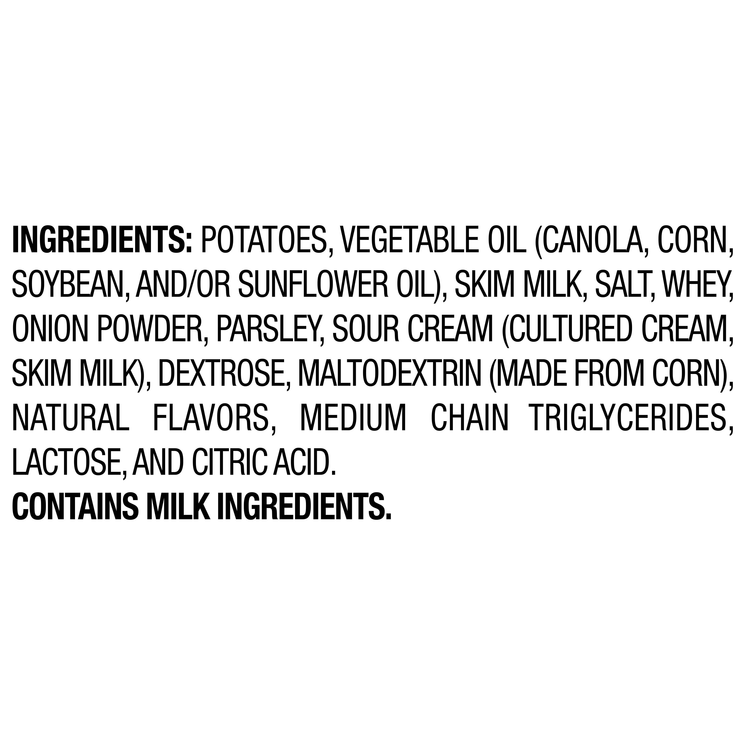 Potatoes, Vegetable Oil (Sunflower, Corn, And/Or Canola Oil), Sour Cream & Onion Seasoning (Skim Milk, Salt, Sour Cream [Cultured Cream, Skim Milk], Onion Powder, Whey, Whey Protein Concentrate, Canola Oil, Natural Flavor, Parsley, Gum Arabic, Maltodextrin [Made from Corn], Sunflower Oil, Citric Acid, And Buttermilk). Contains Milk Ingredients./div>