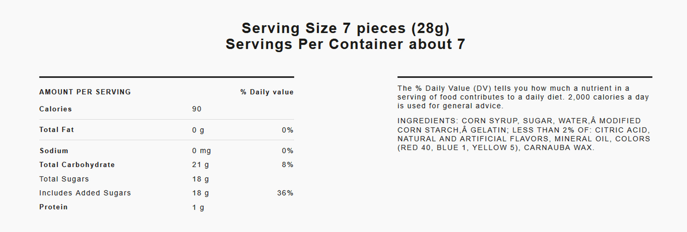 Corn Syrup, Sugar, Water, Modified Corn Starch, Gelatin; Less than 2% of: Citric Acid, Natural and Artificial Flavors, Mineral Oil, Colors (Red 40, Blue 1, Yellow 5), Carnauba Wax./div>
