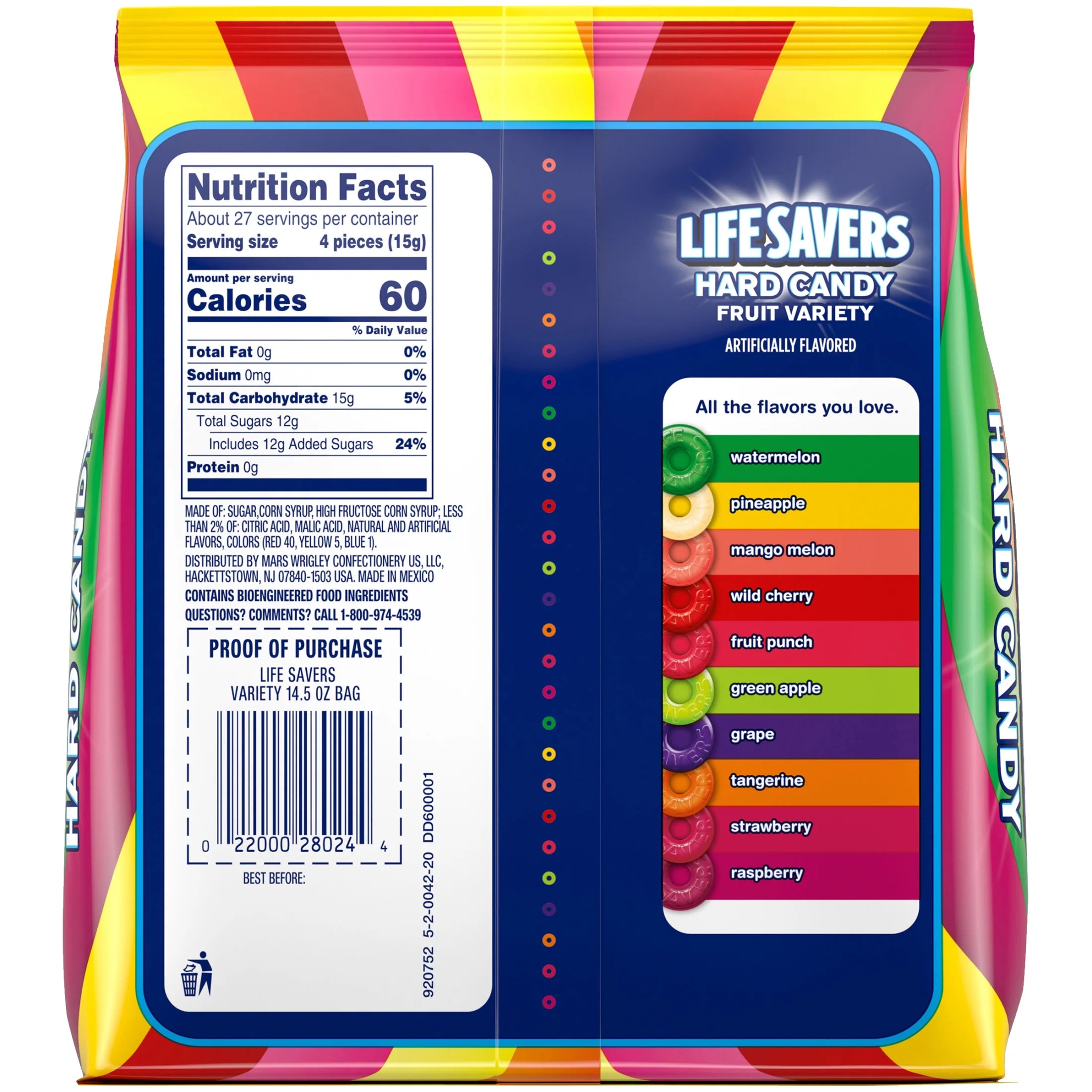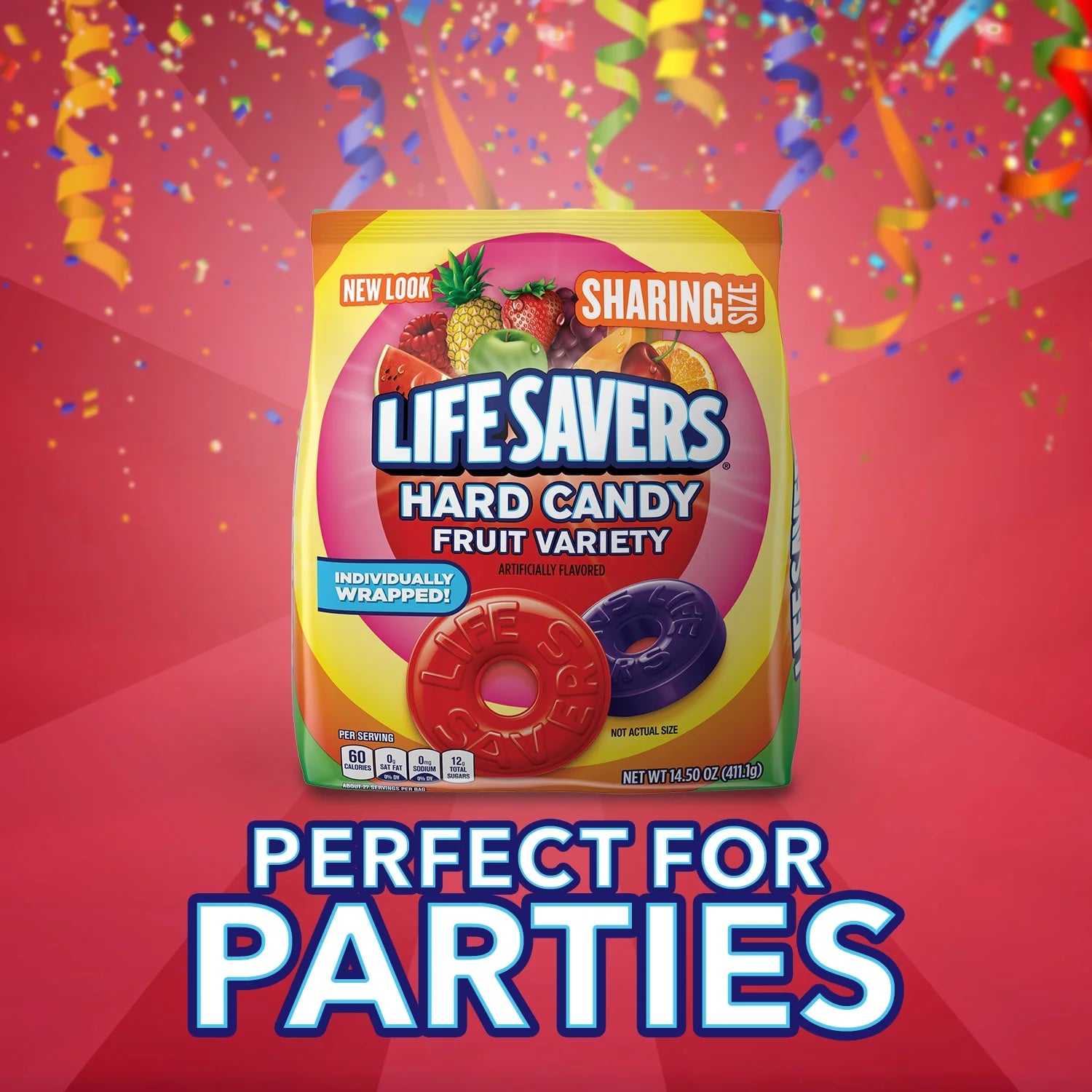 - Contains one (1) 14.5-ounce sharing size bag of LIFE SAVERS Fruity Variety Hard Candy