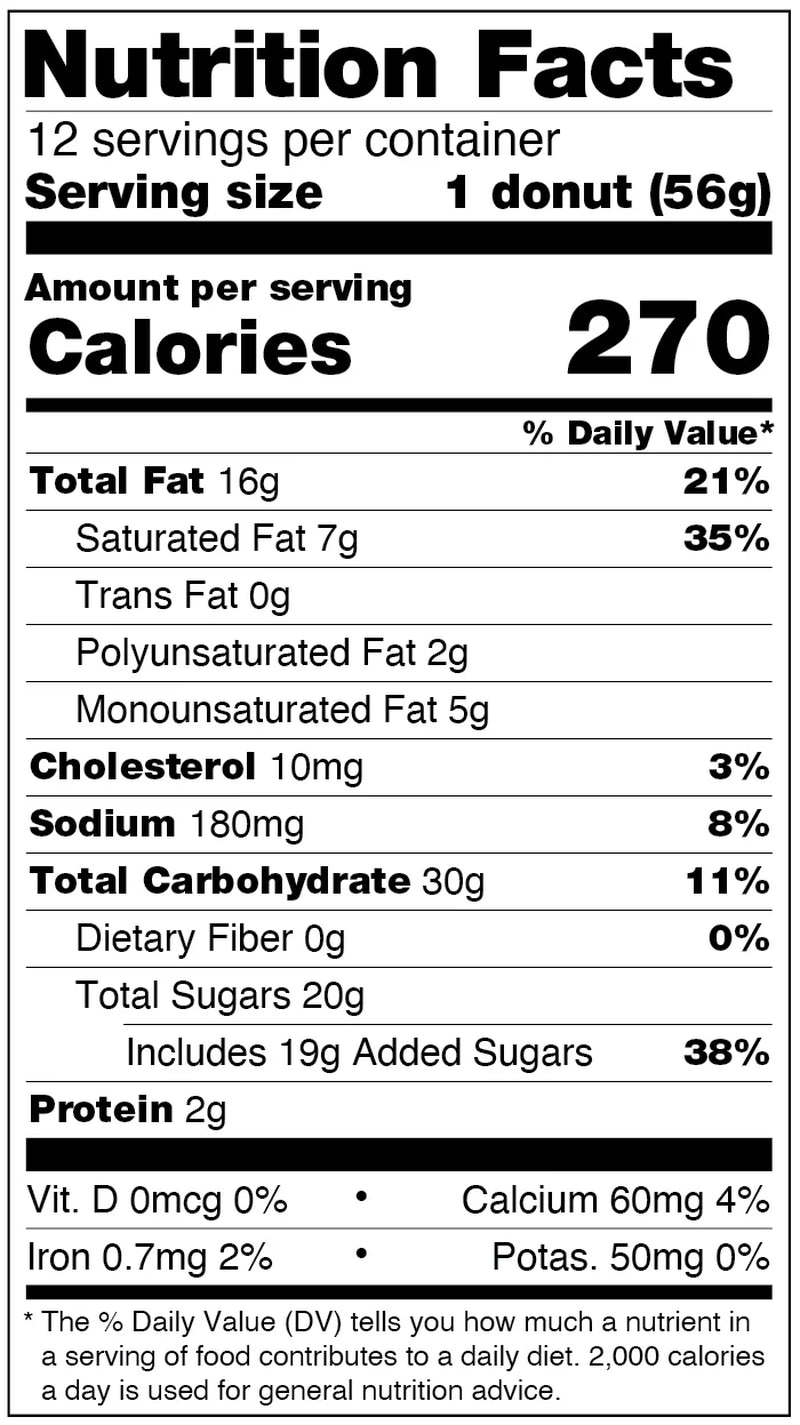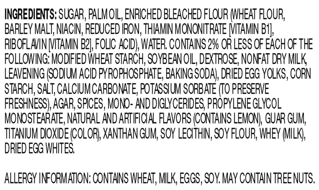 12 donuts per carton Individually wrapped Ingredients Sugar, Palm Oil, Enriched Bleached Flour (Wheat Flour, Barley Malt, Niacin, Reduced... Read more