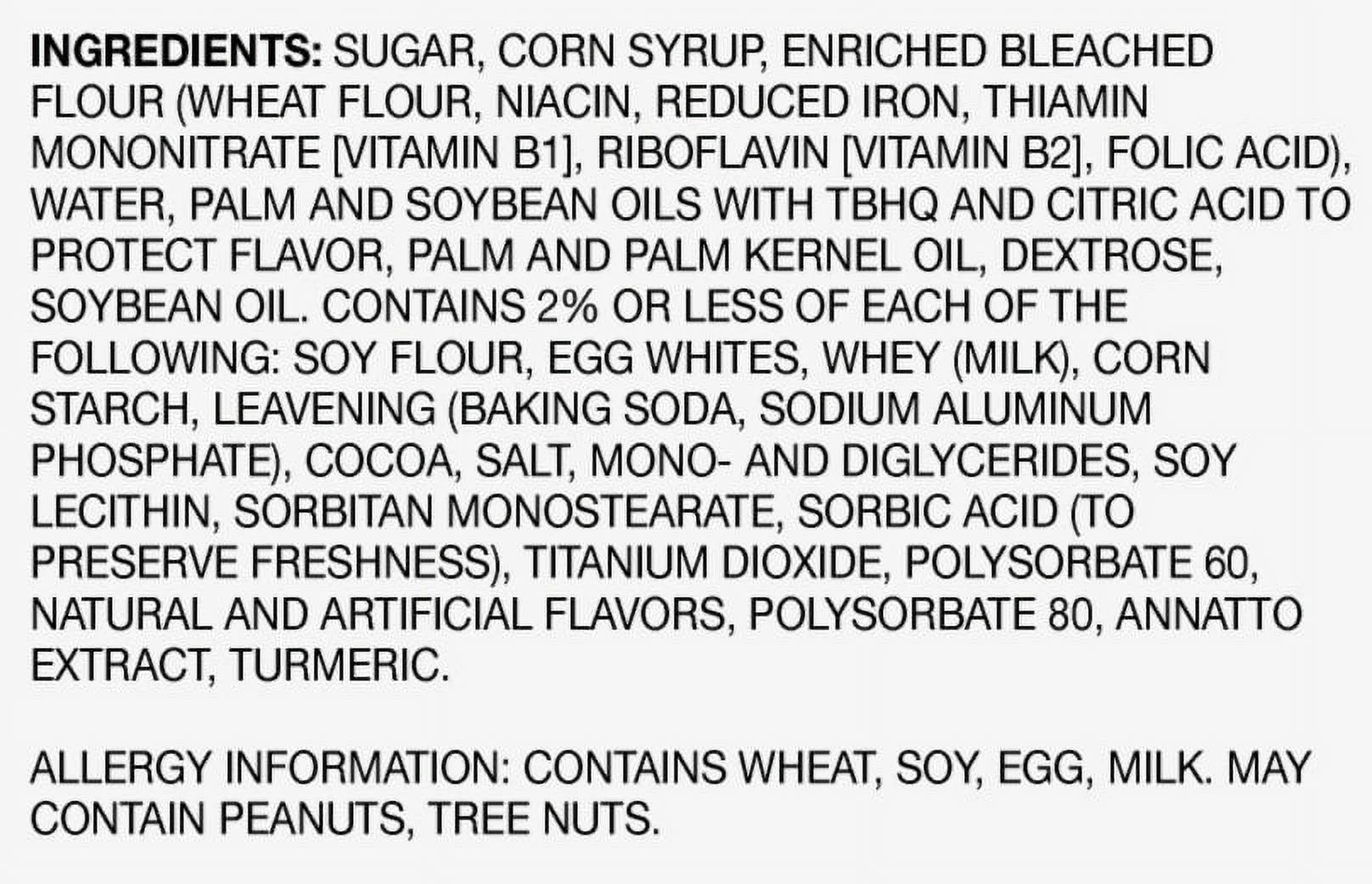 Ingredients: Sugar, Corn Syrup, Enriched Bleached Flour (Wheat Flour, Niacin, Reduced Iron, Thiamin Mononitrate [Vitamin B1], Riboflavin [Vitamin B2], Folic Acid), Water, Palm and Soybean Oils with TBHQ and Citric Acid to Protect Flavor, Palm and Palm Kernel Oil, Dextrose. Contains 2% or less of each of the following: Soybean Oil, Corn Starch, Dried Egg Whites, Whey (Milk), Cocoa, Salt, Mono- and Diglycerides, Soy Lecithin, Sorbitan Monostearate, Sorbic Acid (to Preserve Freshness), Titanium Dioxide (color), Polysorbate 60, Natural and Artificial Flavors, Polysorbate 80, Annatto Extract, Turmeric Extract, Soy Flour, Leavening (Baking Soda, Sodium Aluminum Phosphate)./div>