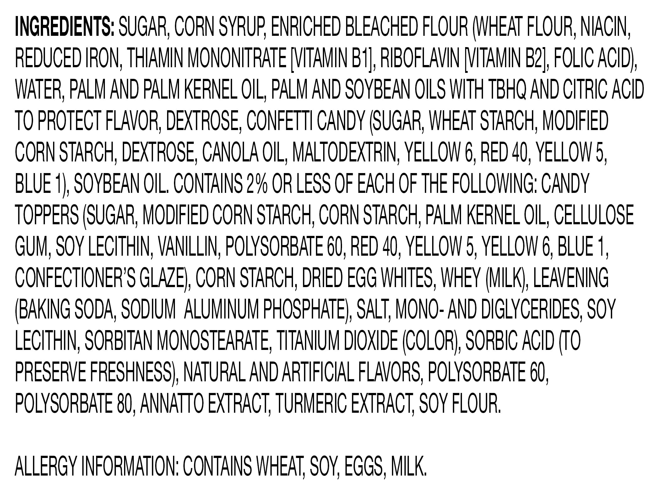 Ingredients: Sugar, Corn Syrup, Enriched Bleached Flour (Wheat Flour, Niacin, Reduced Iron, Thiamin Mononitrate [Vitamin B1], Riboflavin [Vitamin B2], Folic Acid), Water, Palm and Palm Kernel Oil, Palm and Soybean Oils with TBHQ and Citric Acid to protect flavor, Dextrose, Confetti Candy (Sugar, Wheat Starch, Modified Corn Starch, Dextrose, Canola Oil, Maltodextrin, Yellow 6, Red 40, Yellow 5, Blue 1), Soybean Oil. Contains 2% or less of each of the following: Candy Toppers (Sugar, Modifed Corn Starch, Corn Starch, Palm Kernel Oil, Cellulose Gum, Soy Lecithin, Vanillin, Polysorbate 60, Red 40, Yellow 5, Yellow 6, Blue 1, Confectionerâs Glaze), Corn Starch, Dried Egg Whites, Whey (Milk), Leavening (Baking Soda, Sodium Aluminum Phosphate), Salt, Mono- and Diglycerides, Soy Lecithin, Sorbitan Monostearate, Titanium Dioxide (Color), Sorbic Acid (to preserve freshness), Natural and Artificial Flavors, Polysorbate 60, Polysorbate 80, Annatto Extract, Turmeric Extract, Soy Flour./div>