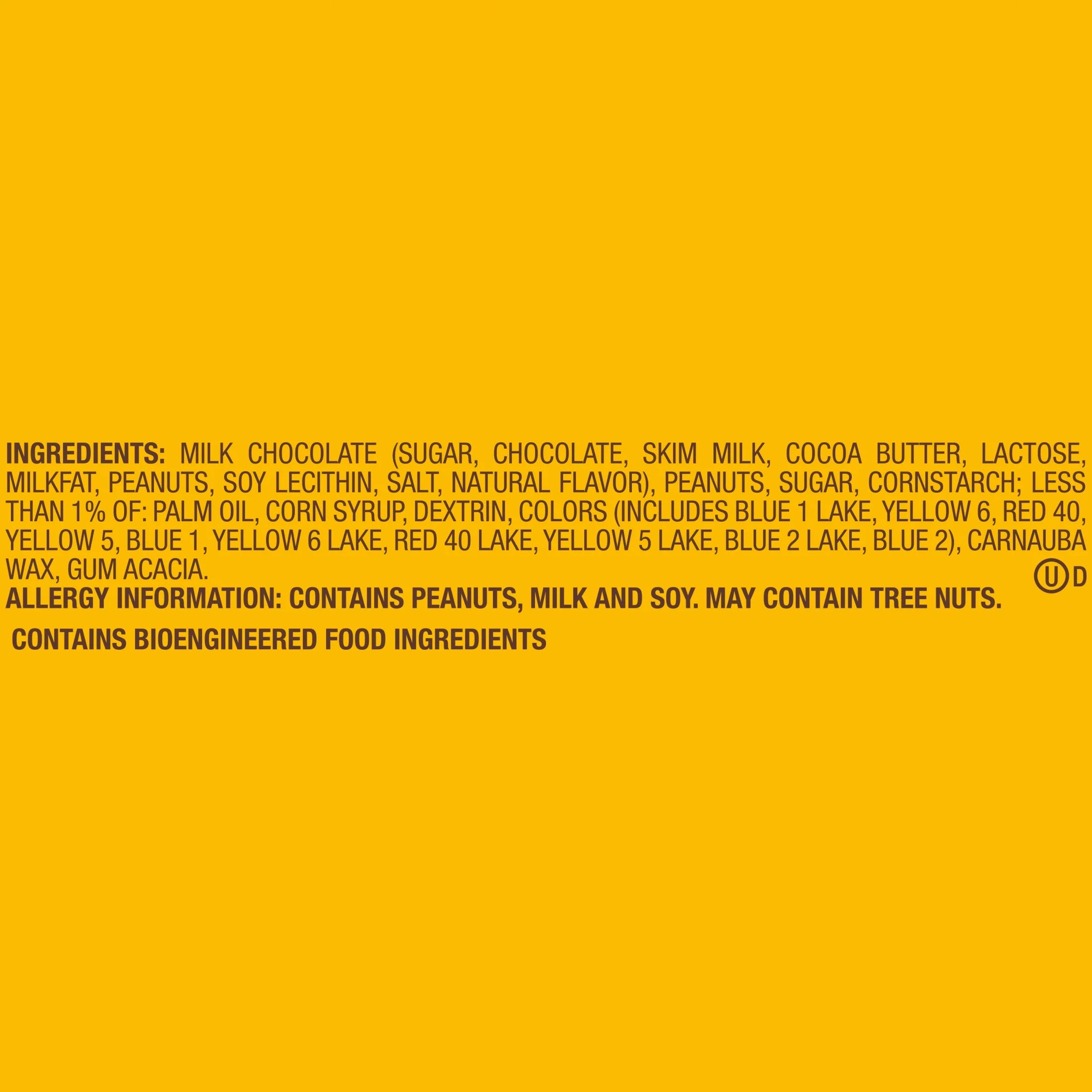 MILK CHOCOLATE (SUGAR, CHOCOLATE, SKIM MILK, COCOA BUTTER, LACTOSE, MILKFAT,PEANUTS, SOY LECITHIN, SALT, NATURAL FLAVOR), PEANUTS, SUGAR, CORNSTARCH; LESS THAN 1% OF: PALMOIL, CORN SYRUP, DEXTRIN, COLORS (INCLUDES BLUE 1 LAKE, YELLOW 6, RED 40, YELLOW 5, BLUE 1, YELLOW6 LAKE, RED 40 LAKE, YELLOW 5 LAKE, BLUE 2 LAKE, BLUE 2), CARNAUBA WAX, GUM ACACIA./div>