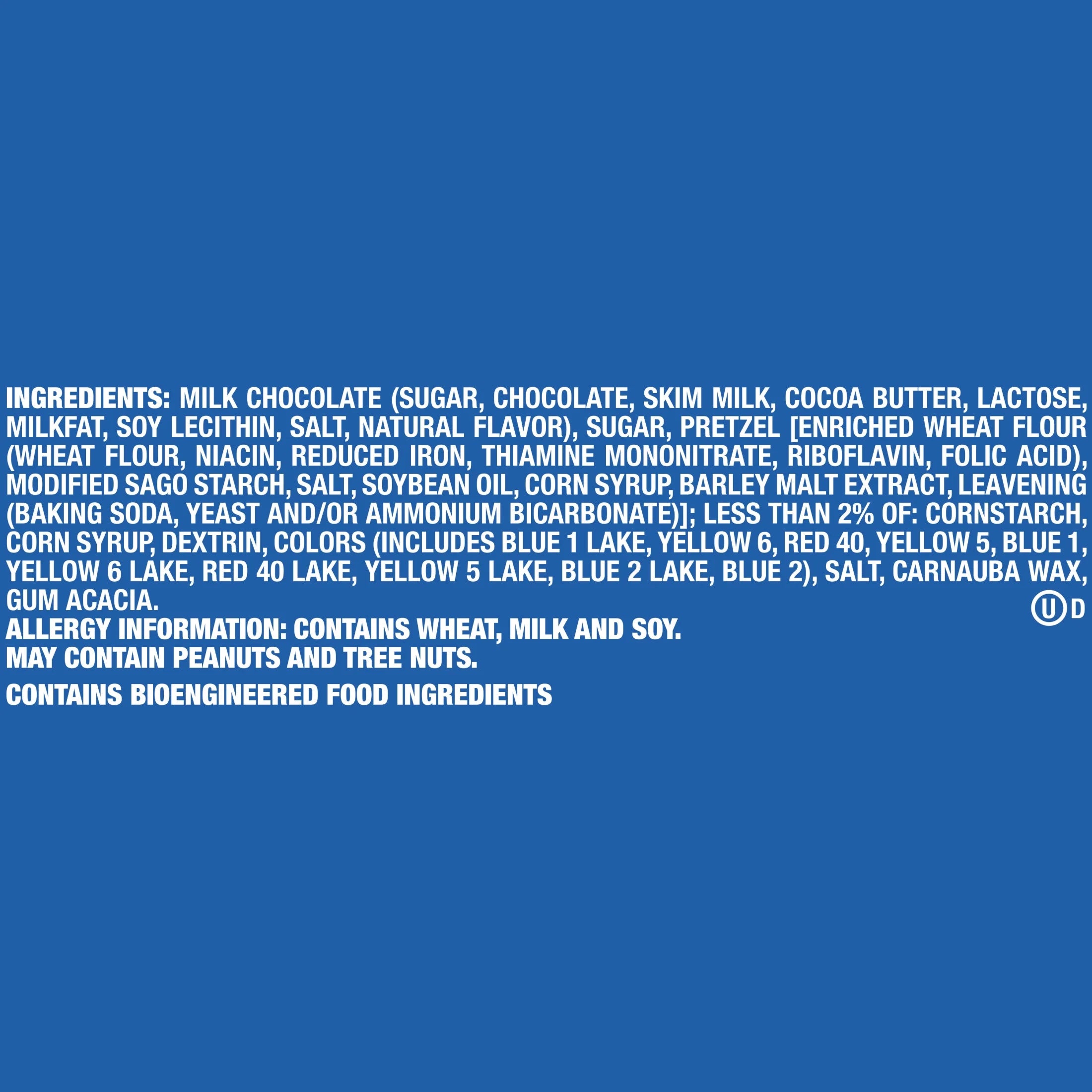 MILK CHOCOLATE (SUGAR, CHOCOLATE, SKIM MILK, COCOA BUTTER, LACTOSE, MILKFAT, SOY LECITHIN, SALT, NATURAL FLAVOR), SUGAR, PRETZEL [ENRICHED WHEAT FLOUR (WHEAT FLOUR, NIACIN, REDUCED IRON, THIAMINE MONONITRATE, RIBOFLAVIN, FOLIC ACID), MODIFIED SAGO STARCH, SALT, SOYBEAN OIL, CORN SYRUP, BARLEY MALT EXTRACT, LEAVENING (BAKING SODA, YEAST AND/OR AMMONIUM BICARBONATE)]; LESS THAN 2% OF: CORNSTARCH, CORN SYRUP, DEXTRIN, COLORS (INCLUDES BLUE 1 LAKE, YELLOW 6, RED 40, YELLOW 5, BLUE 1, YELLOW 6 LAKE, RED 40 LAKE, YELLOW 5 LAKE, BLUE 2 LAKE, BLUE 2), SALT, CARNAUBA WAX, GUM ACACIA./div>