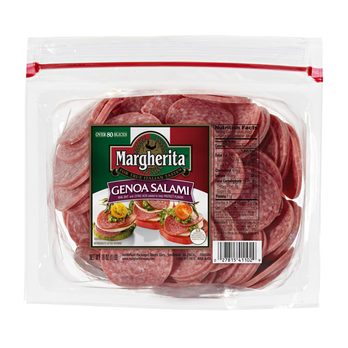One 16 oz. package of Margherita Pre-Sliced Deli Genoa Salami Genoa salami comes pre-sliced in convenient pieces for versatile use Margherita sliced deli salami is made with the finest cuts of beef and pork for quality results Deli sliced Genoa salami is natural smoked flavoring creates a robust taste to enhance your dishes This salami sandwich meat is cut into consistently thick slices that are ready to eat Enjoy Genoa salami as a snack or with wine and cheese for an easy appetizer, on a charcuterie board or added to your favorite dishes for extra flavor Resealable packaging with a zipper top keeps this Italian salami lunch meat fresh Includes salami, 16 oz.