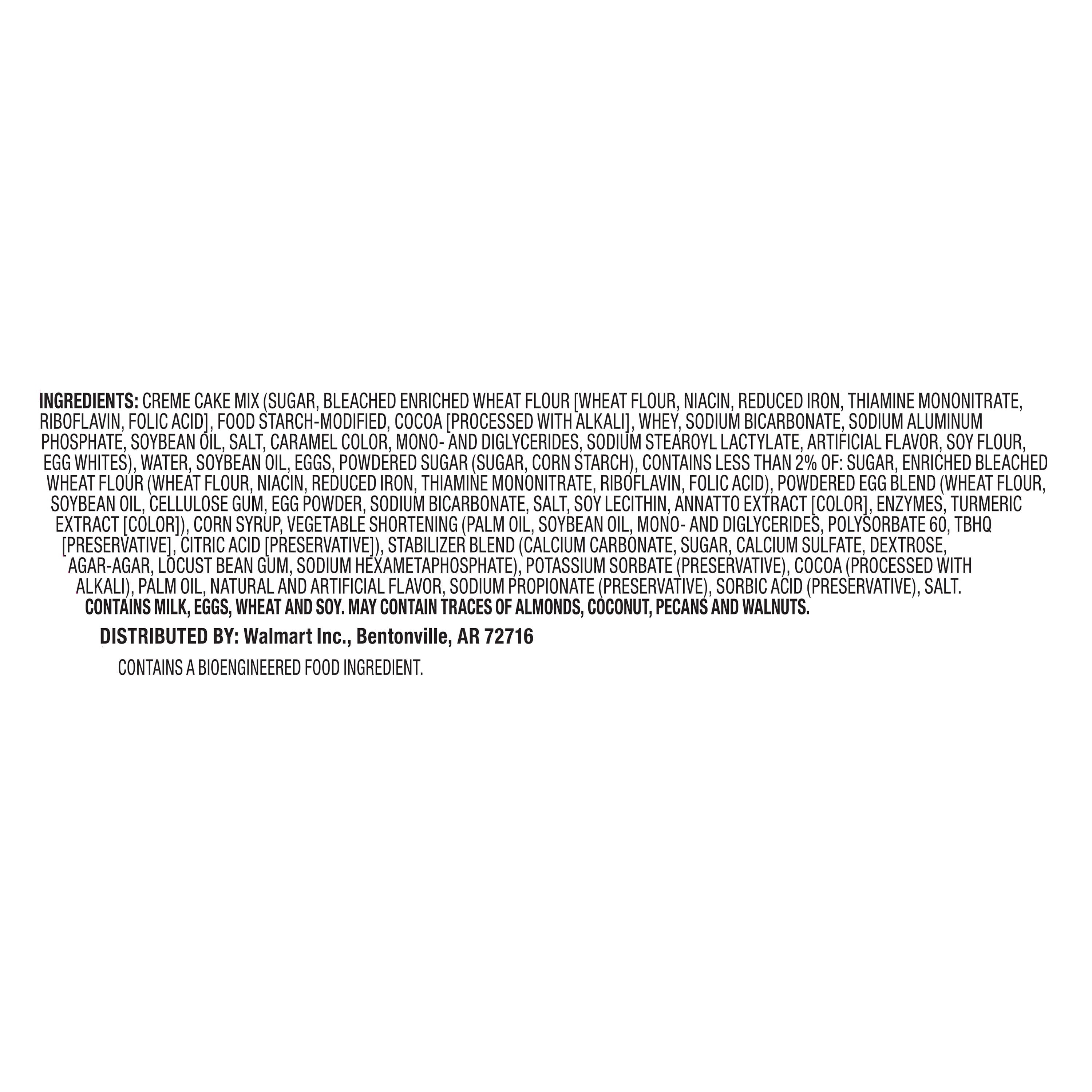 CREME CAKE MIX (SUGAR, BLEACHED ENRICHED WHEAT FLOUR [WHEAT FLOUR, NIACIN, REDUCED IRON, THIAMINE MONONITRATE, RIBOFLAVIN, FOLIC ACID], FOOD STARCH-MODIFIED, SOYBEAN OIL, DEXTROSE, SALT, SODIUM ALUMINUM PHOSPHATE, SODIUM BICARBONATE, MONO- AND DIGLYCERIDES, VITAL WHEAT GLUTEN, CORN STARCH, SOY LECITHIN, ARTIFICIAL FLAVOR, SODIUM STEAROYL LACTYLATE, WHEY), WATER, SOYBEAN OIL, EGGS, ENRICHED BLEACHED WHEAT FLOUR (WHEAT FLOUR, NIACIN, REDUCED IRON, THIAMINE MONONITRATE, RIBOFLAVIN, FOLIC ACID), SUGAR, POWDERED SUGAR (SUGAR, CORN STARCH), COCOA PROCESSED WITH ALKALI, SEMISWEET CHOCOLATE CHIPS (SUGAR, CHOCOLATE LIQUOR, COCOA BUTTER, SOY LECITHIN, NATURAL FLAVOR), INVERT SUGAR, CONTAINS LESS THAN 2% OF: CORN SYRUP, POWDERED EGG BLEND (WHEAT FLOUR, SOYBEAN OIL, CELLULOSE GUM, DRIED EGGS, SODIUM BICARBONATE, SALT, SOY LECITHIN, ANNATTO EXTRACT [COLOR], ENZYMES, TURMERIC [COLOR]), VEGETABLE SHORTENING (PALM OIL, SOYBEAN OIL, MONO- AND DIGLYCERIDES, POLYSORBATE 60, TBHQ [PRESERVATIVE], CITRIC ACID [PRESERVATIVE]), POTASSIUM SORBATE (PRESERVATIVE), STABILIZER (CALCIUM CARBONATE, SUGAR, CALCIUM SULFATE, DEXTROSE, AGAR-AGAR, LOCUST BEAN GUM, SODIUM HEXAMETAPHOSPHATE), MALTODEXTRIN, NATURAL & ARTIFICIAL FLAVOR, EMULSIFIER (MONO- AND DIGLYCERIDES, SODIUM STEAROYL LACTYLATE), PALM OIL, SORBIC ACID (PRESERVATIVE), SODIUM PROPIONATE (PRESERVATIVE), SALT./div>