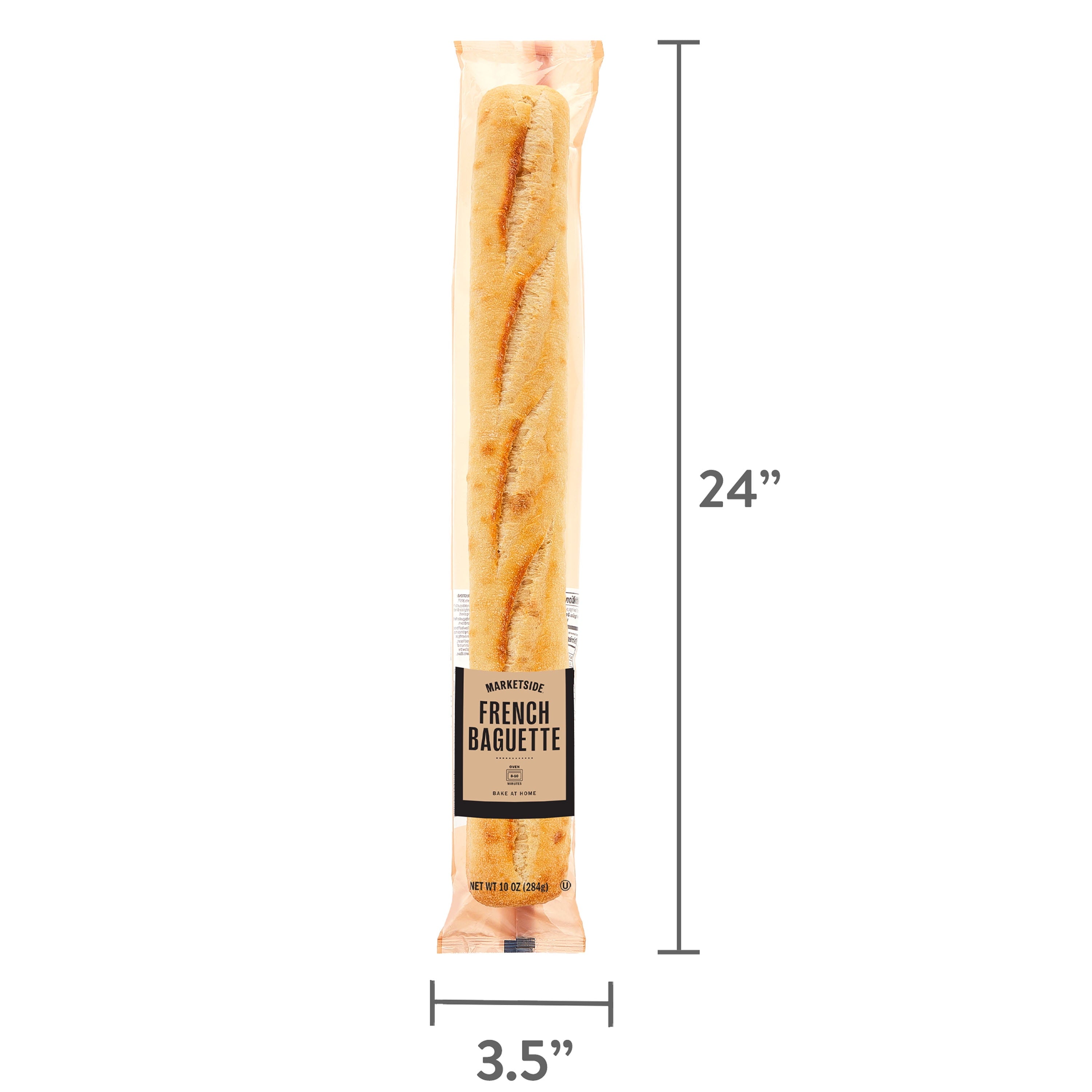 Get the fresh baked taste you crave with the Marketside French Baguette. Enjoy freshly made bread in the comfort of your own home in only minutes. The crispy crust provides a delightful, crunchy contrast to the soft and fluffy, chewy center. This bake-at-home, shelf stable bread can be eaten as a delicious side to a pasta dinner, spread with garlic butter and broiled, made into garlic bread, or used to build delicious bruschetta appetizer. This bread contains wheat. Bring the fresh taste of homemade bread to your kitchen today with the Marketside French Baguette.