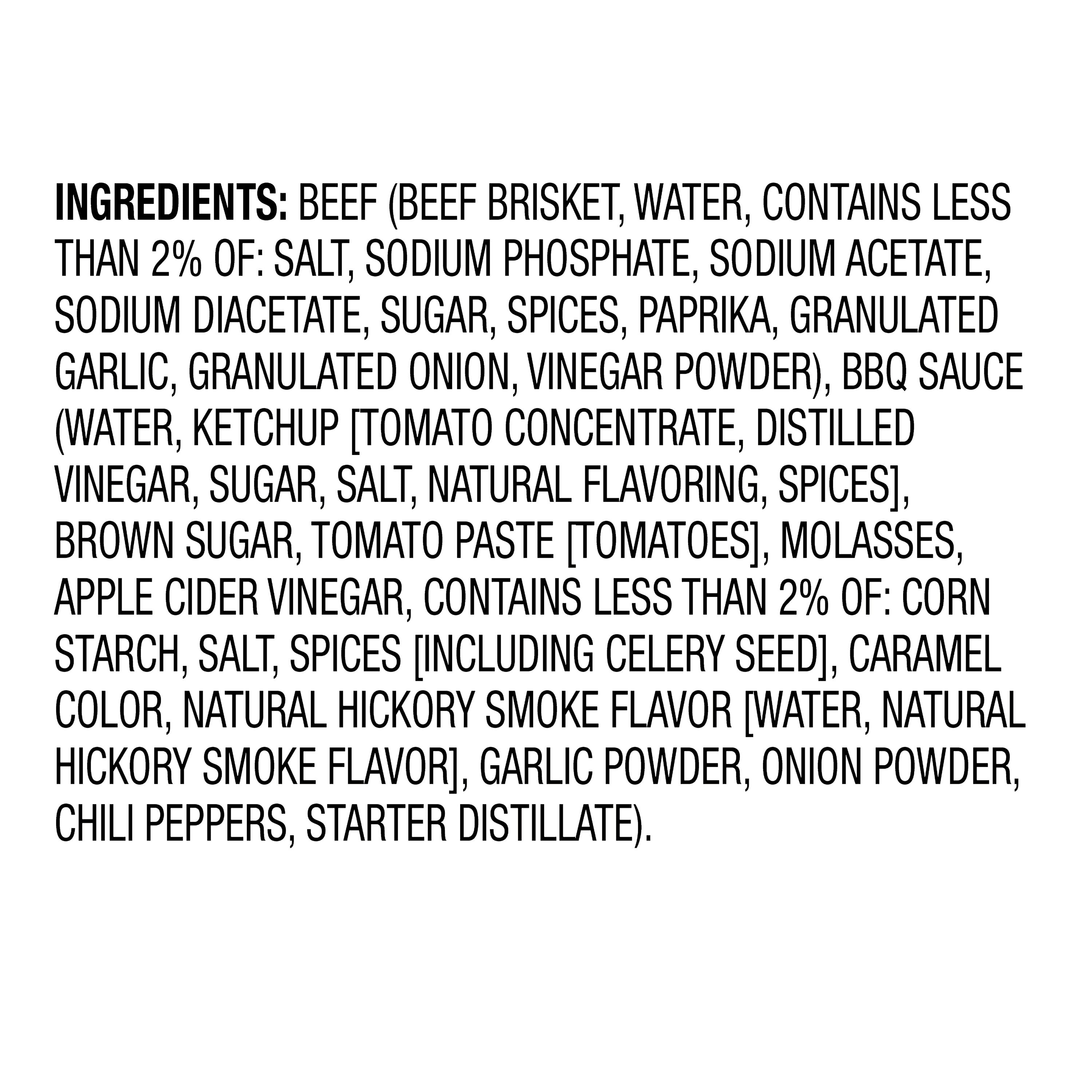 Ingredient Statement: Beef (Beef Brisket, Water, Contains less than 2% of Salt, Sodium Phosphate, Sodium Acetate, Sodium Diacetate, Sugar, Spices, Paprika, Carrageenan (Carrageenan, Xanthan Gum), Granulated Garlic, Granulated Onion, Vinegar Powder) BBQ Sauce: (Water, Ketchup [Tomato Concentrate, Distilled Vinegar, Sugar, Salt, Natural Flavoring, Spices], Brown Sugar, Tomato Paste [Tomatoes], Molasses, Apple Cider Vinegar, Contains less than 2% of Corn Starch, Salt, Spices (Including Celery Seed), Caramel Color, Natural Hickory Smoke Flavor (Water, Natural Smoke flavor), Garlic Powder, Onion Powder, Chili Peppers, Starter Distillate)./div>