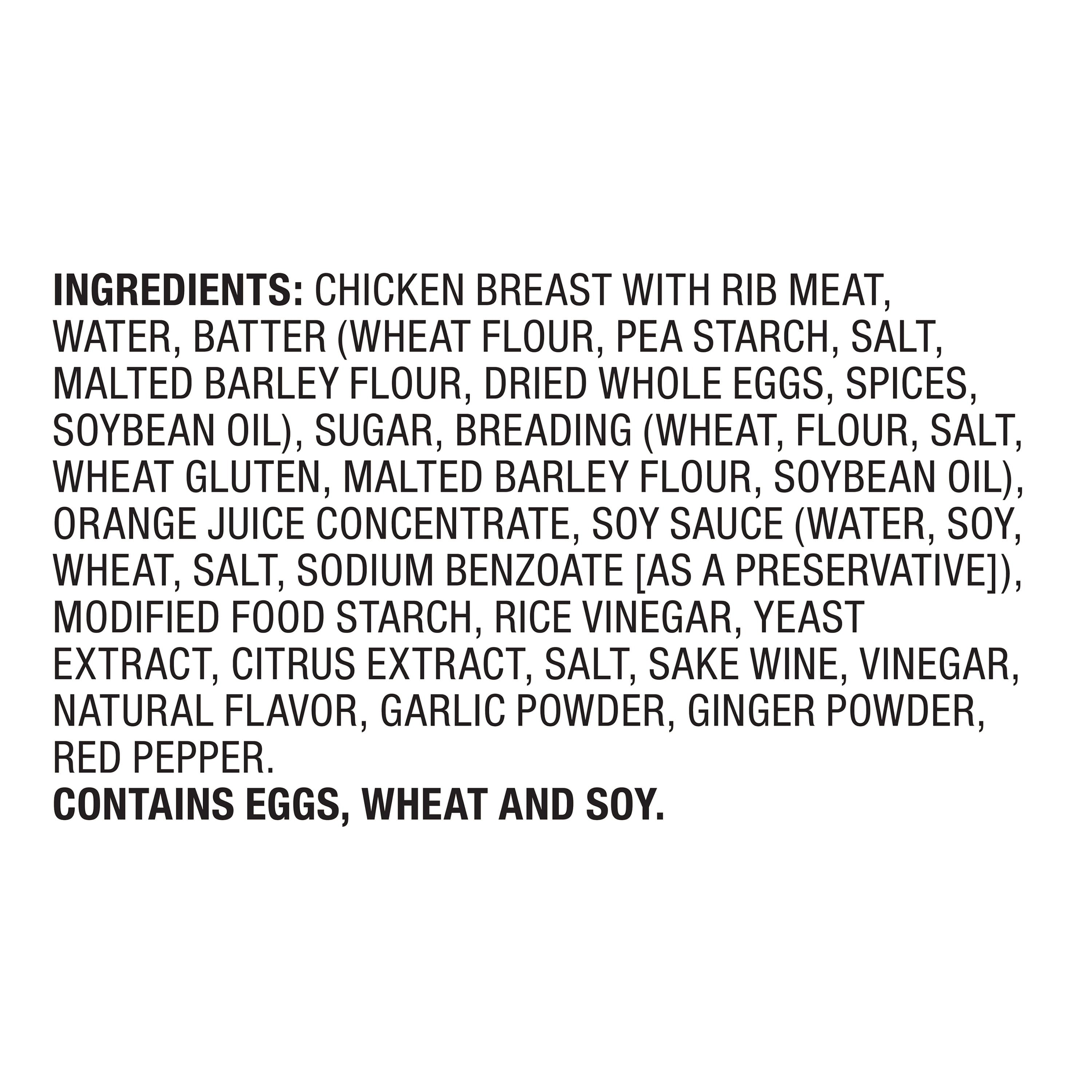 INGREDIENTS: CHICKEN BREASTS WITH RIB MEAT, WATER, BATTER (WHEAT FLOUR, PEA STARCH, SALT, MALTED BARLEY FLOUR, DRIED WHOLE EGGS, SPICES, SOYBEAN OIL), SUGAR BREADING (WHEAT, FLOUR, SALT, WHEAT GLUTEN, MALTED BARLEY FLOUR, SOYBEAN OIL), ORANGE JUICE CONCENTRATE, SOY SAUCE (WATER, SOYBEANS, WHEAT, SALT, SODIUM BENZOATE [AS A PERSERVATIVE]), MODIFIED FOOD STARCH, RICE VINEGAR, NATURAL FLAVOR, GARLIC POWDER, GINGER POWDER, RED BELL PEPPER./div>