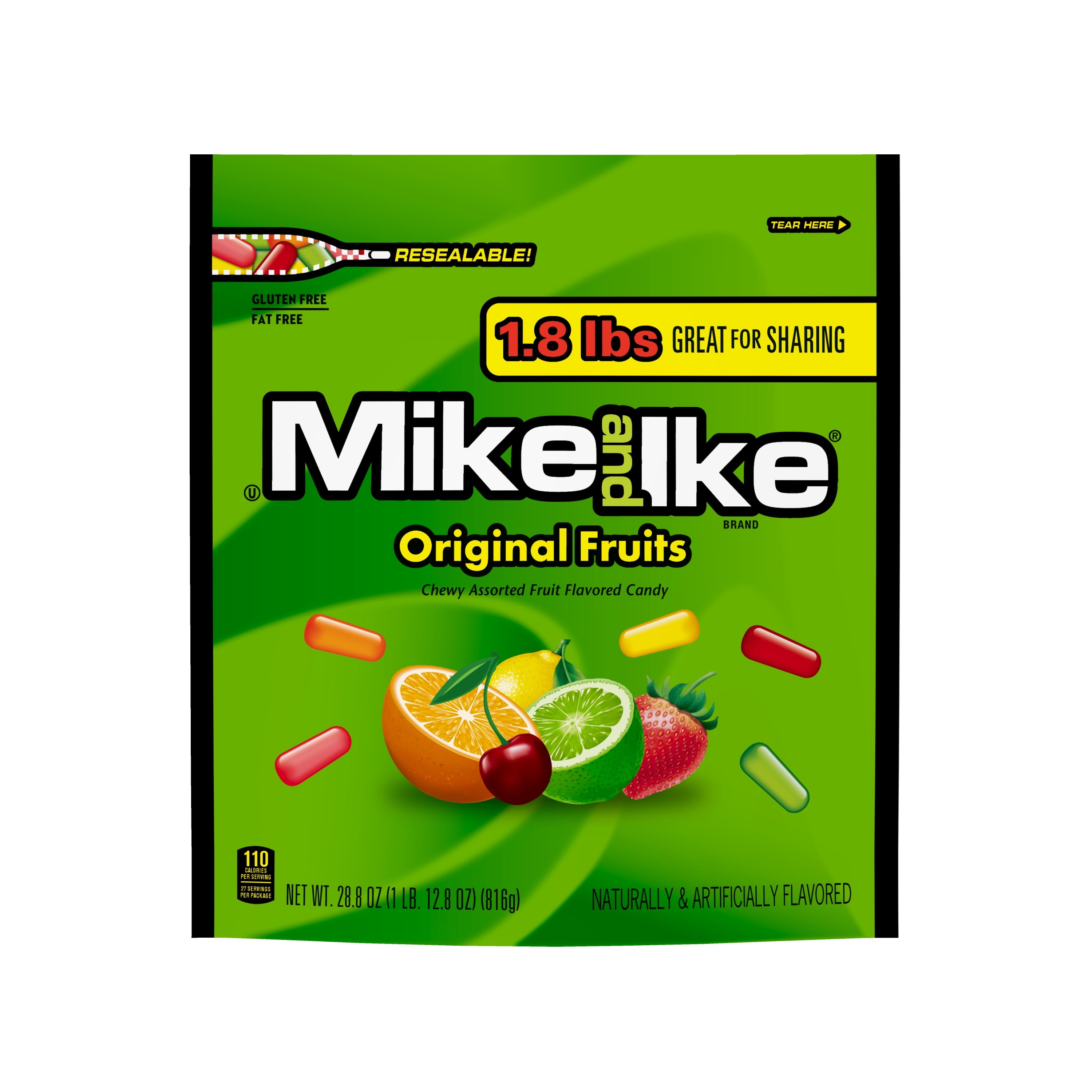 - 28.8 ounce resealable bag of MIKE AND IKE Original Fruits chewy fruit flavored candy.