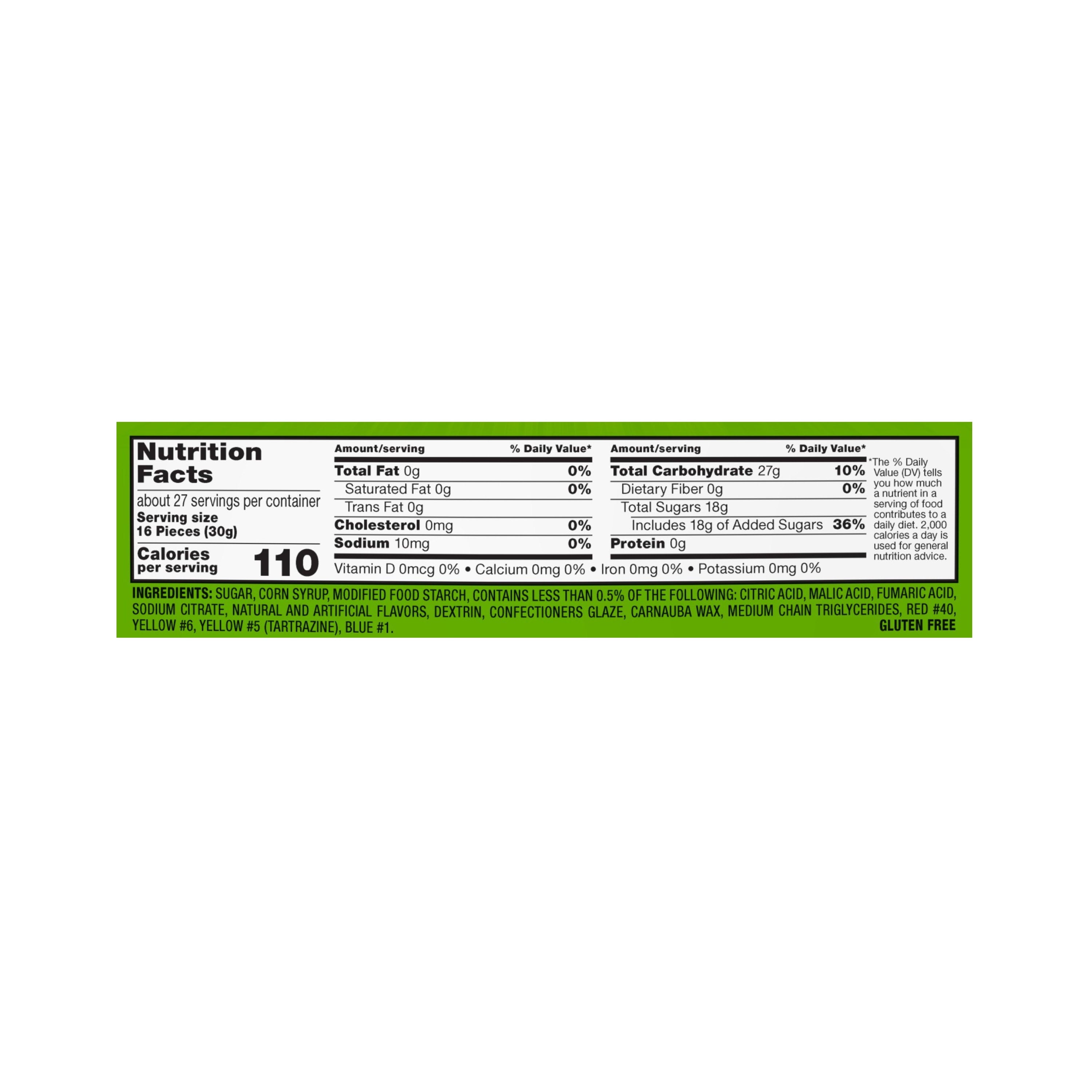 SUGAR, CORN SYRUP, MODIFIED FOOD STARCH, CONTAINS LESS THAN 0.5% OF THE FOLLOWING: CITRIC ACID, MALIC ACID, FUMARIC ACID, SODIUM CITRATE, NATURAL AND ARTIFICIAL FLAVORS, DEXTRIN, CONFECTIONERS GLAZE, CARNAUBA WAX, MEDIUM CHAIN TRIGLYCERIDES, RED #40, YELLOW #6, YELLOW #5 (TARTRAZINE), BLUE #1./div>