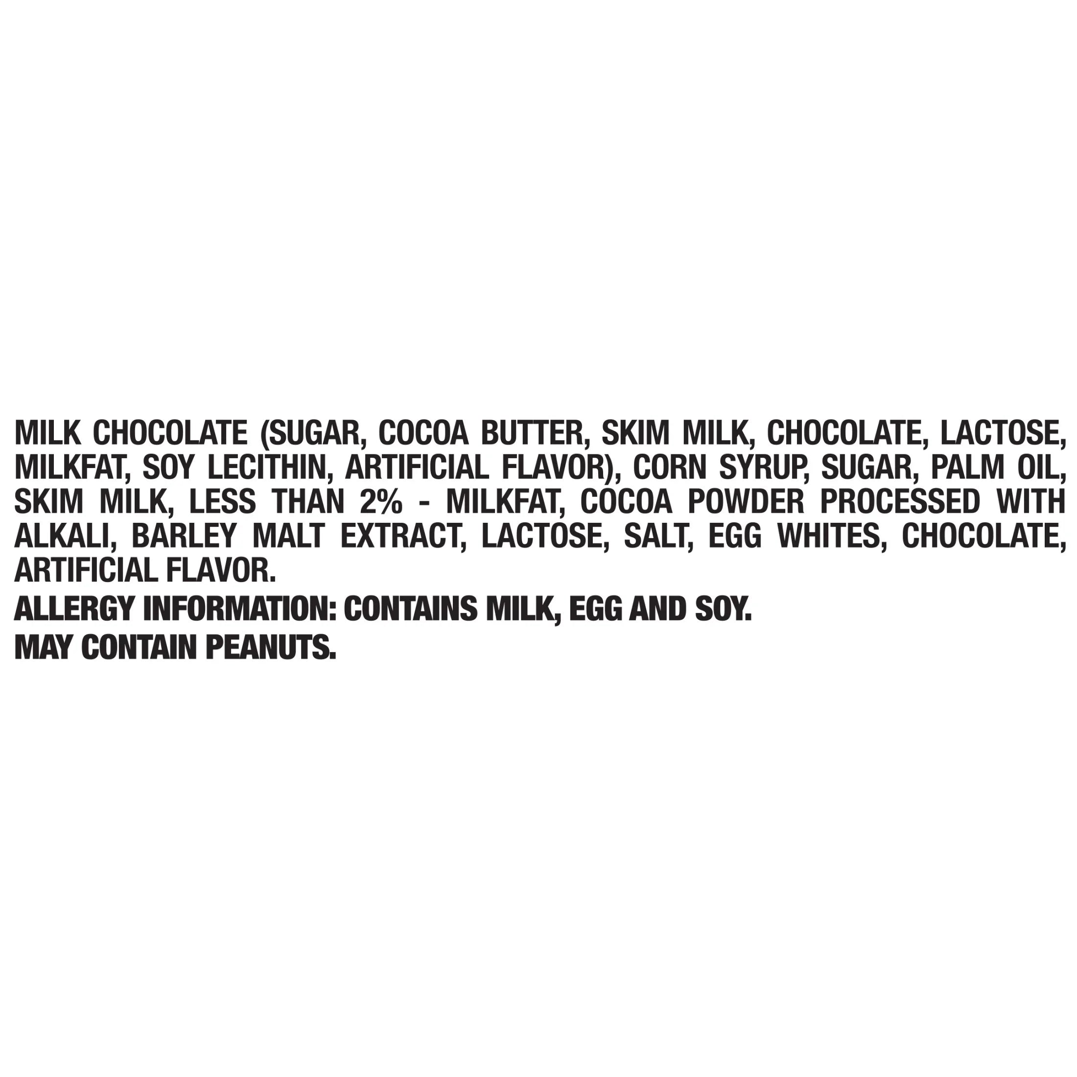 INGREDIENTS: MILK CHOCOLATE (SUGAR, COCOA BUTTER, SKIM MILK, CHOCOLATE, LACTOSE, MILKFAT, SOY LECITHIN, ARTIFICIAL FLAVOR), CORN SYRUP, SUGAR, PALM OIL, SKIM MILK, LESS THAN 2% - MILKFAT, COCOA POWDER PROCESSED WITH ALKALI, BARLEY MALT EXTRACT, LACTOSE, SALT, EGG WHITES, CHOCOLATE, ARTIFICIAL FLAVOR./div>