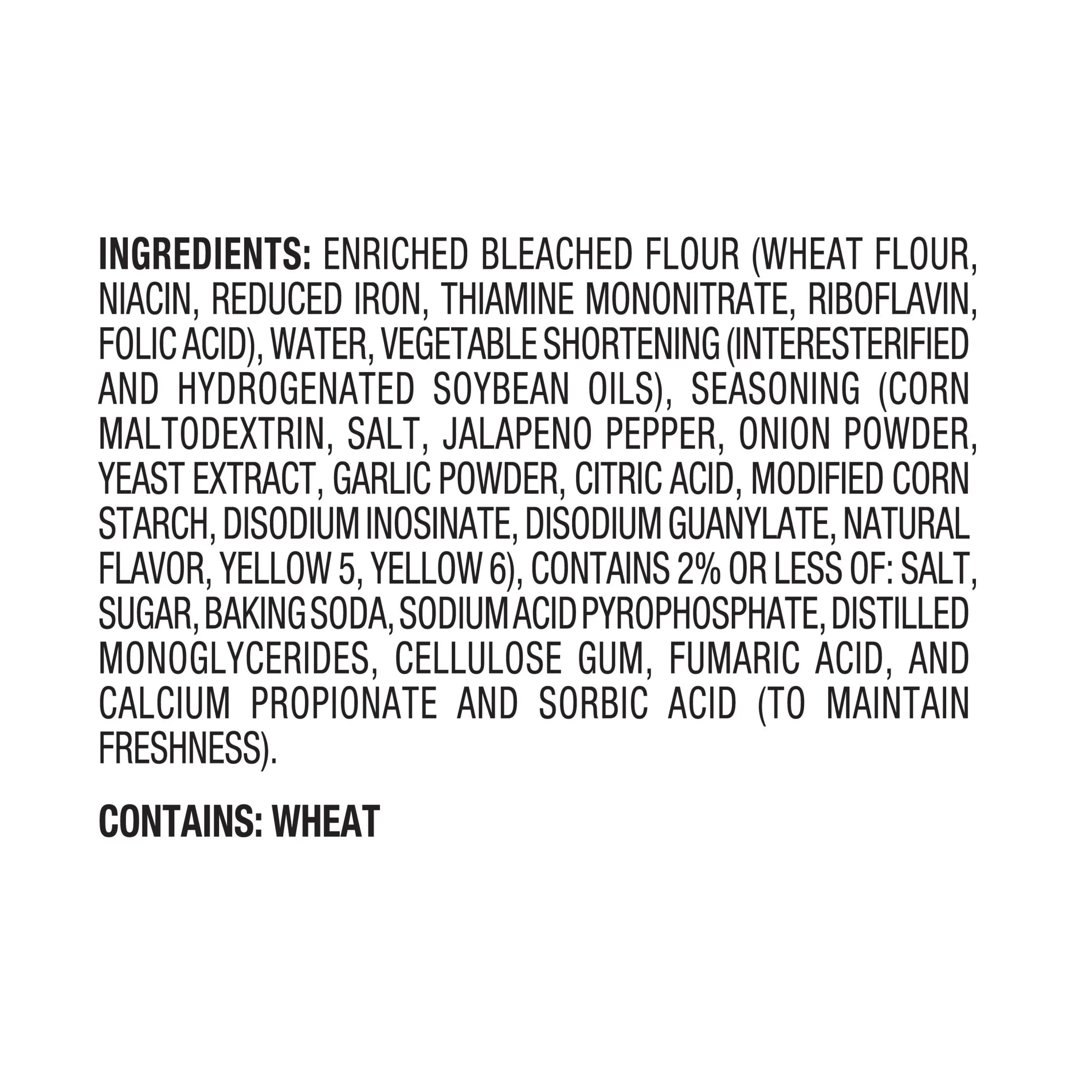 Enriched bleached flour (wheat flour, niacin, reduced iron, thiamine mononitrate, riboflavin, folicacid), water, vegetable shortening (interesterified and hydrogenated soybean oils), seasoning (corn maltodextrin, salt, jalapeno pepper, onion powder, yeast extract, garlic powder, citric acid, modified corn starch, disodium inosinate, disodium guanylate, natural flavor, yellow 5, yellow 6), contains 2% or less of: salt, sugar, baking soda, sodiumacid pyrophosphate, distilled monoglycerides, cellulose gum, fumaric acid, and calcium propionate and sorbic acid (to maintain freshness). Contains: Wheat/div>