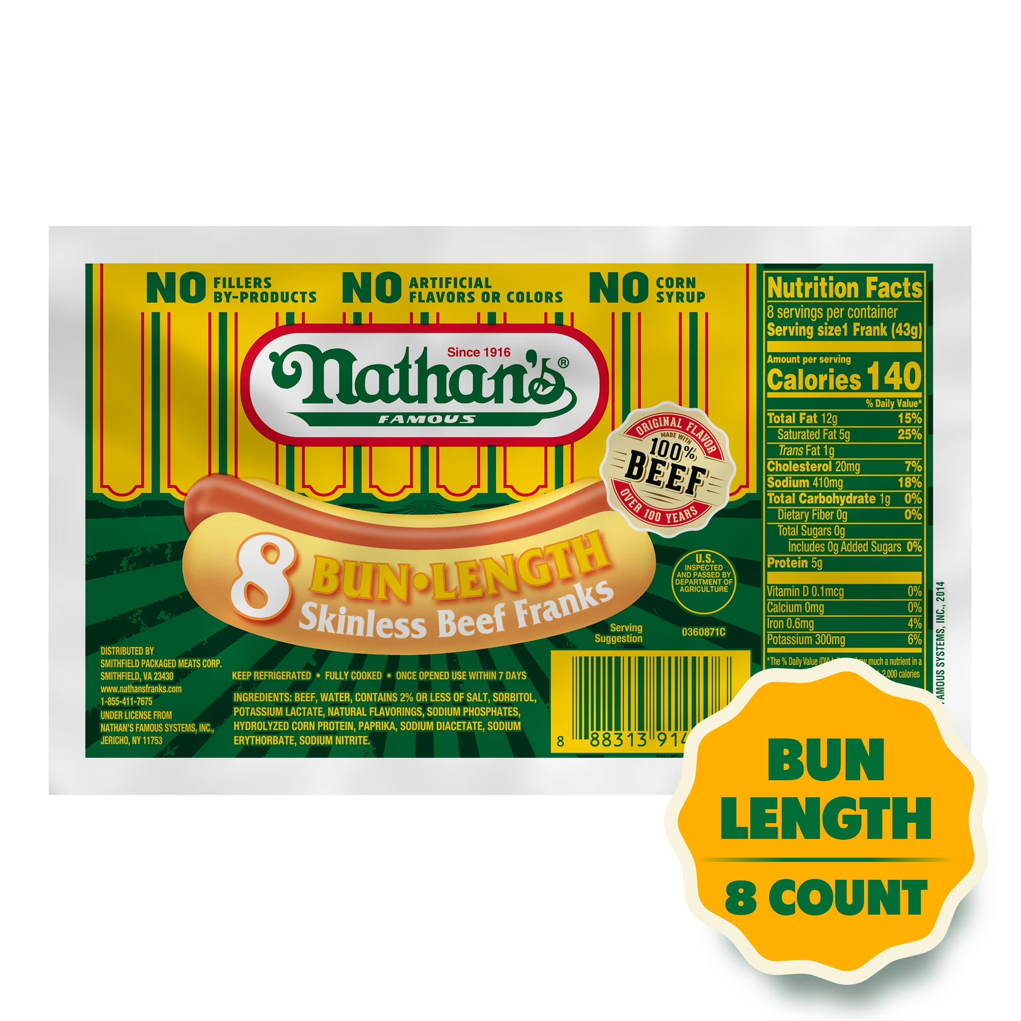 - Nathan's Famous Skinless All Beef Hot Dogs, Bun Length, 12 oz