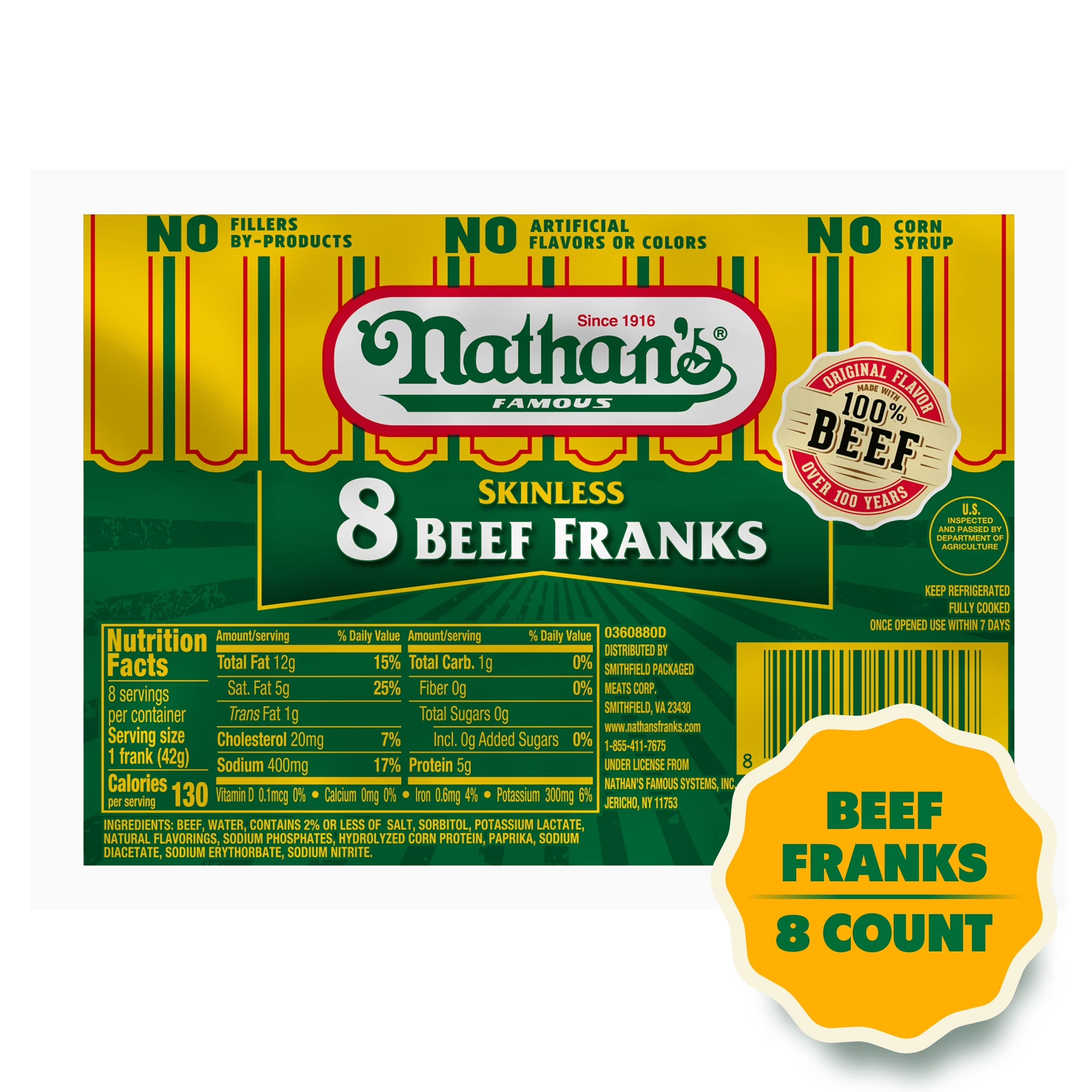 - One 12 oz pack of eight refrigerated, fully cooked Nathan's Famous Skinless Beef Franks